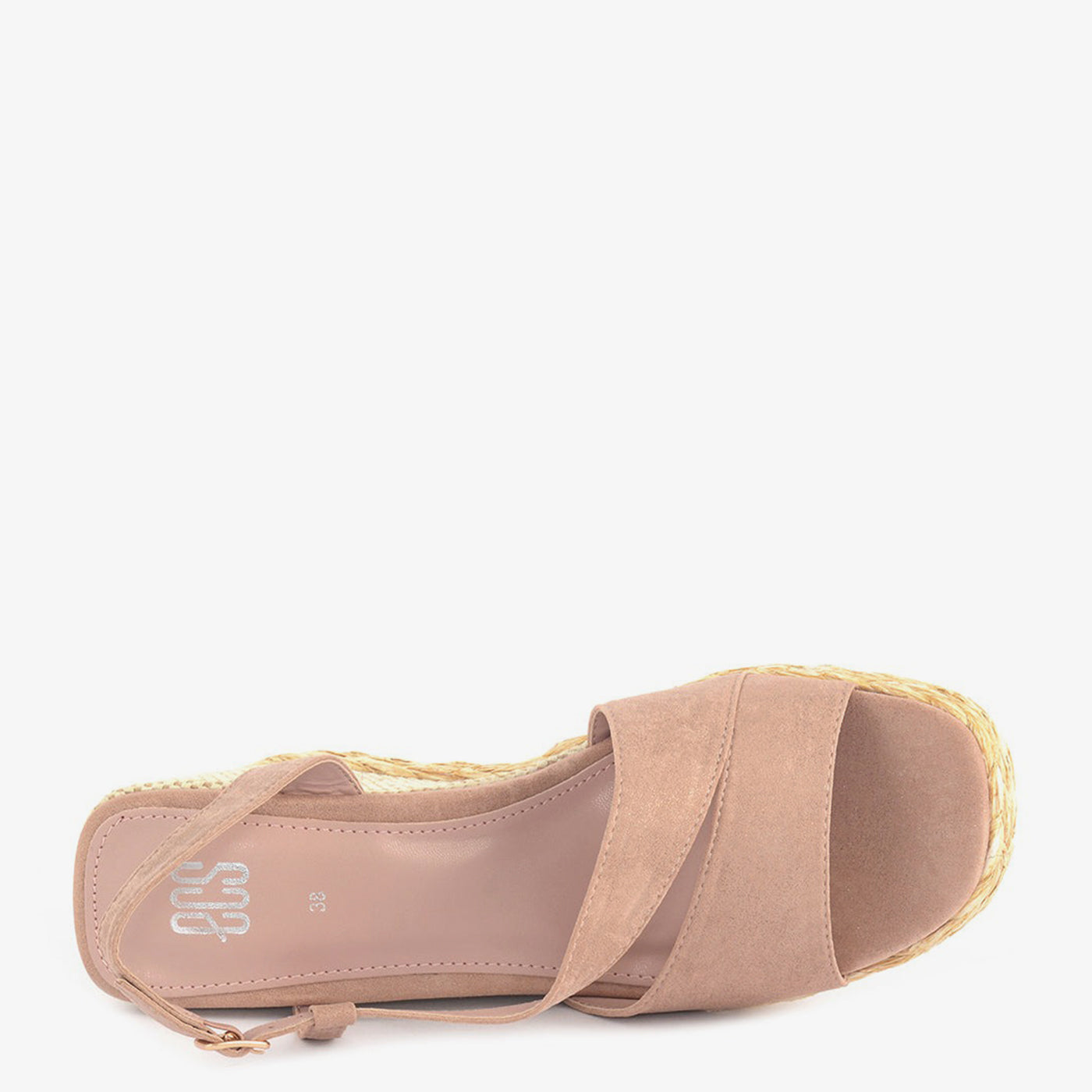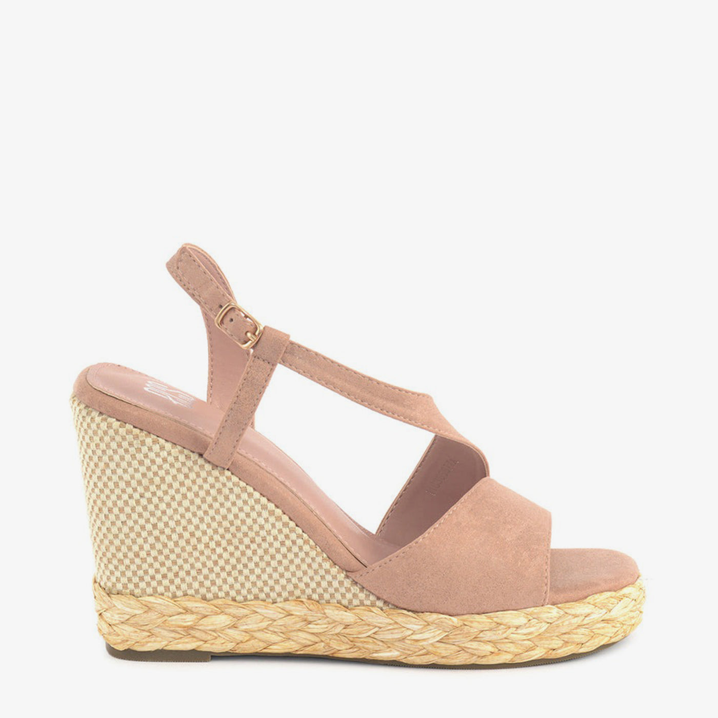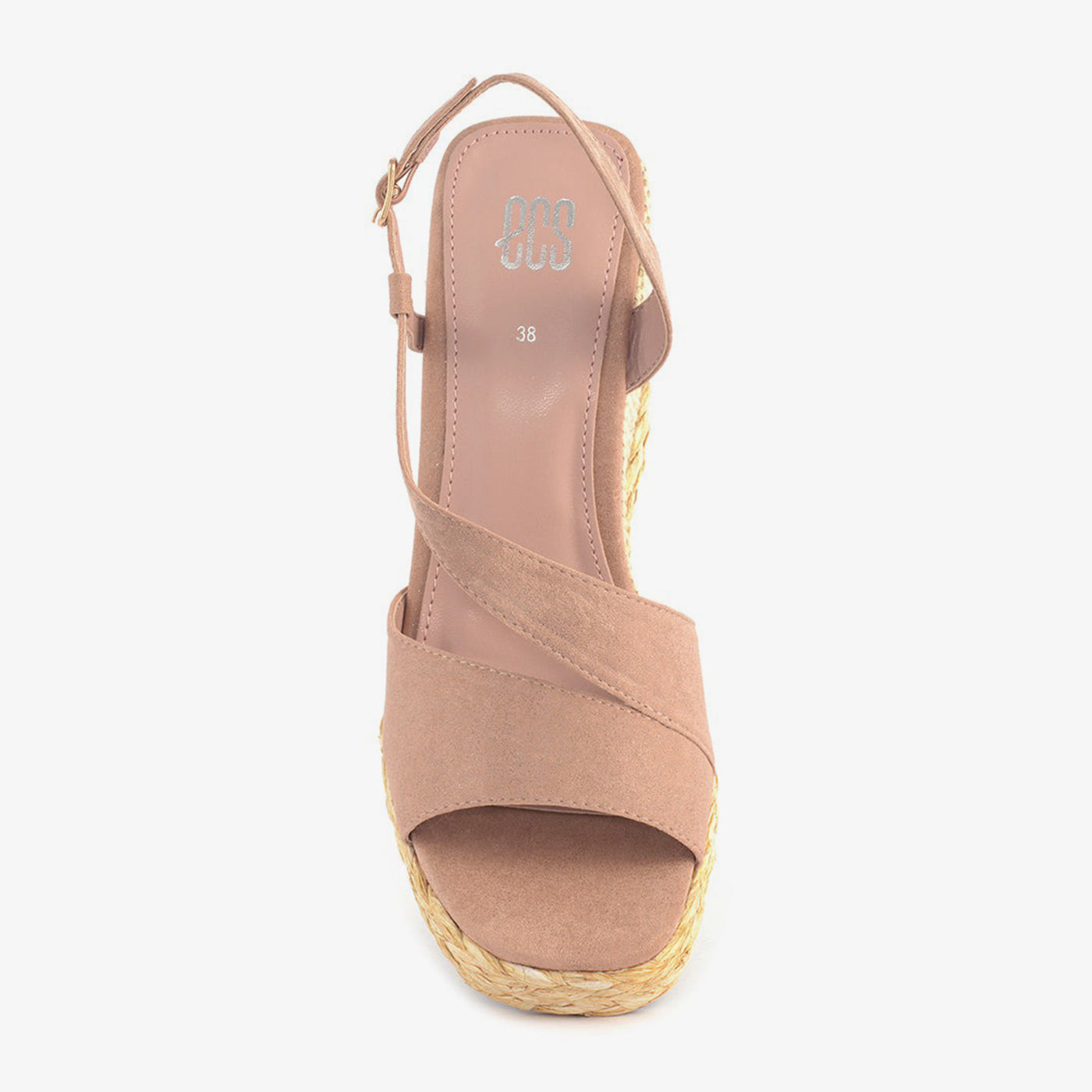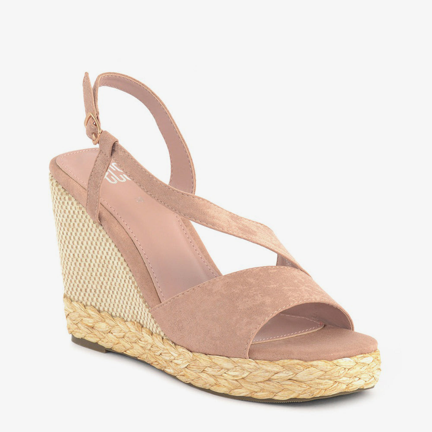 Wedge sandals with woven jute accents on the platform and heel. The suede-like straps offer a rustic yet polished look, ideal for daytime outings. These sandals blend comfort with natural-inspired style.