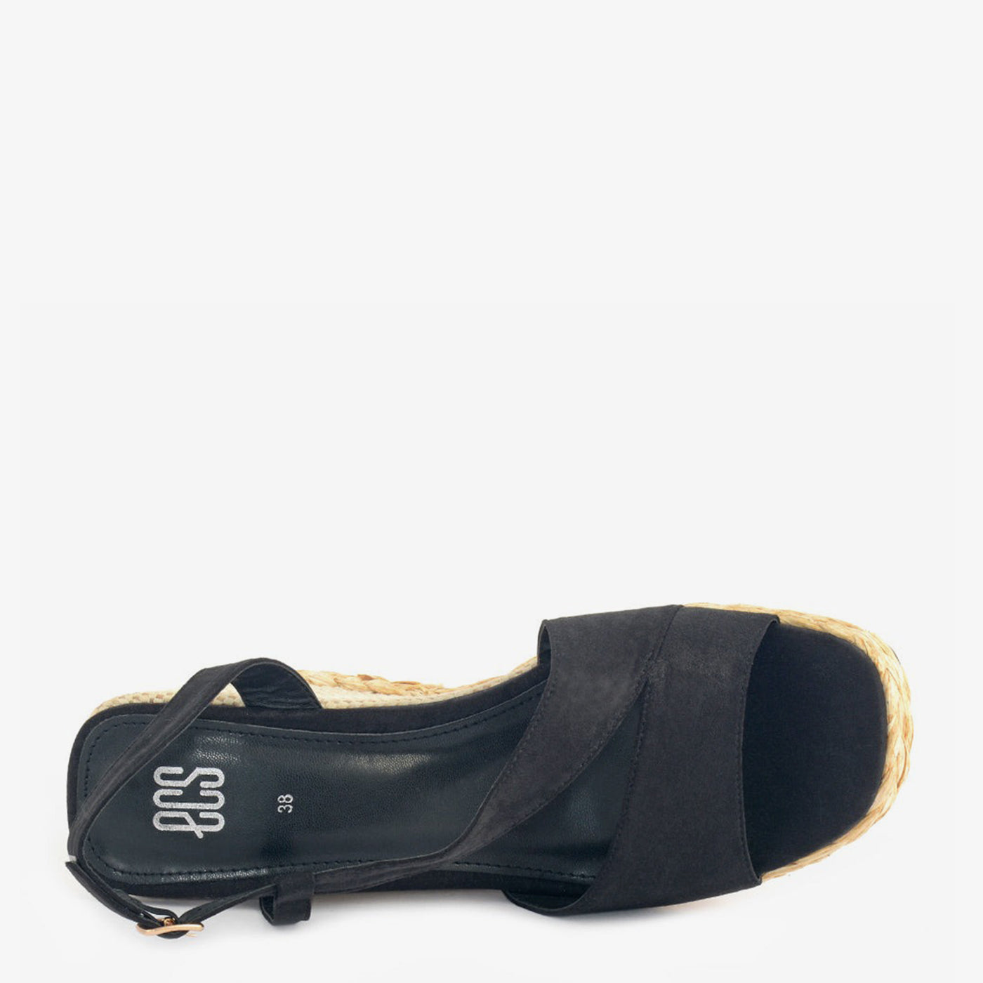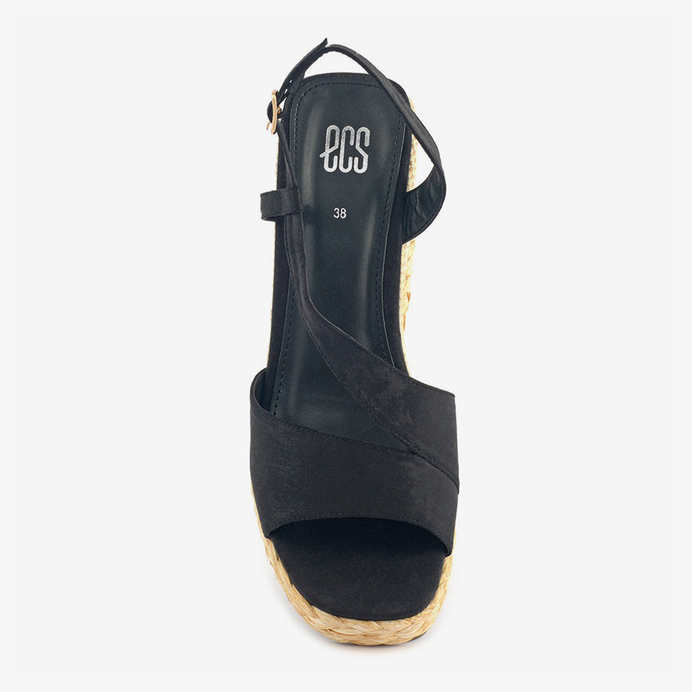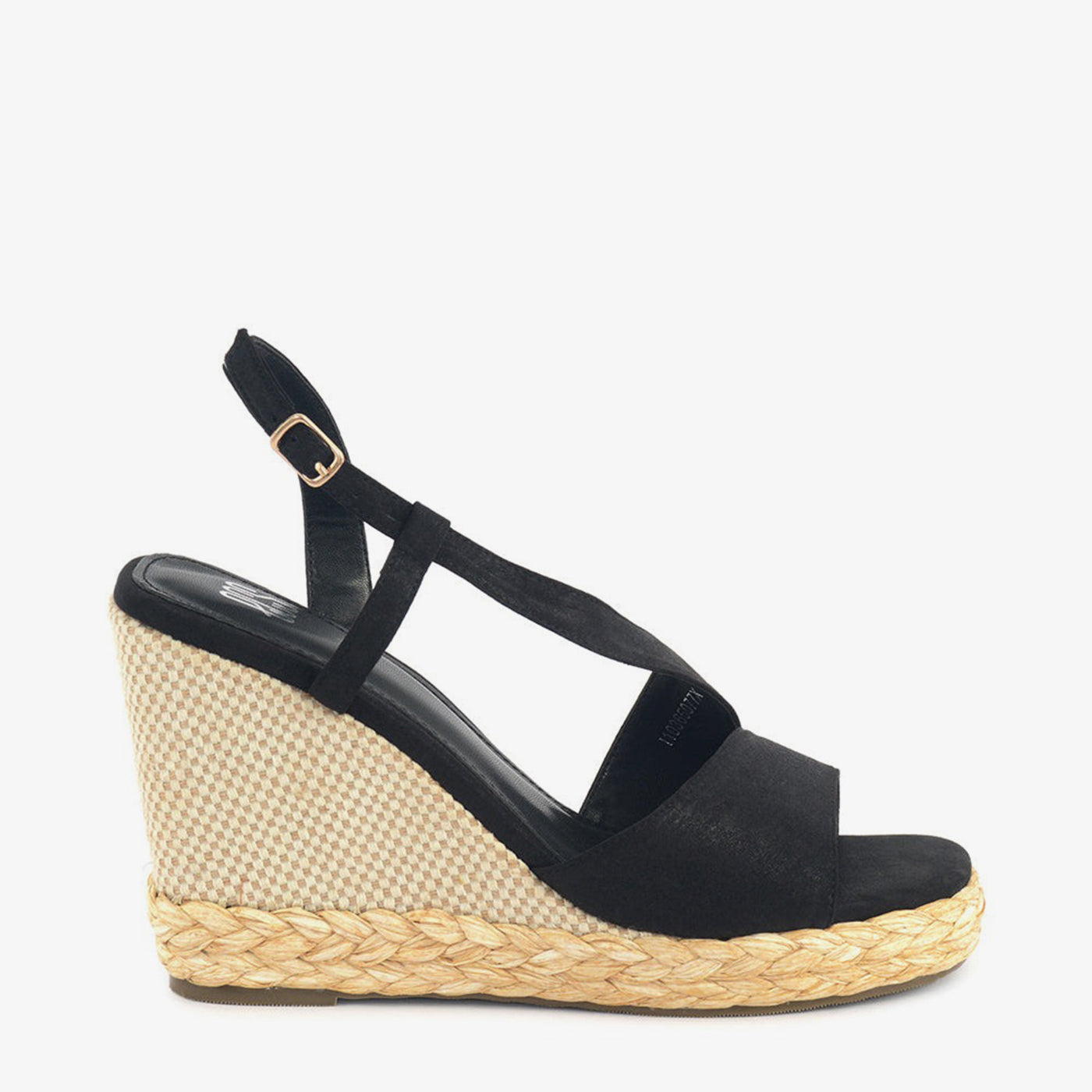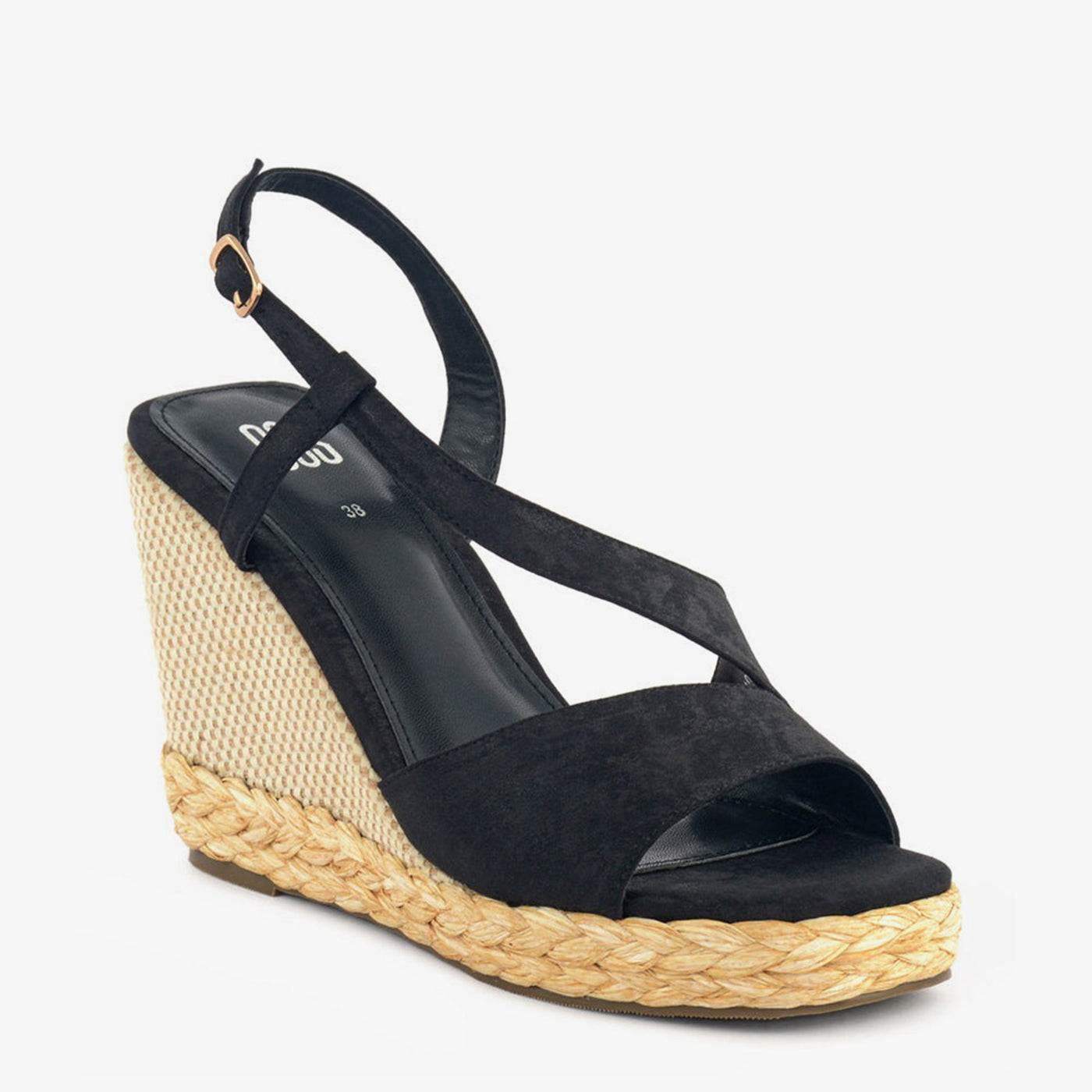 Wedge sandals with woven jute accents on the platform and heel. The suede-like straps offer a rustic yet polished look, ideal for daytime outings. These sandals blend comfort...