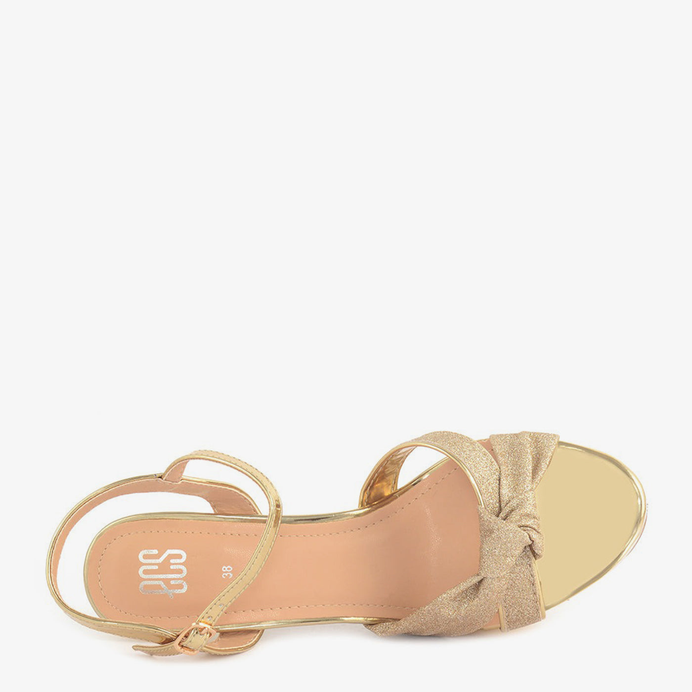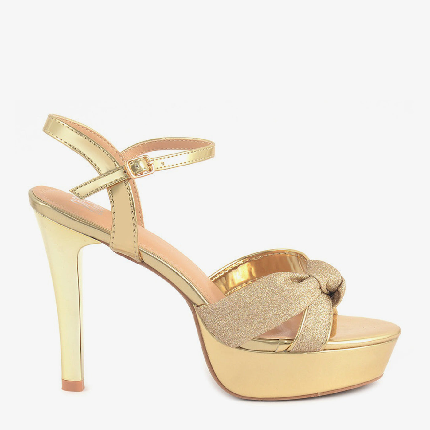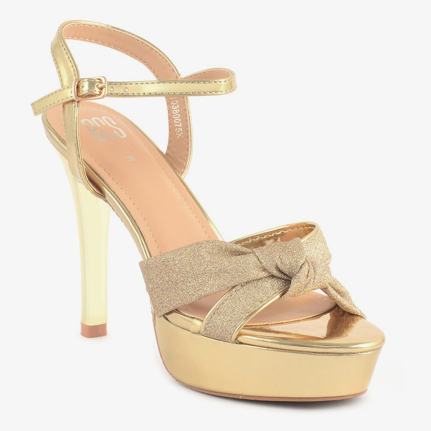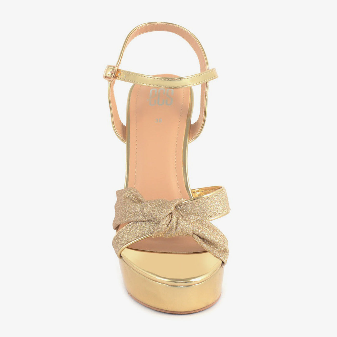 This high platform sandal stands tall with a gleaming base and a soft knotted shimmer strap. The ankle buckle adds a secure touch for long hours of festive wear.