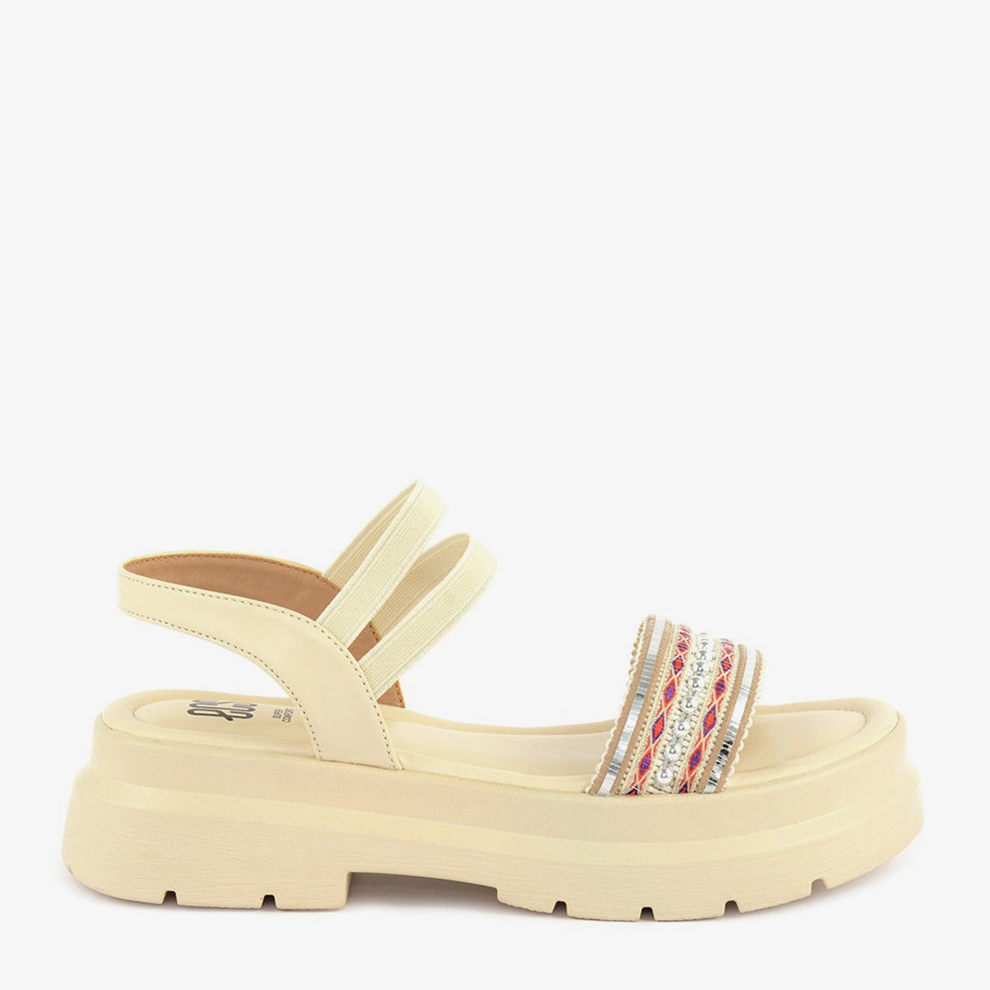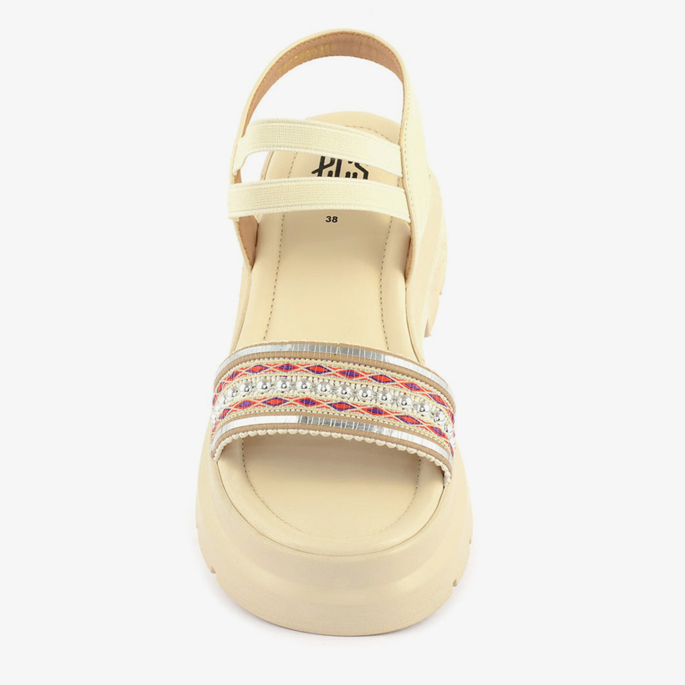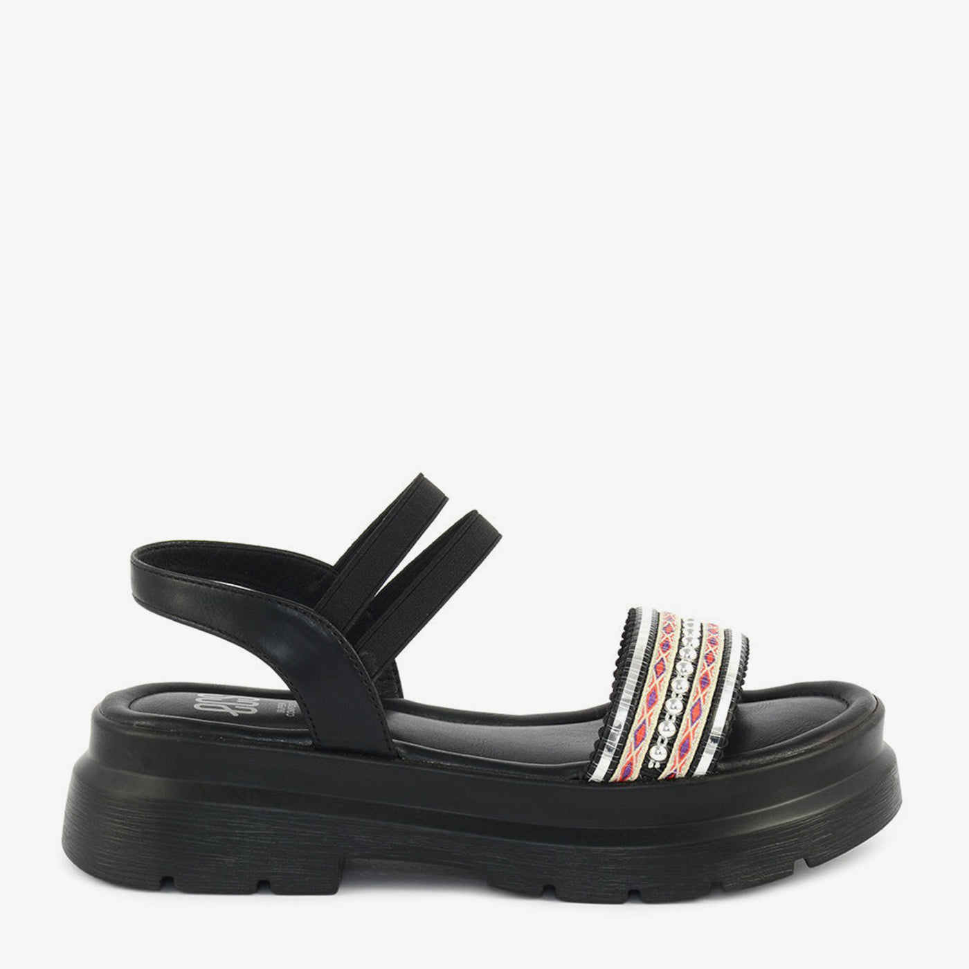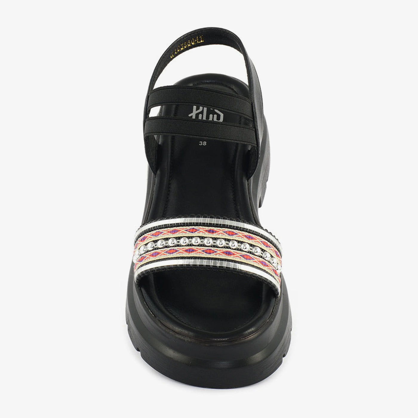 Bold black sandals with a chunky sole and intricate beadwork on the front strap. Elastic straps ensure a snug fit and easy wear. These sandals blend comfort and statement style for any casual occasion.