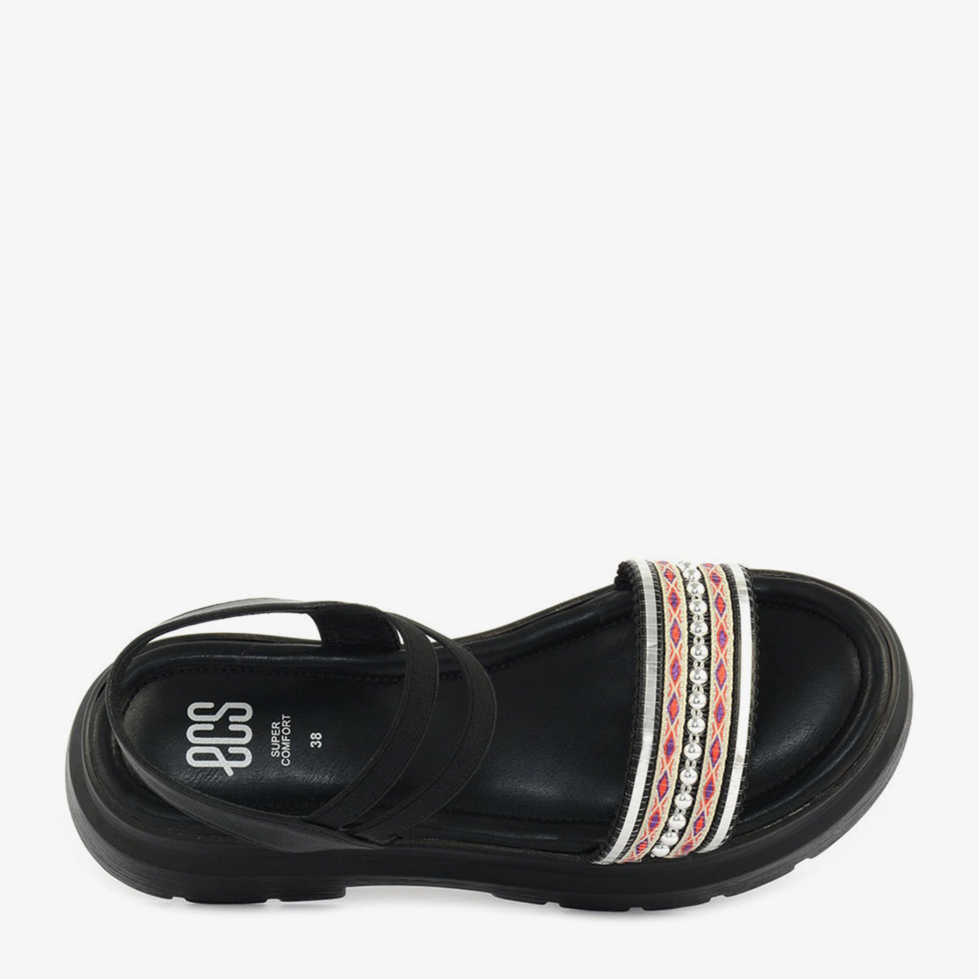 Bold black sandals with a chunky sole and intricate beadwork on the front strap. Elastic straps ensure a snug fit and easy wear. These sandals blend comfort and...