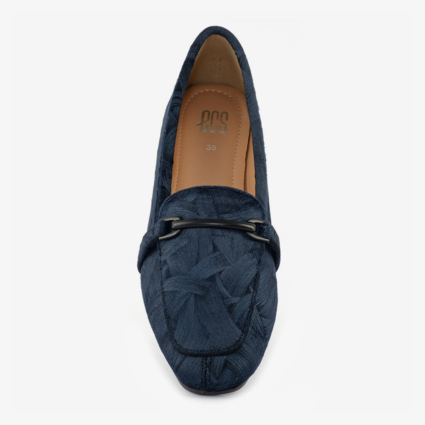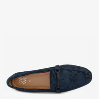 Subtle yet refined, the Indigo Trim loafer offers a unique textured fabric with a sleek metal bar accent. Its low profile and timeless design make it a modest wardrobe staple.