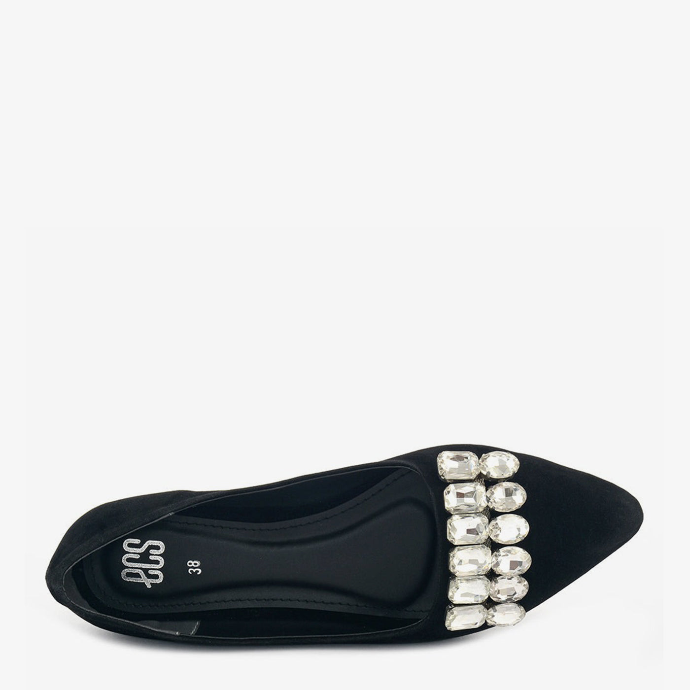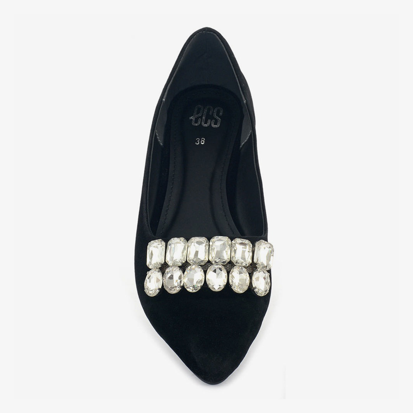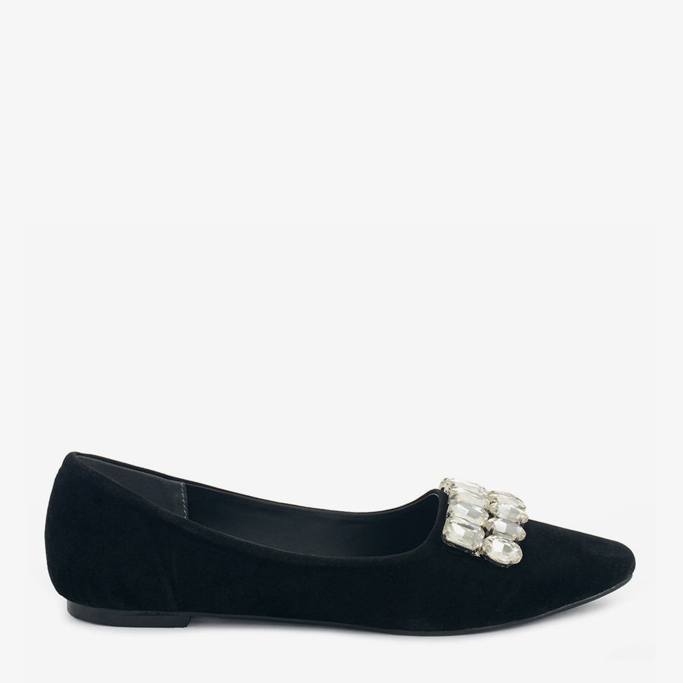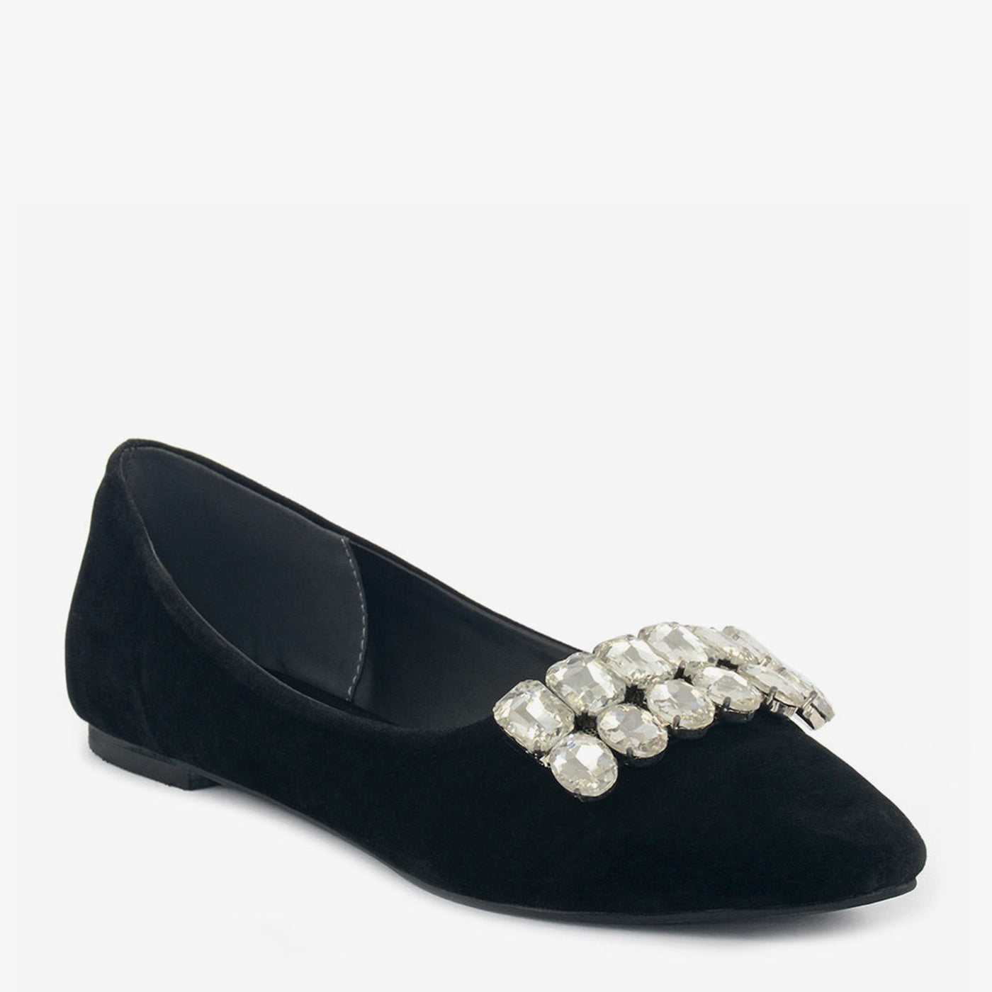 Graceful and striking, the Midnight Shine flat features a deep black velvet finish and a cluster of crystal embellishments across the vamp, creating an elegant yet modest silhouette.