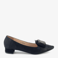 Sophisticated with a heritage edge, the Glenmore Buckle Coat Pump features a classic plaid texture, almond toe, and a statement embellished buckle atop a structured bow. A smart option for elevating everyday or formal ensembles.