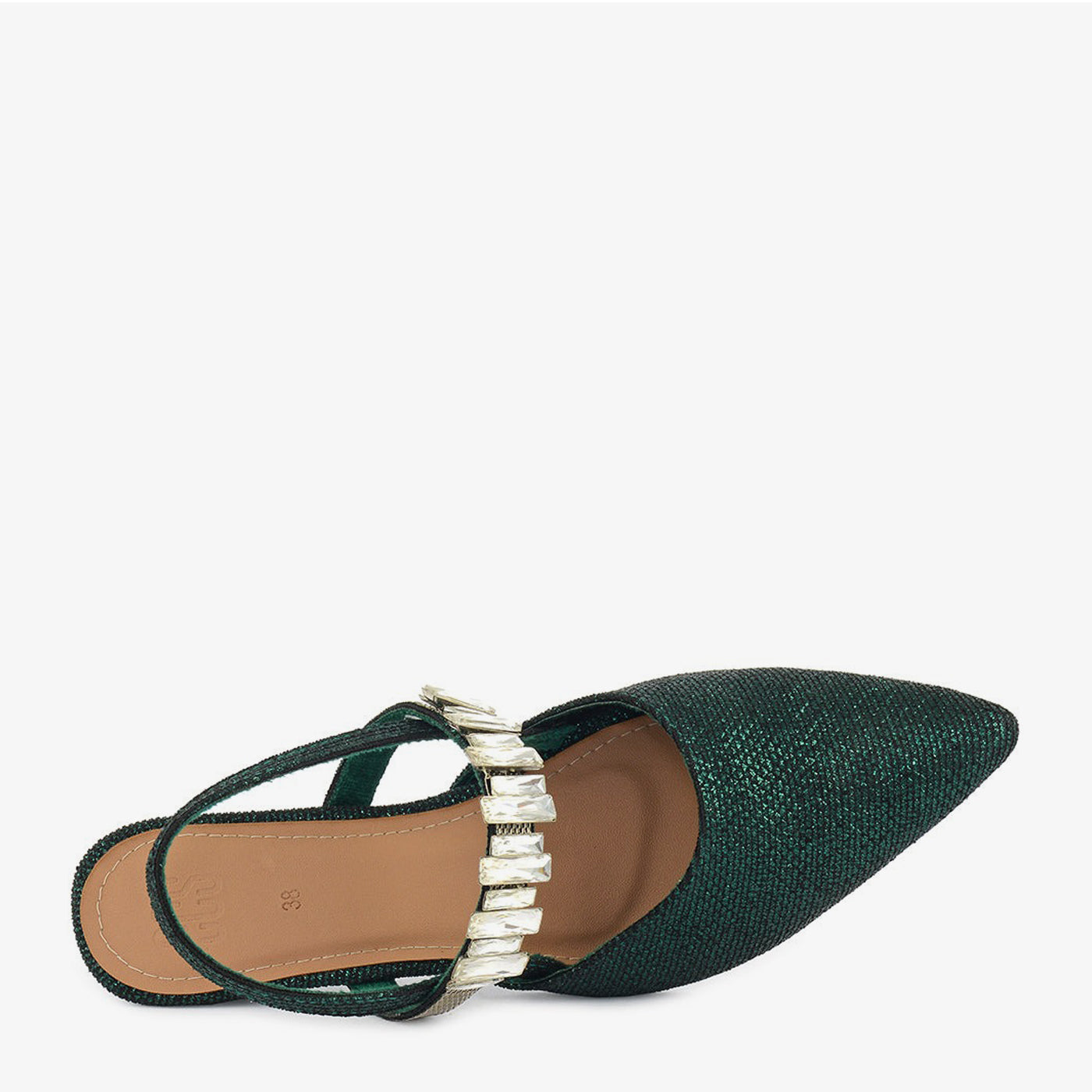 A striking pointed-toe pump in a deep emerald green glittery material. It features a unique ankle strap embellished with rectangular crystals and a slender, kitten-style heel, offering a touch...