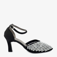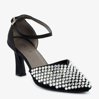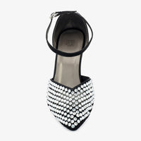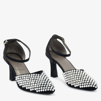 These exquisite shoes are designed for dazzling elegance, featuring a pointed-toe silhouette adorned with shimmering crystal or diamante embellishments that catch the light with every movement. They include a delicate ankle strap for a secure fit and a slender high heel, perfect for formal occasions.