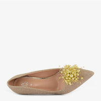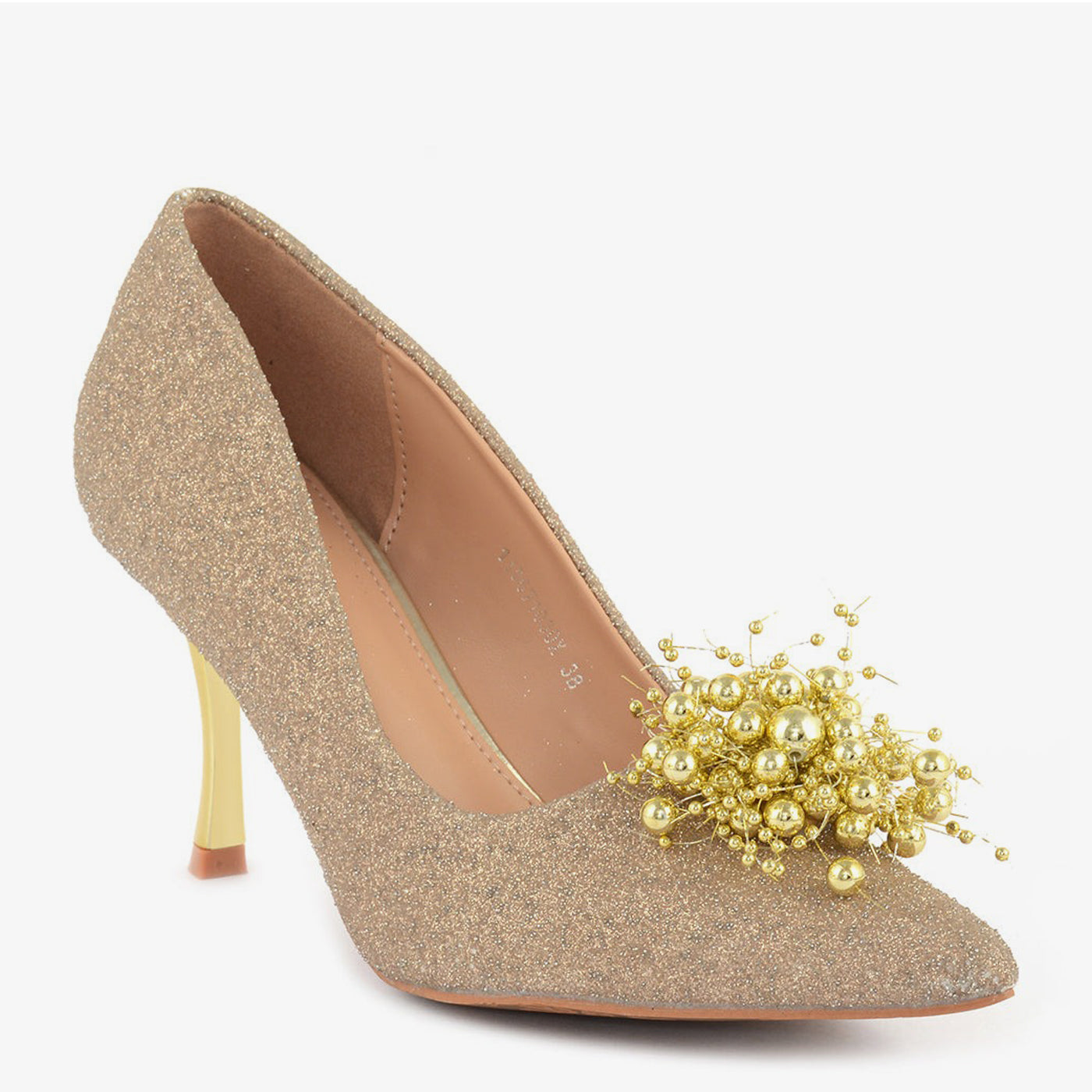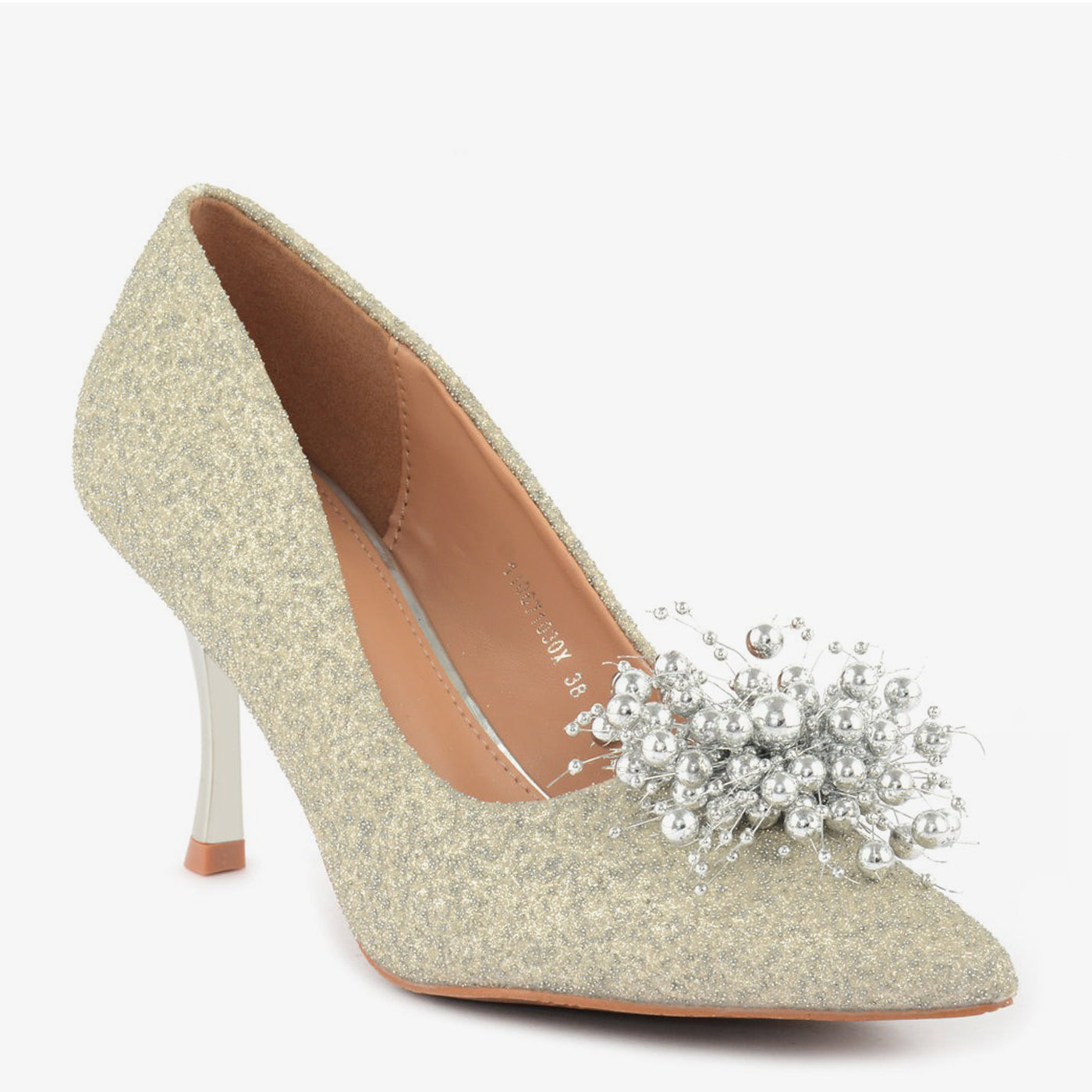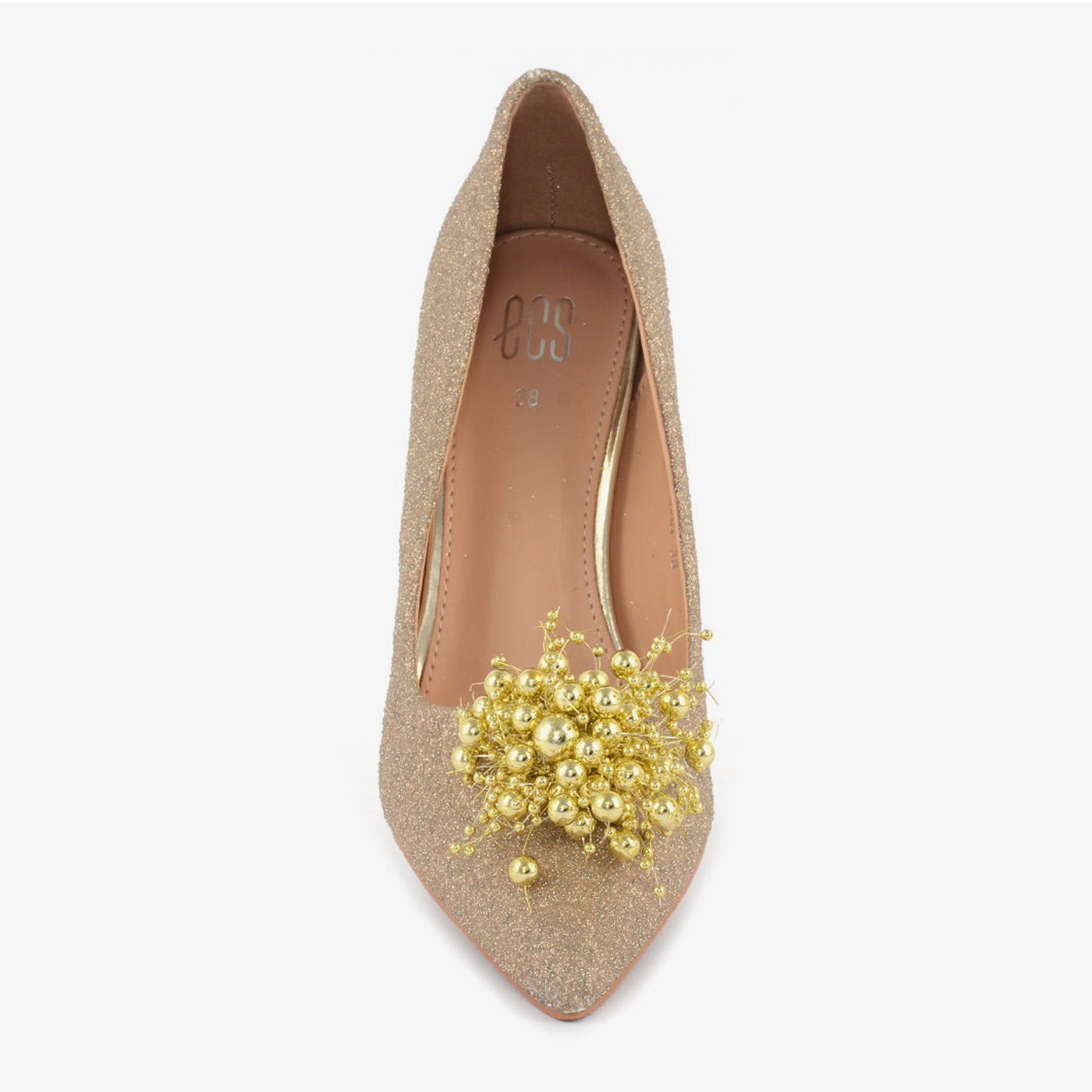 A standout bridal heel featuring a glitter finish and an ornate golden bead arrangement at the toe. Designed for brides seeking unique statement flair.