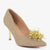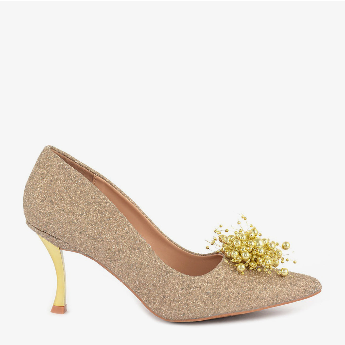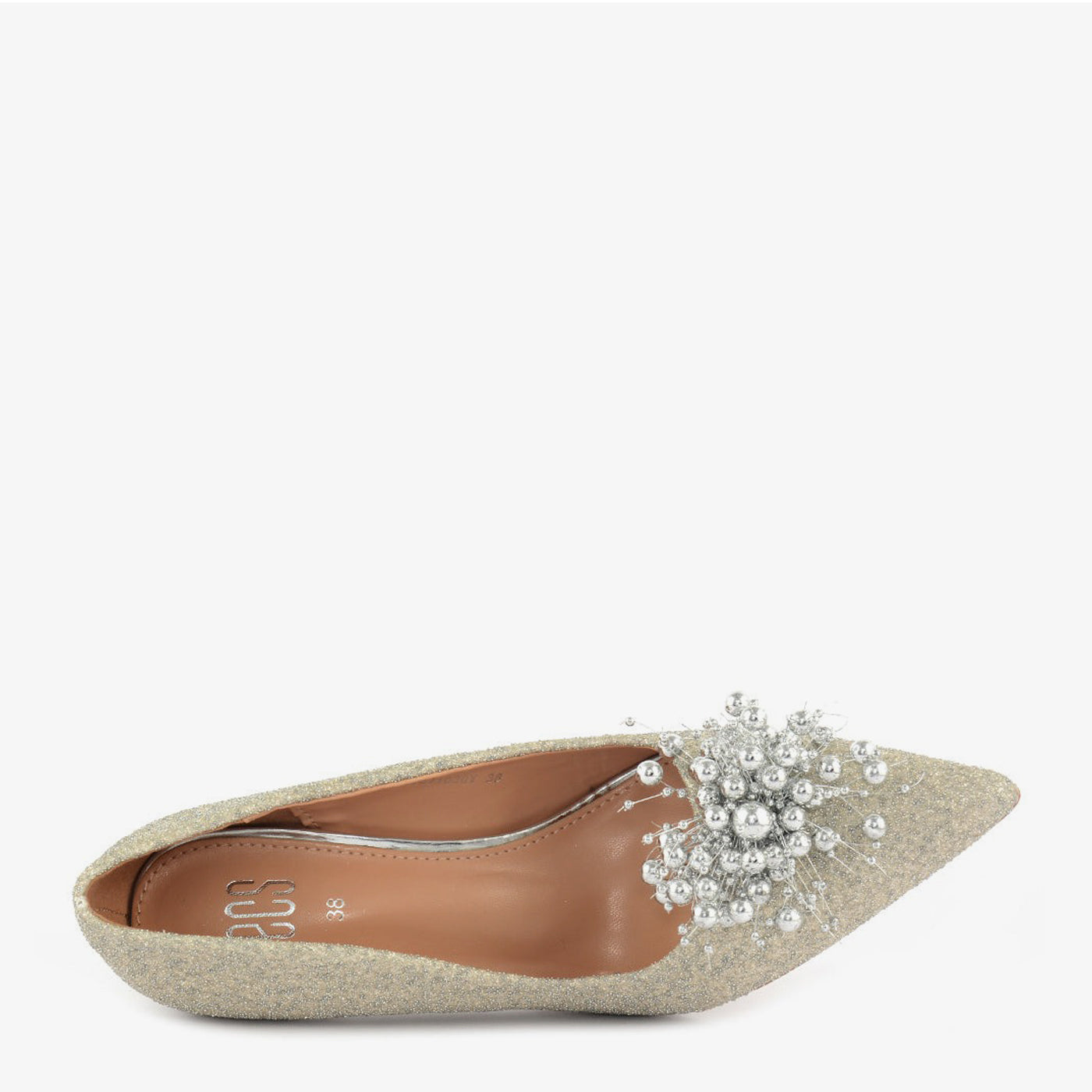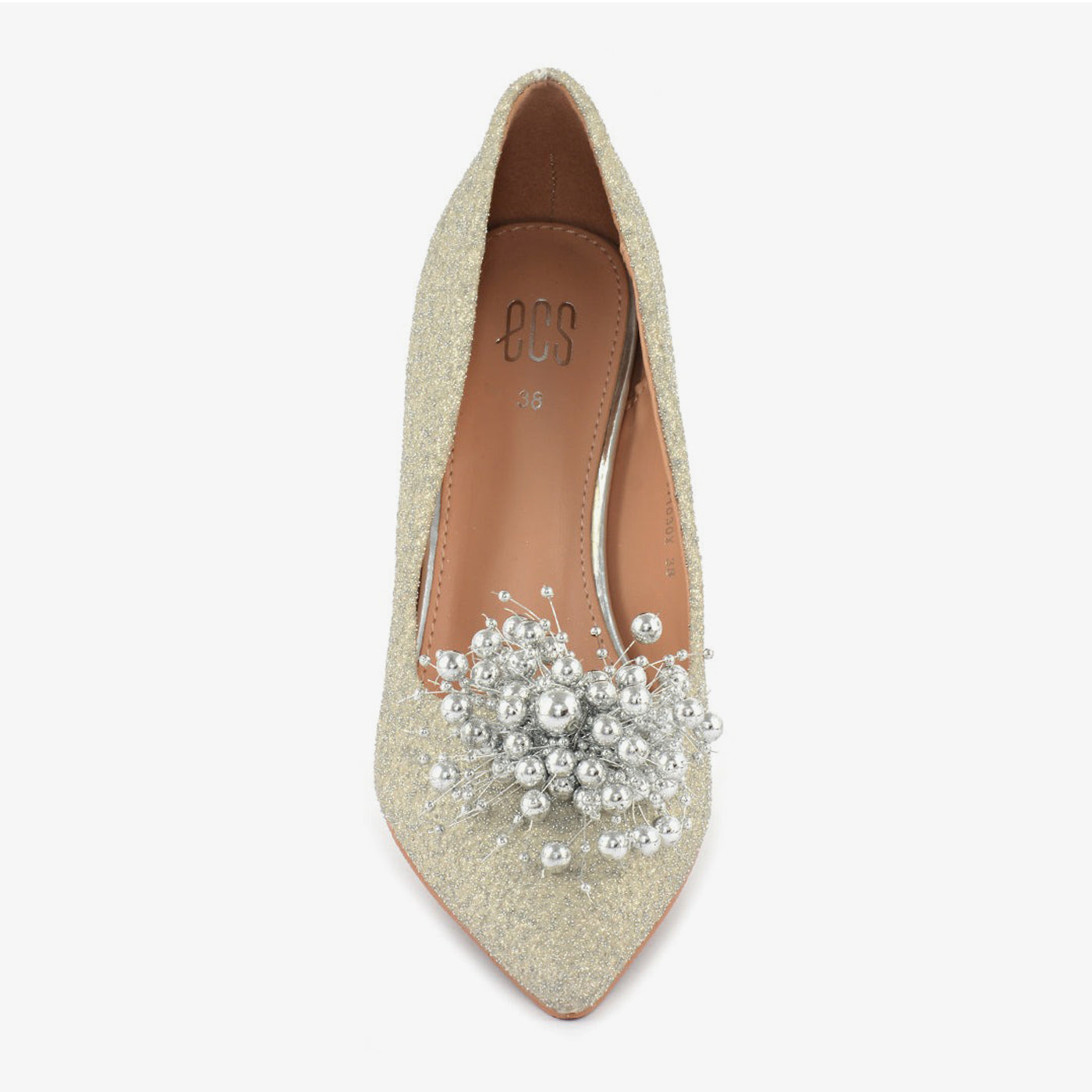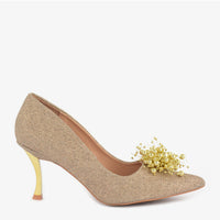 A standout bridal heel featuring a glitter finish and an ornate golden bead arrangement at the toe. Designed for brides seeking unique statement flair.