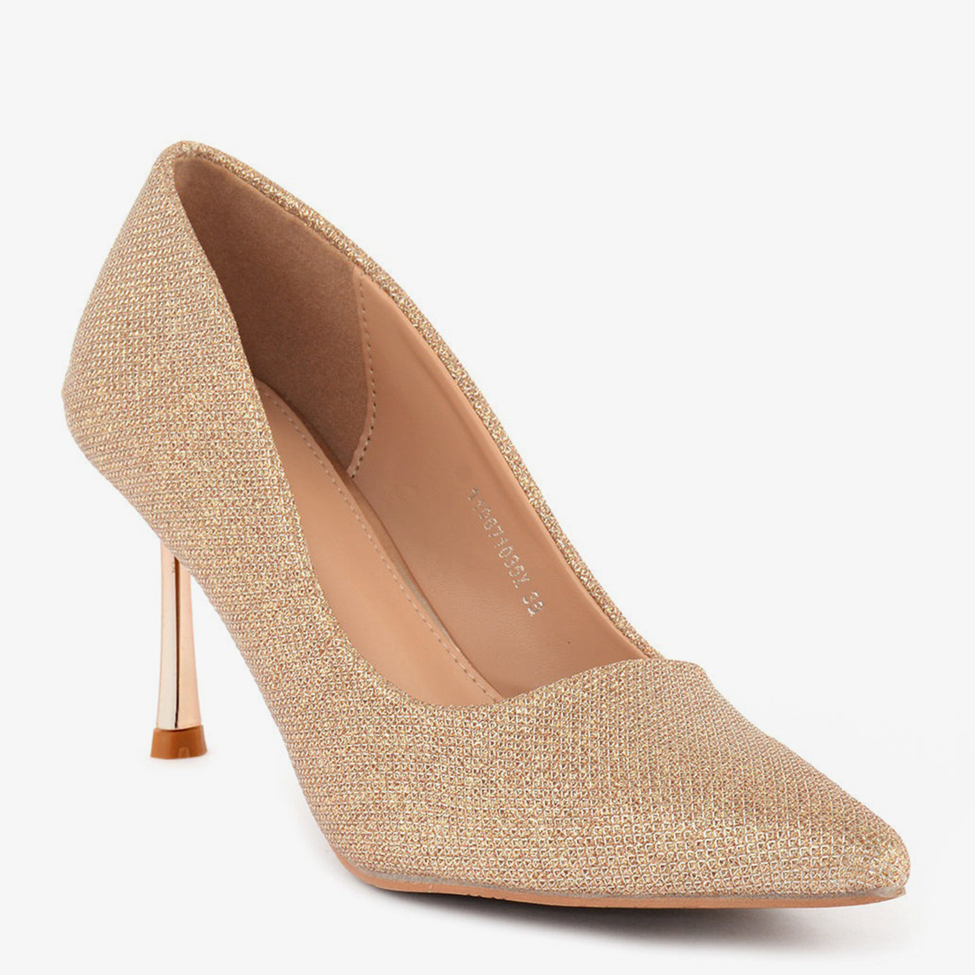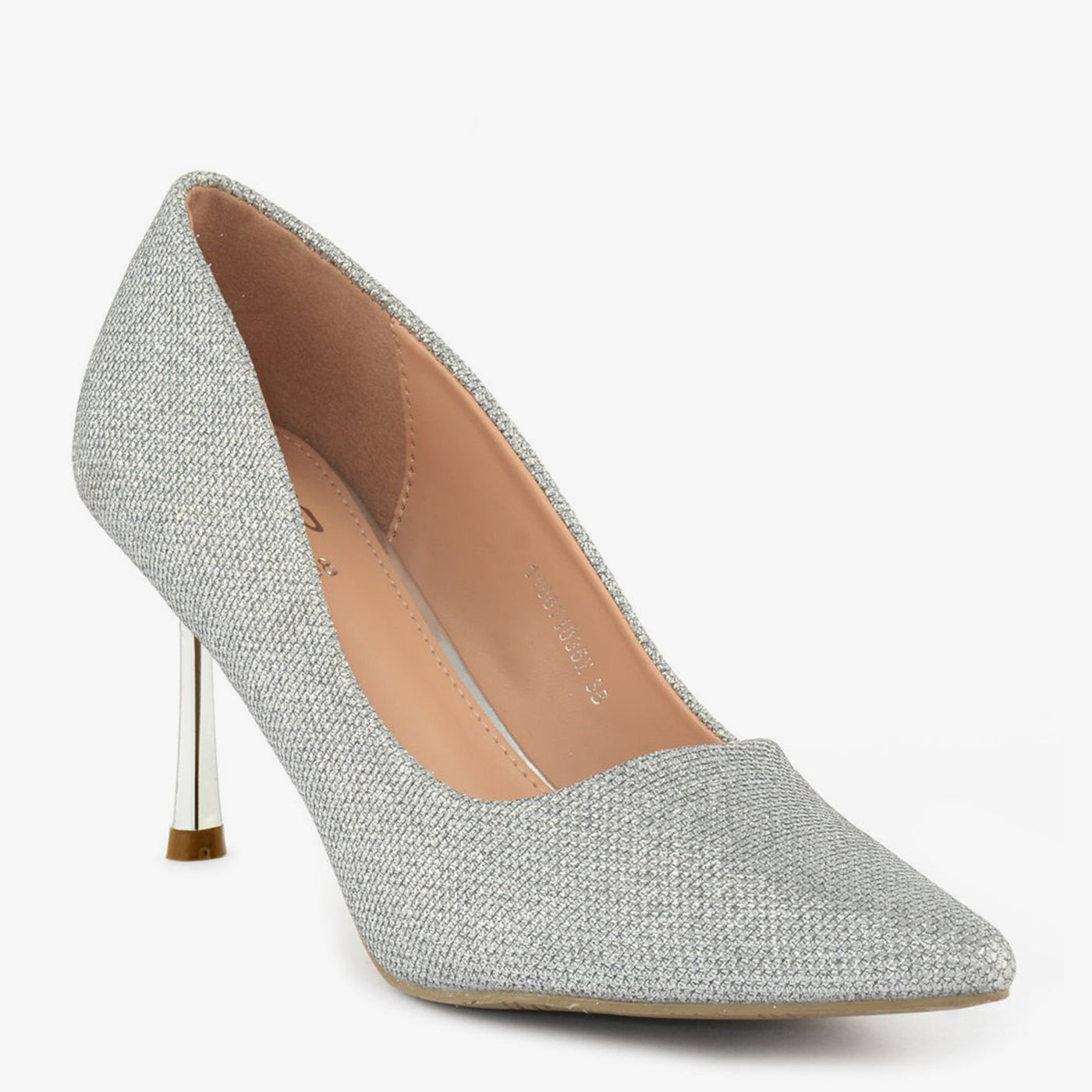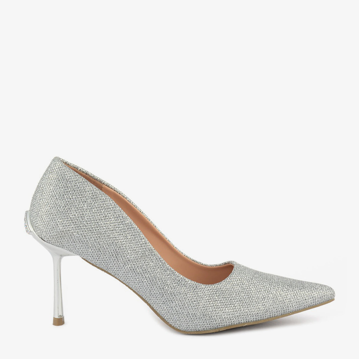 A minimal pointed heel with a smooth micro-glitter surface and a delicate stiletto shape. Lightweight and refined, perfect for day-to-evening bridal transitions.