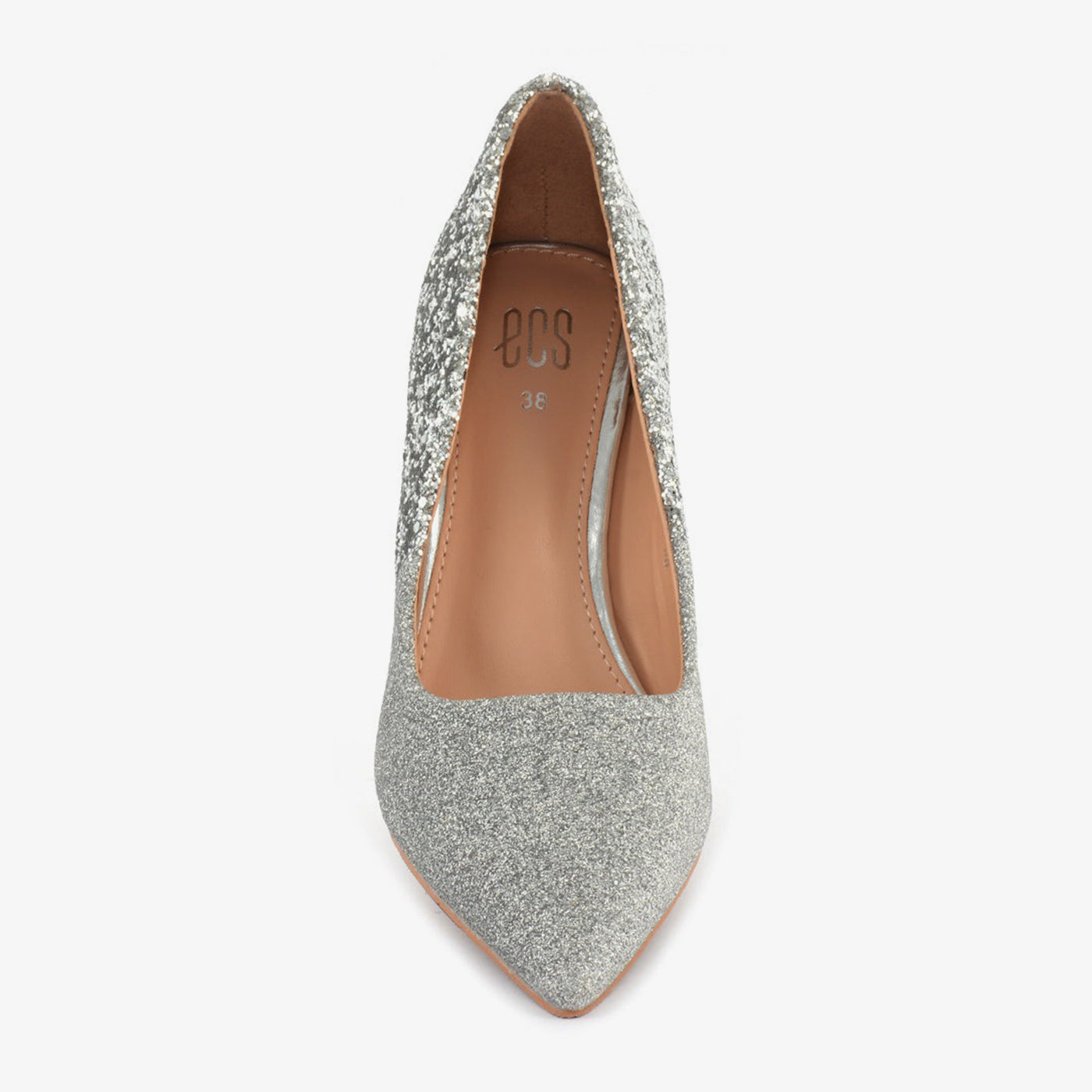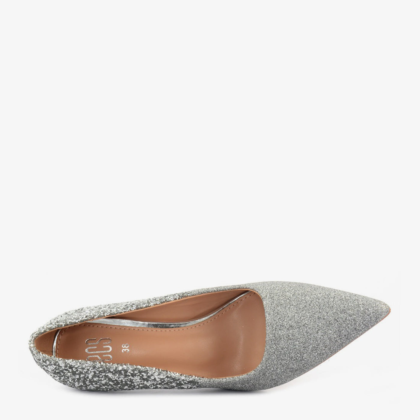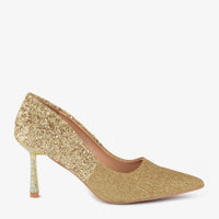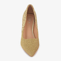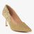 This pointed toe stiletto sparkles with a full glitter body and jeweled heel. It offers a sharp, modern silhouette for wedding nights and festive celebrations.