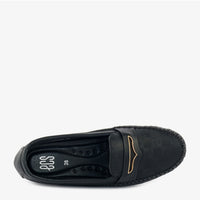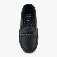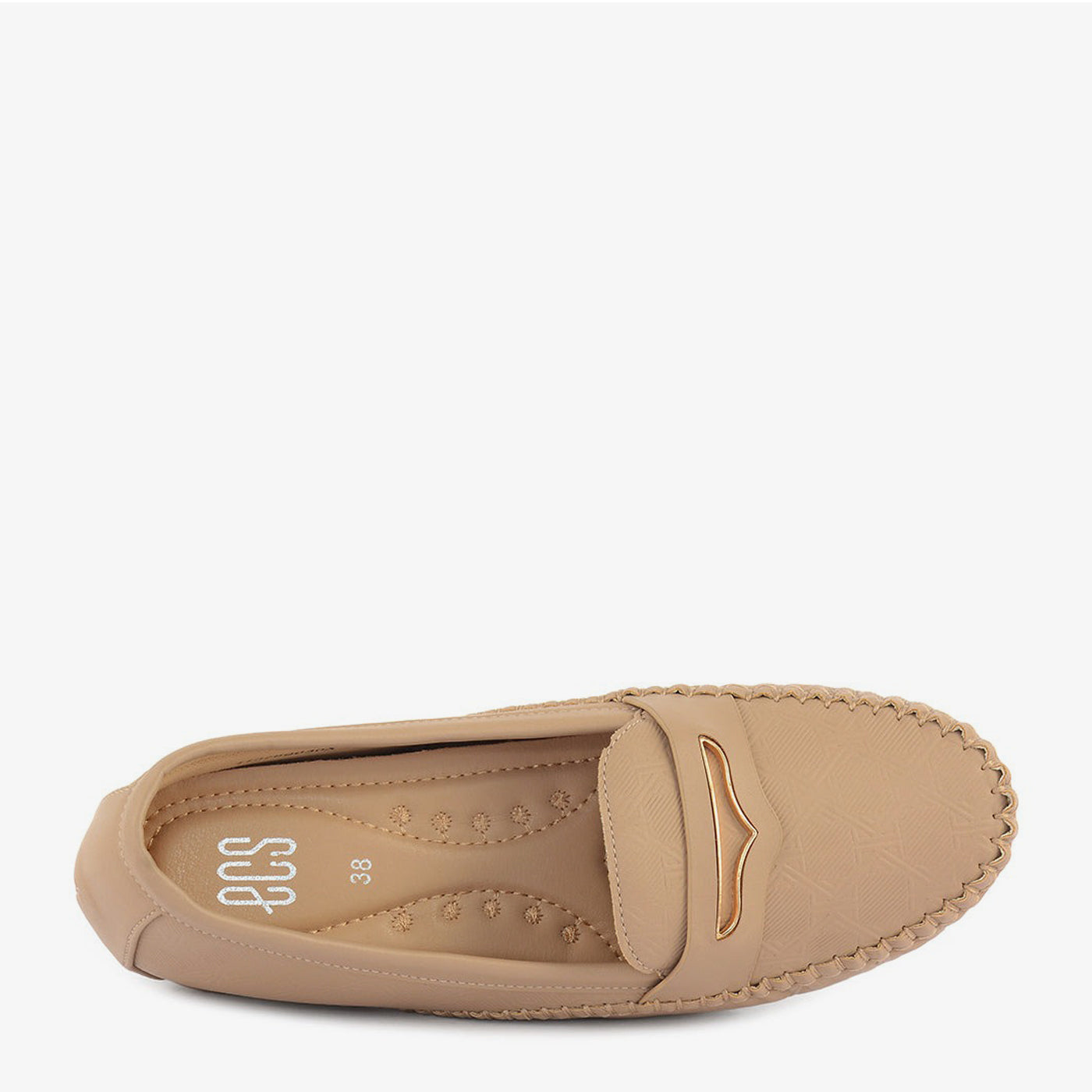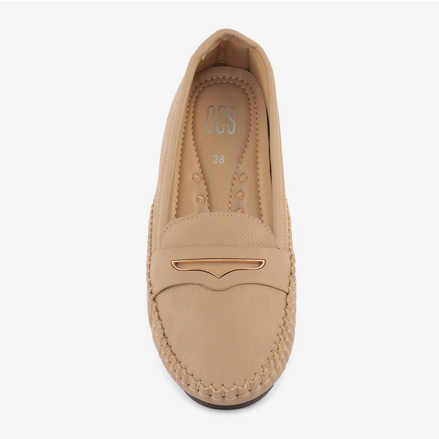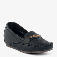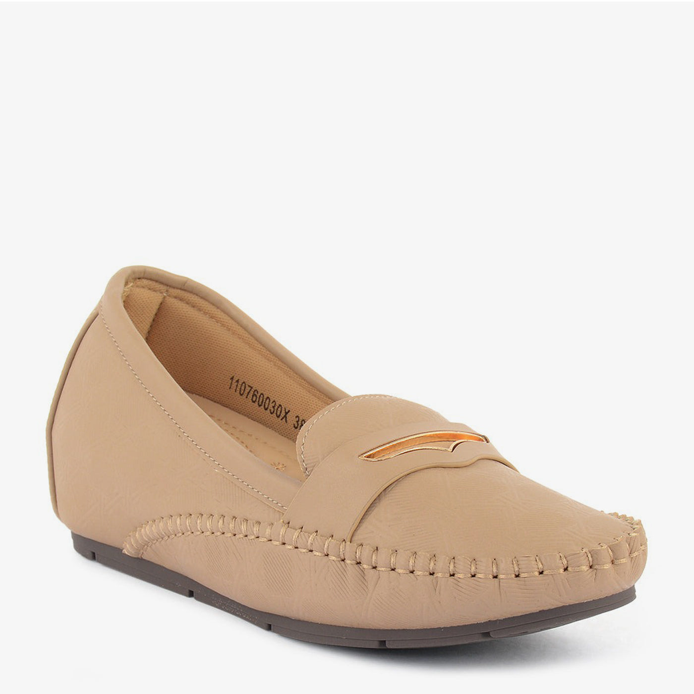 A wedged moccasin crafted for comfort and subtle elevation, finished with a clean metallic accent.