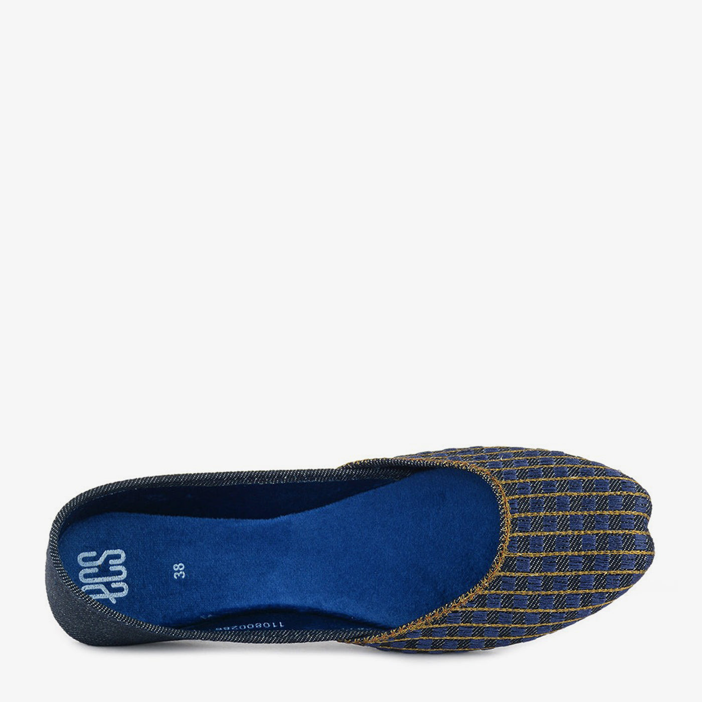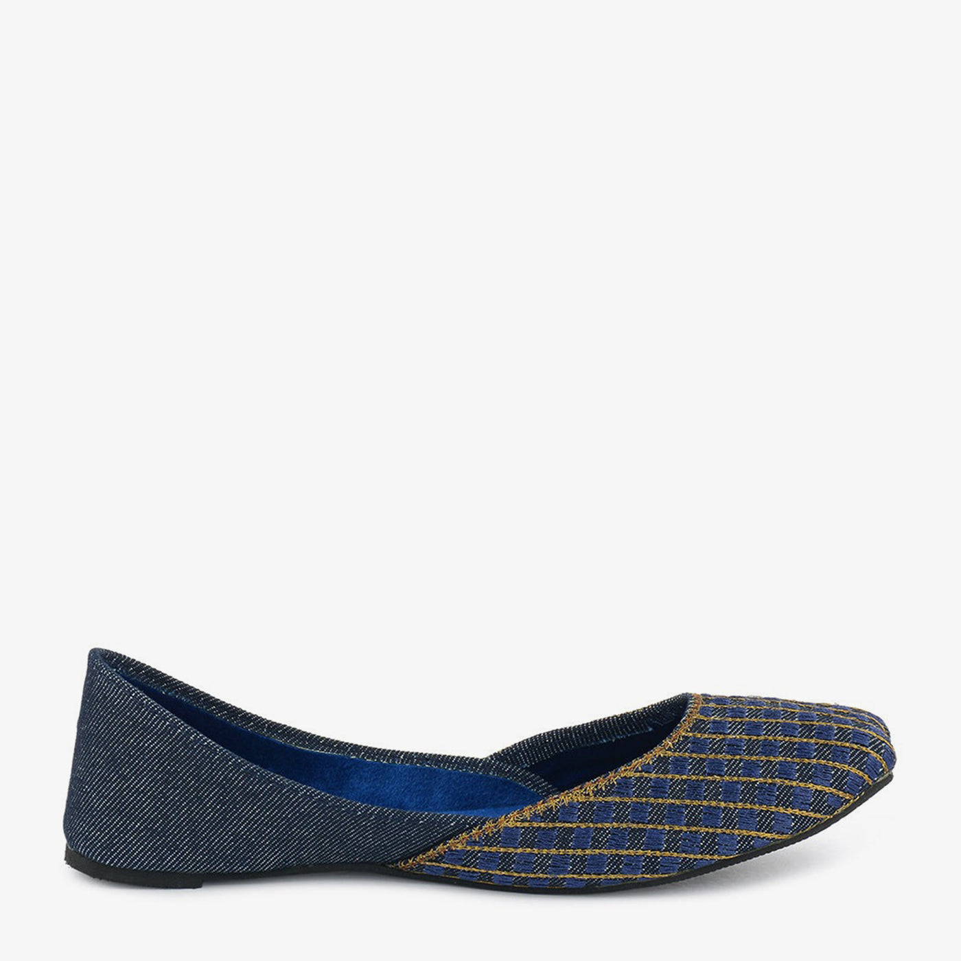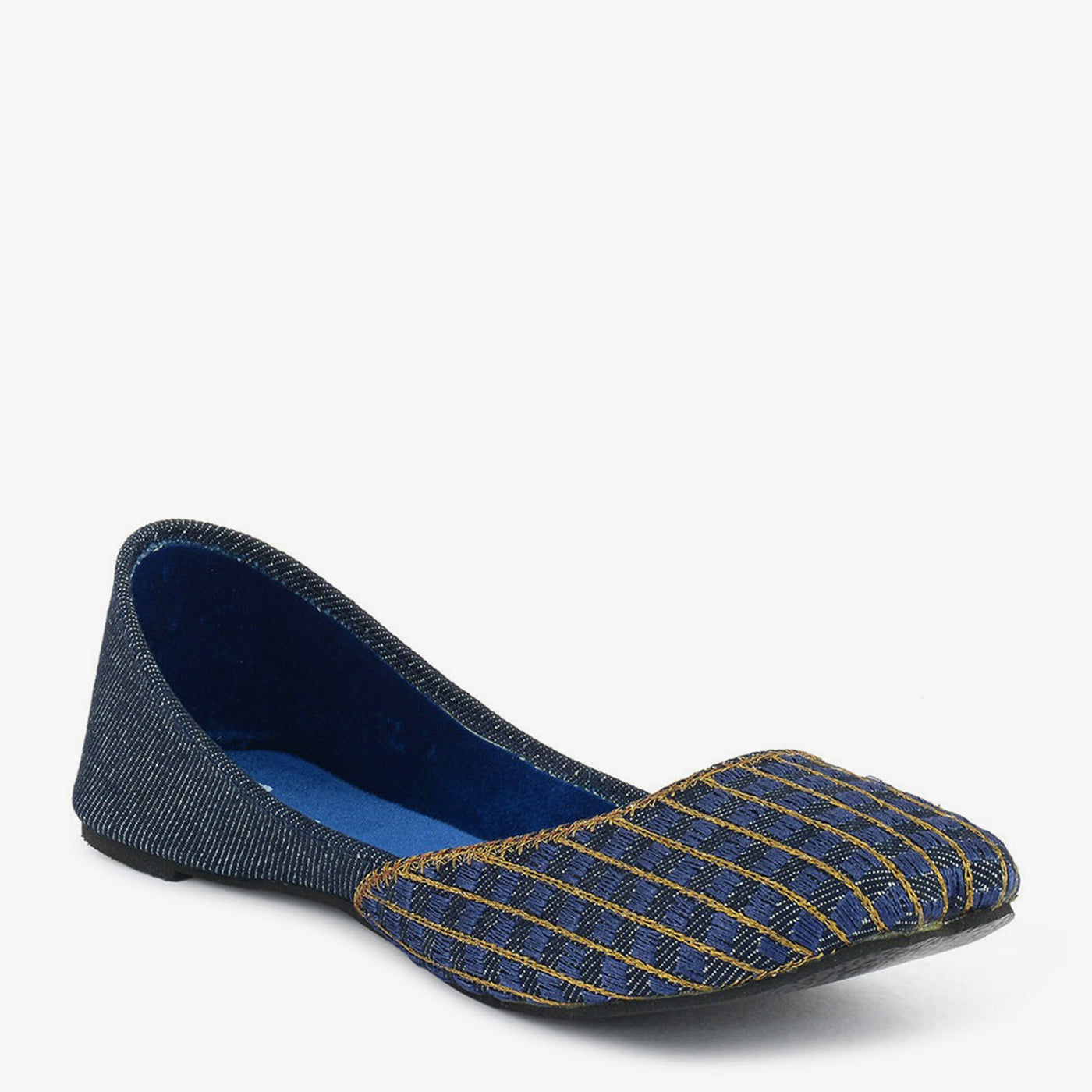 A modern twist on traditional wear, this khussa features structured golden threadwork over denim-inspired fabric. Ideal for understated festive looks or casual elegance.