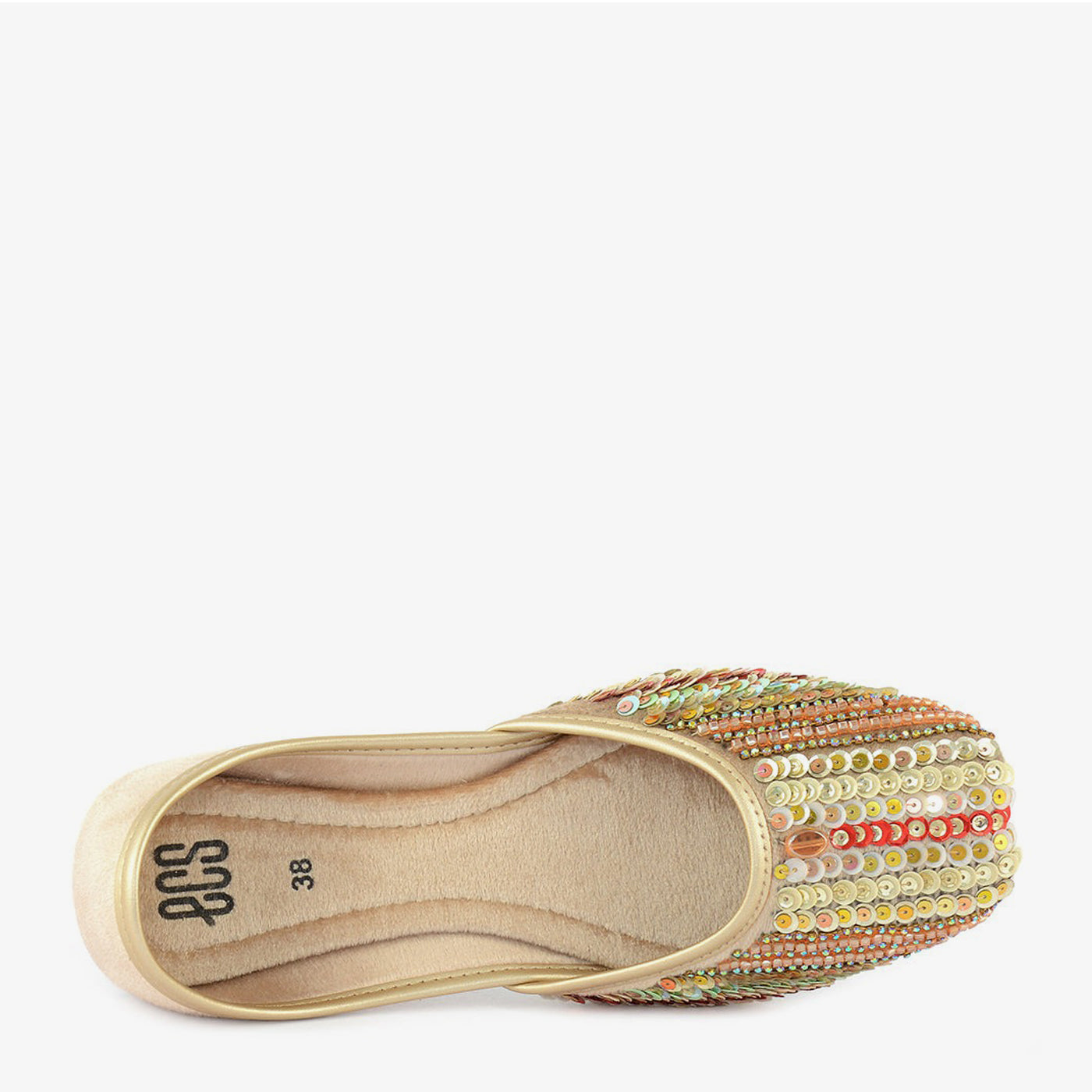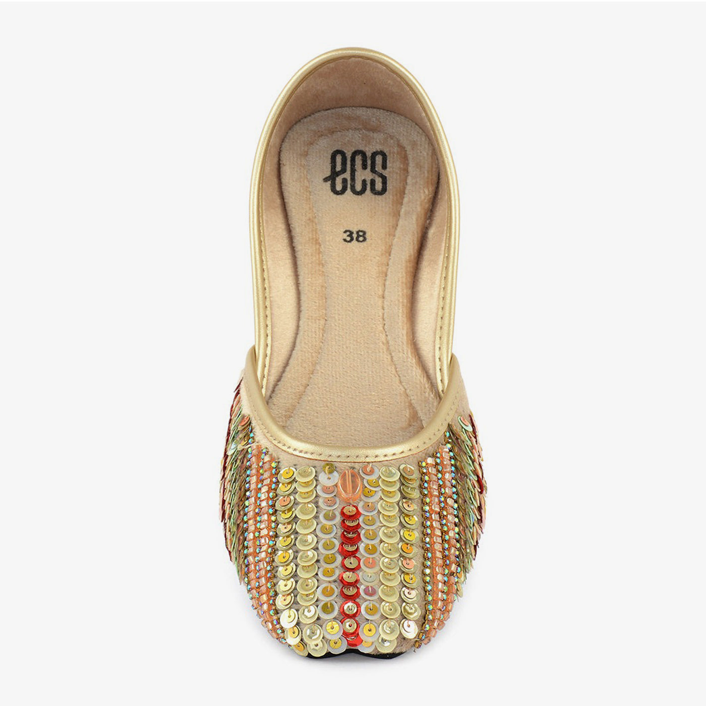 Step into cultural elegance with the "Golden Mosaic Khussa." These traditional shoes feature a pointed toe and a flat sole, adorned with a vibrant mosaic of golden and multicolored embellishments.