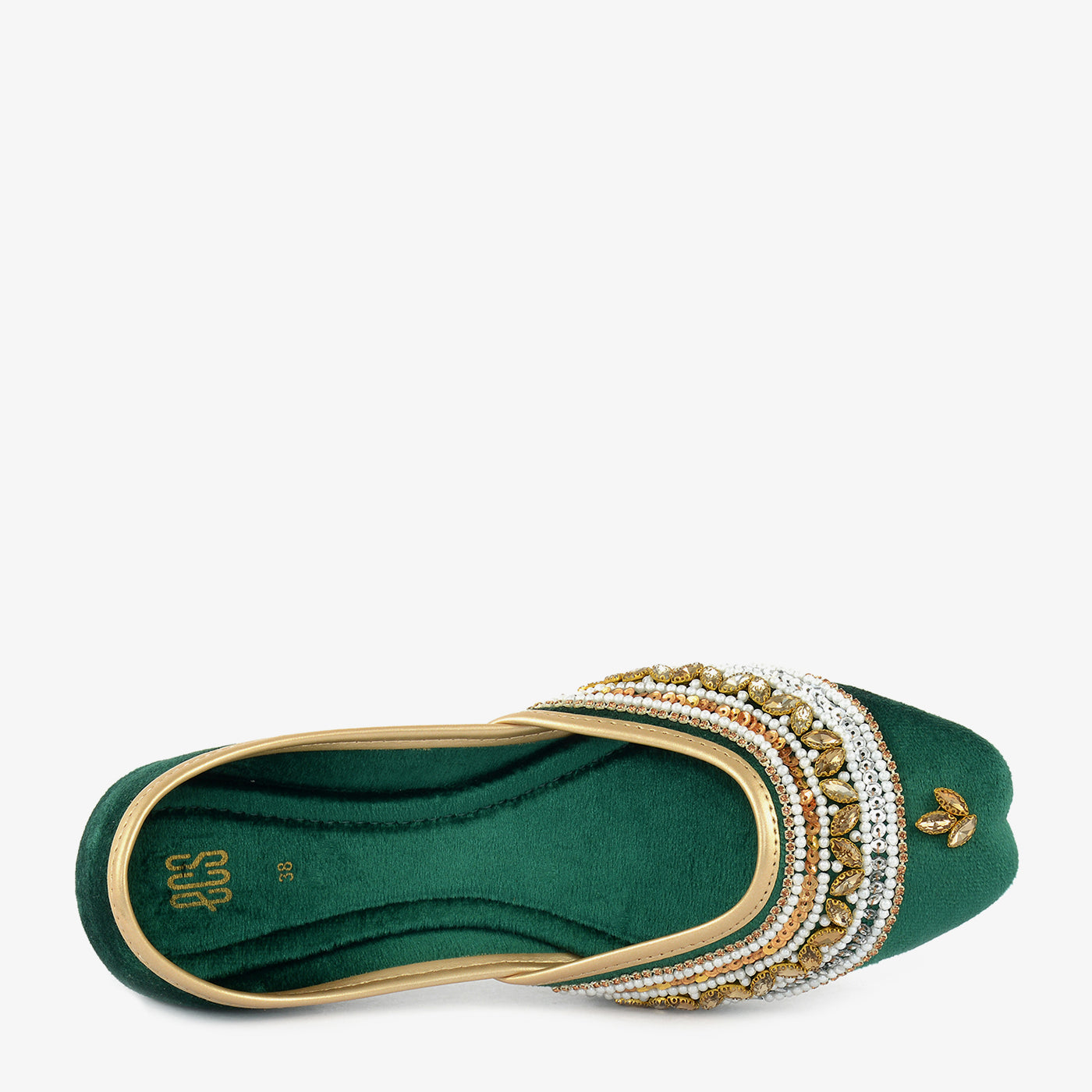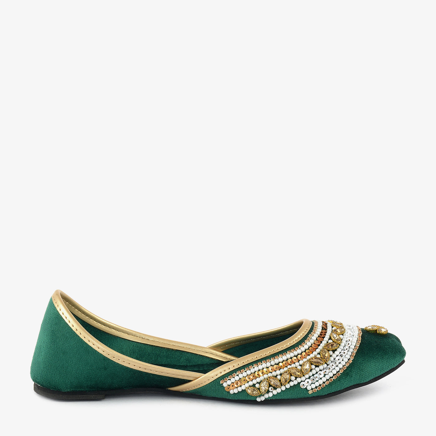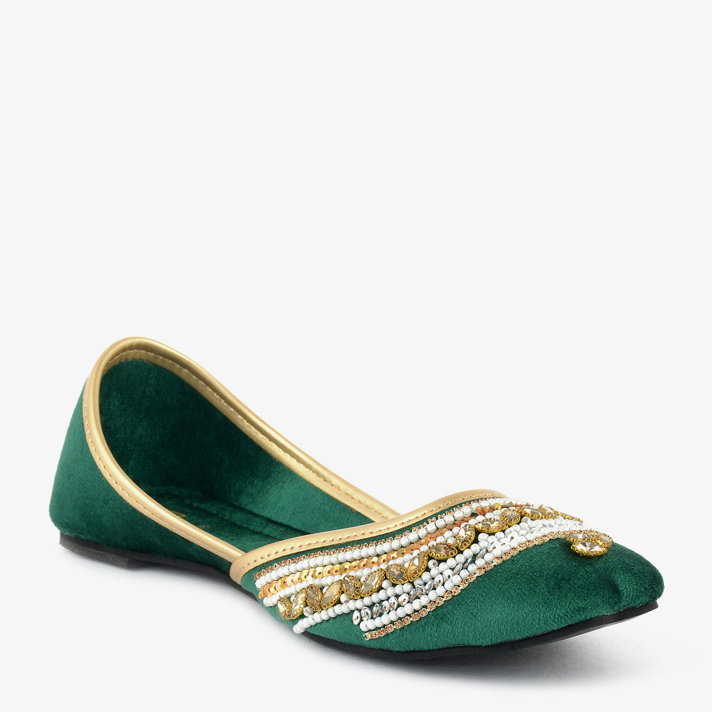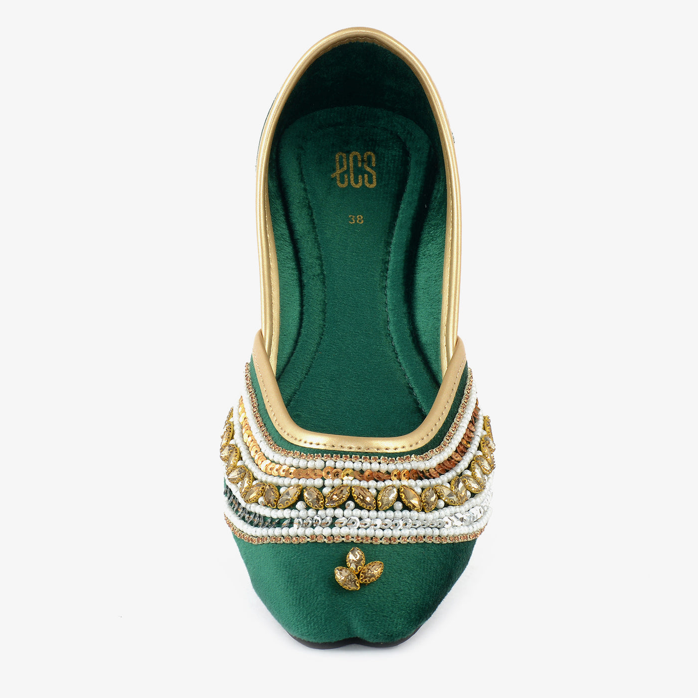 Indulge in timeless elegance with these exquisite khussas. Crafted with a luxurious green fabric and adorned with intricate embellishments, these khussas exude sophistication. The pointed toe and clear acrylic...