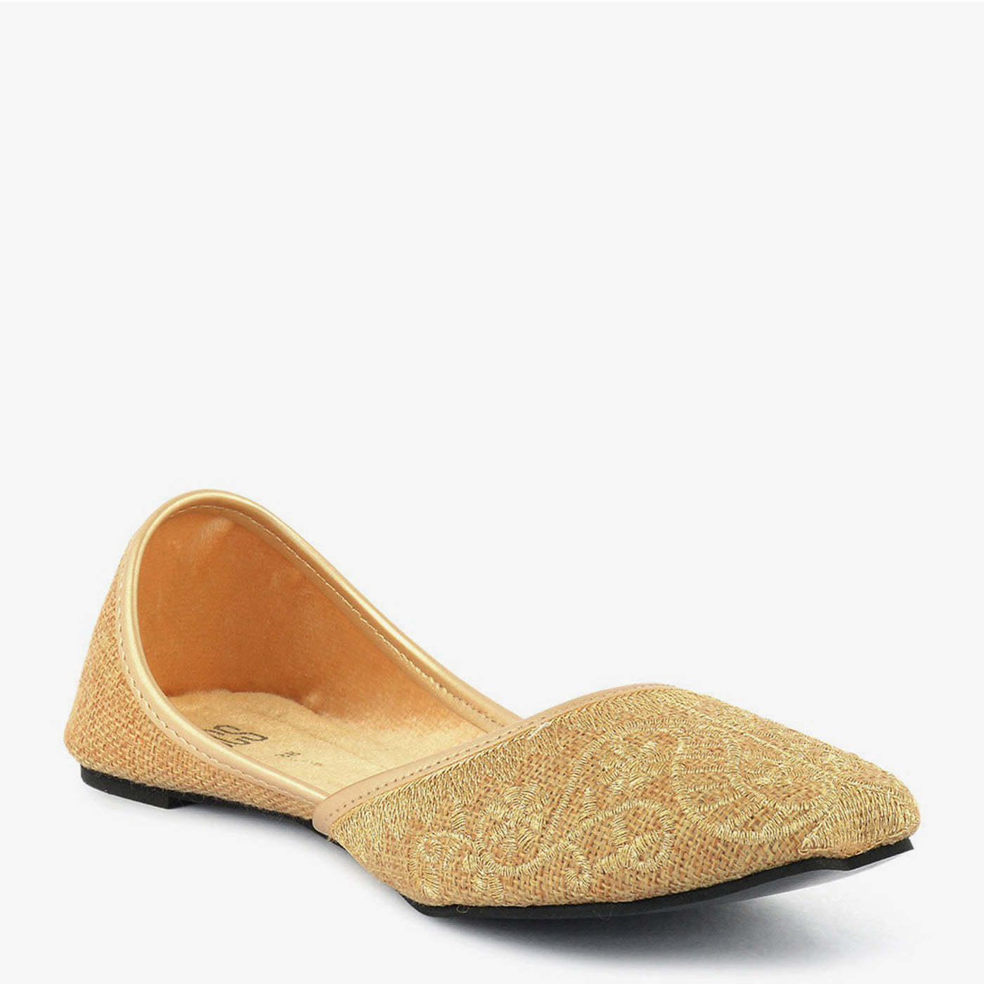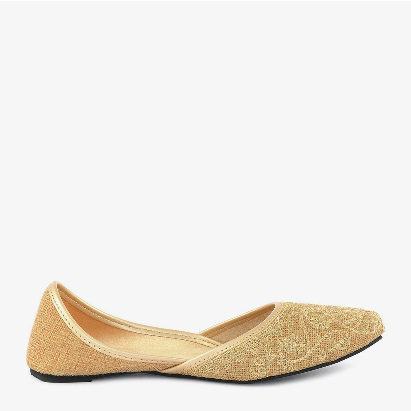 - Material: Faux leather/fabric upper with golden embellishments