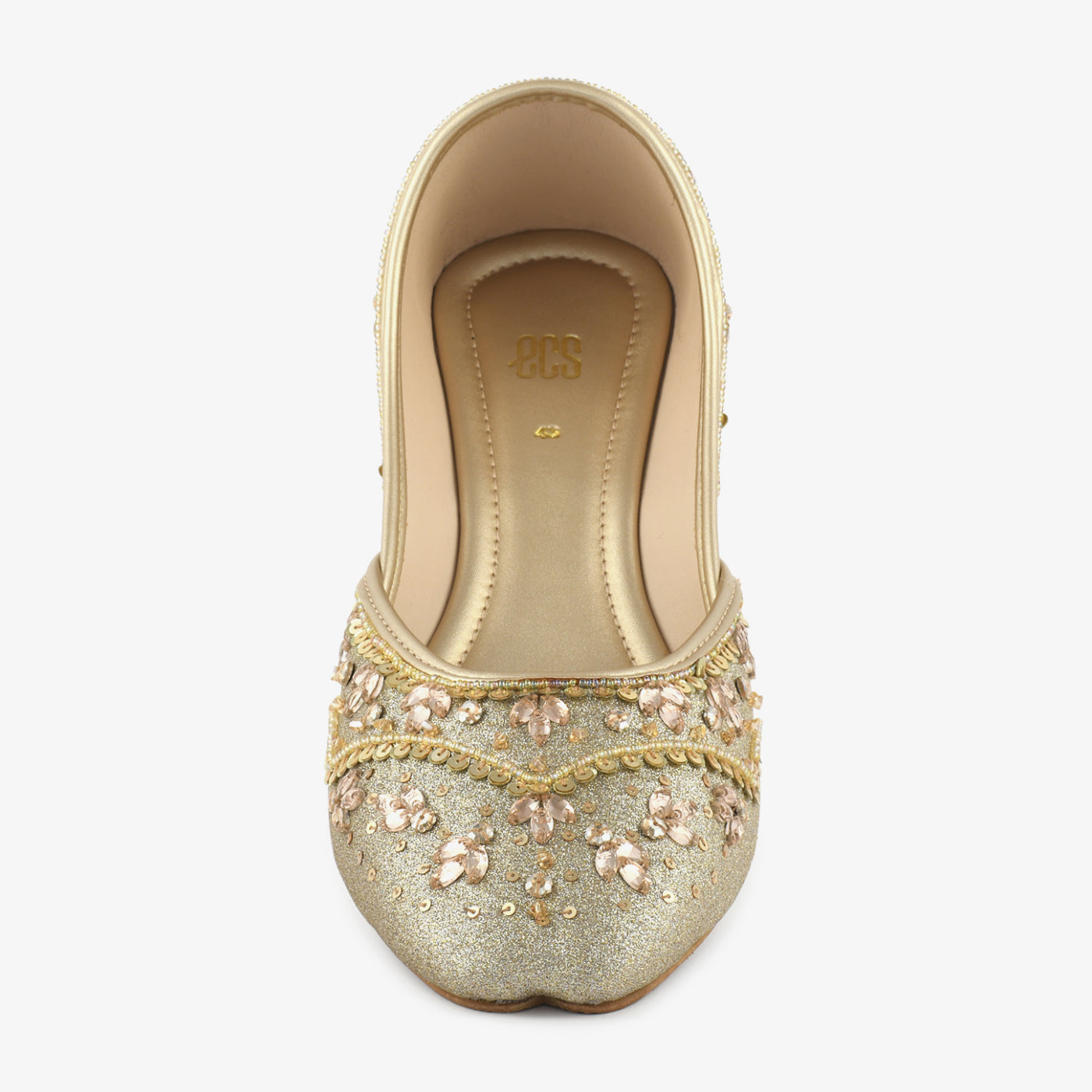 This traditional khussa features detailed craftsmanship that reflects cultural elegance. The flat sole offers comfort for extended wear. Its refined shape and decorative finish make it suitable for festive occasions. A perfect blend of tradition and comfort.