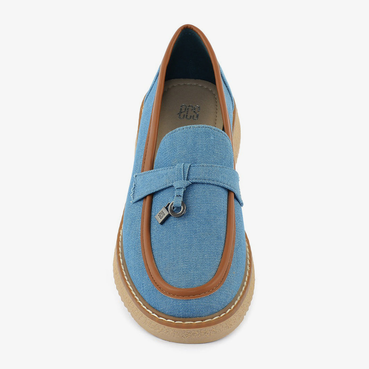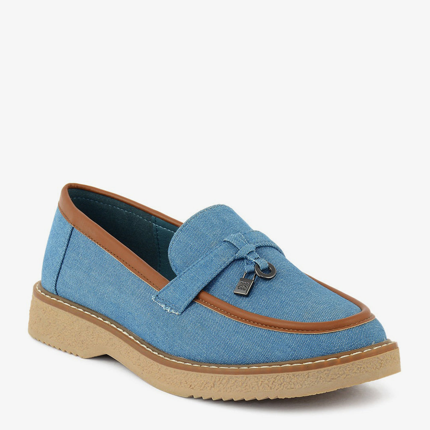 - Design: Loafer silhouette, Denim upper, Tan trim, Low platform sole