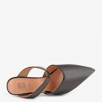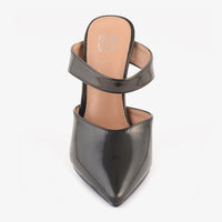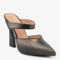 A pointed-toe mule with a tall, angular block heel. It features a wide, diagonally placed strap across the instep. A stylish option for an afternoon in Lahore.