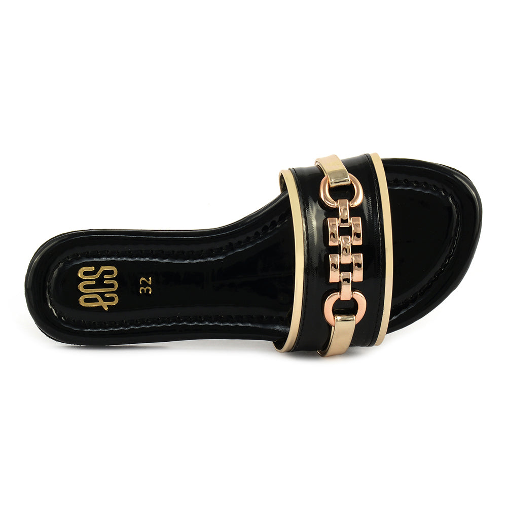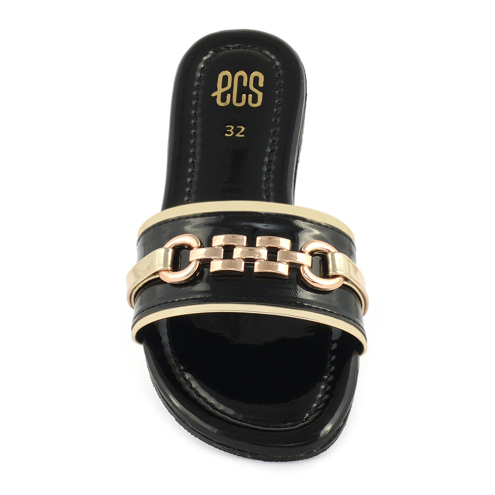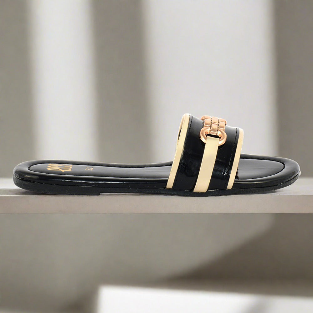 Add a touch of elegance to your casual wear with the "Glossy Buckle" slipper. The synthetic patent upper with a glossy finish and a stylish buckle detail offers a chic and sophisticated appearance. The round toe shape and slip-on design ensure a comfortable fit, while the PVC sole provides durability. Perfect for everyday use, these slippers blend style and practicality.