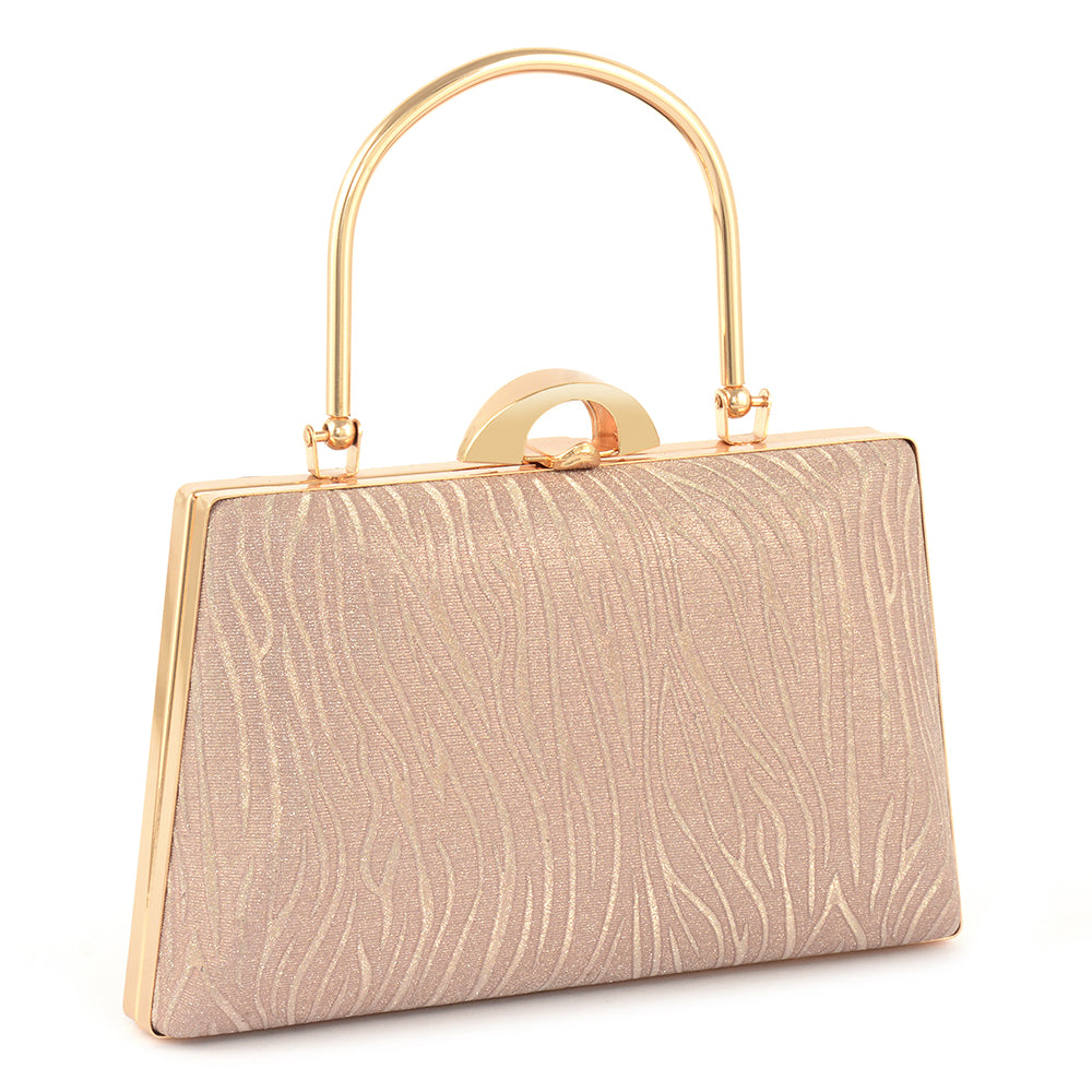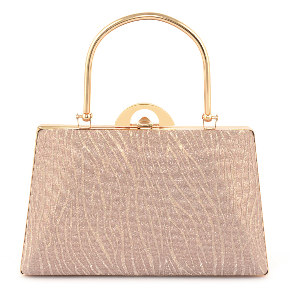 Graceful and distinct, the Zerelle Wave Clutch features a silver shimmer surface with a flowing wave-texture design, framed in gold and topped with a sculptural metallic handle. This...
