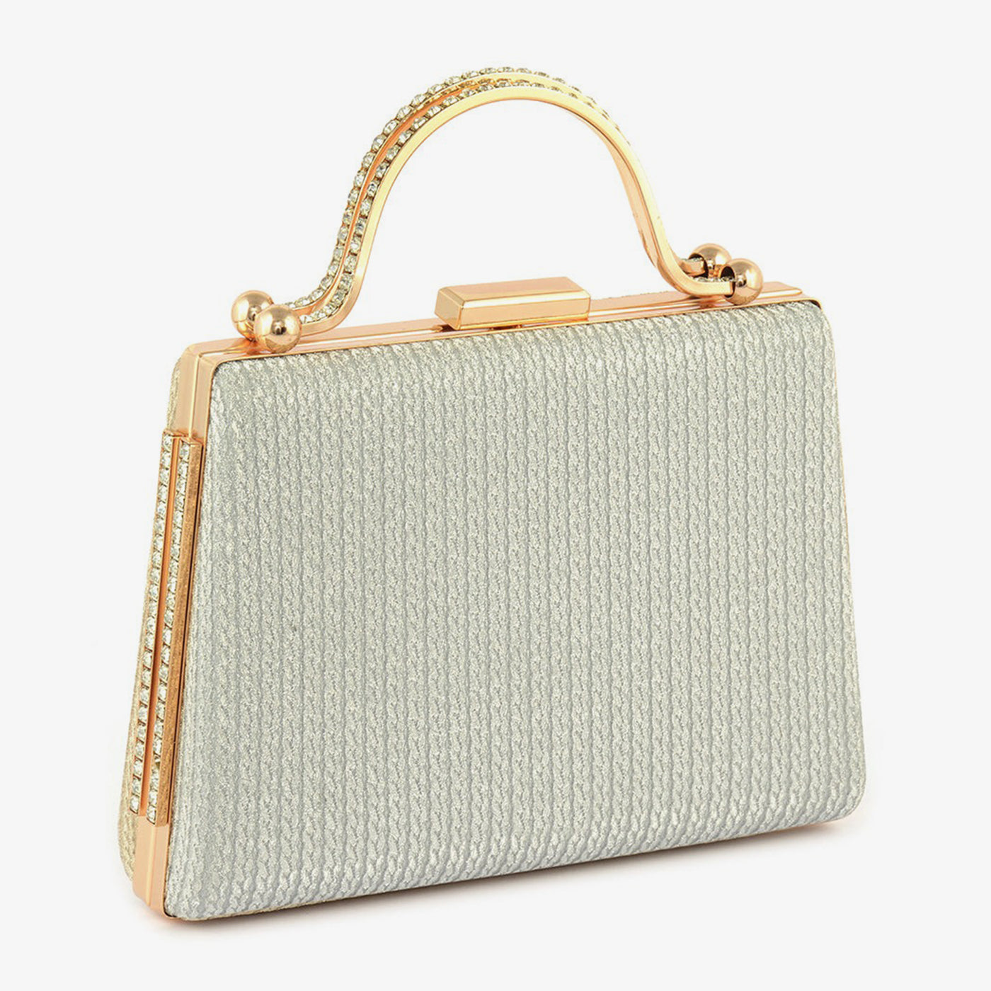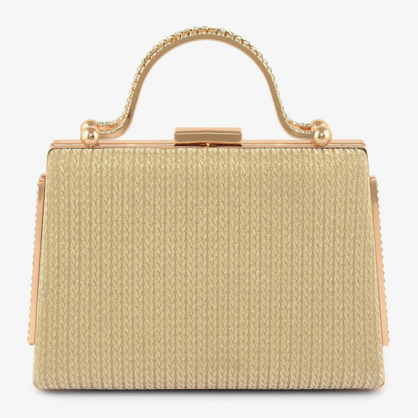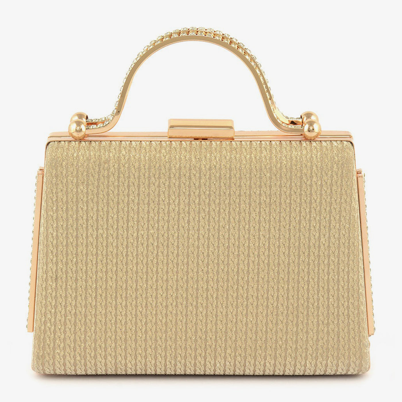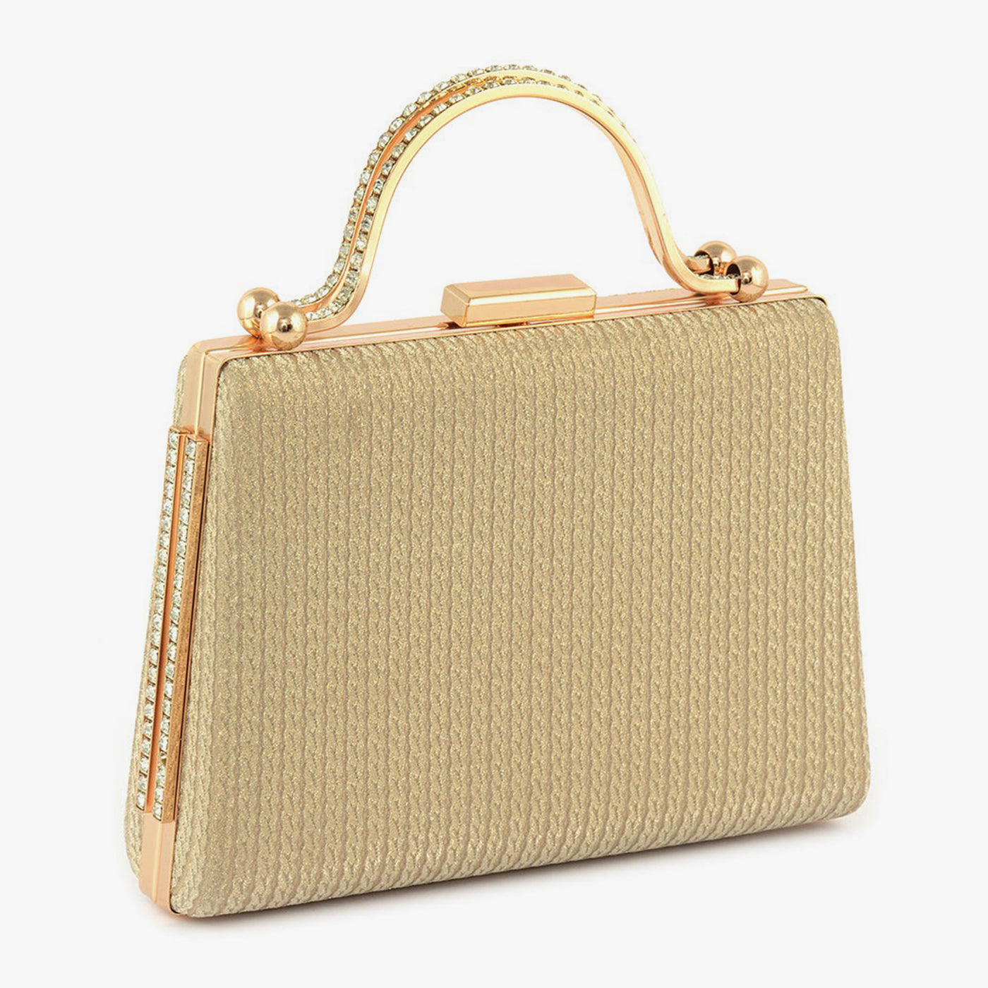 Refined and radiant, the Lunetta Frame Clutch is crafted with a gold textured fabric and accented by a sleek metallic frame. The embellished top handle adds a touch of glamour, making it a standout companion for festive evenings and formal occasions.