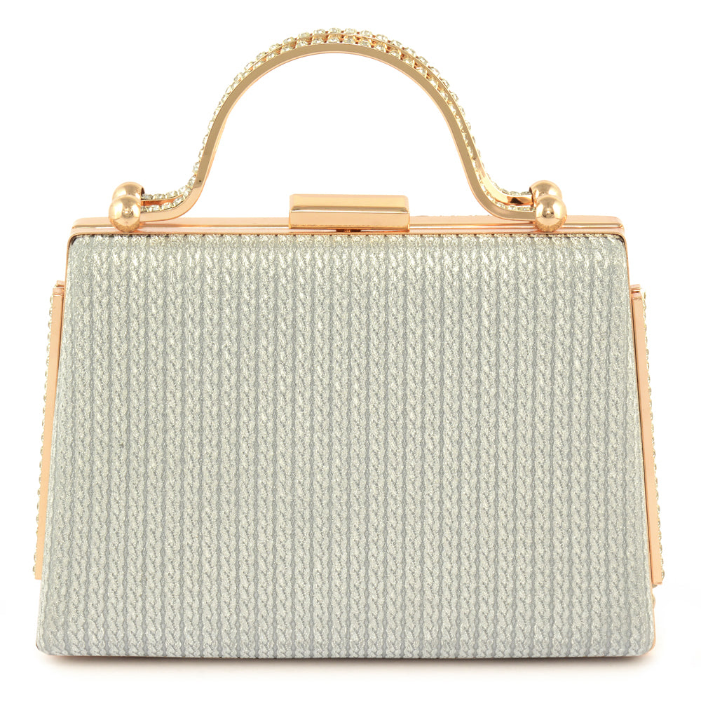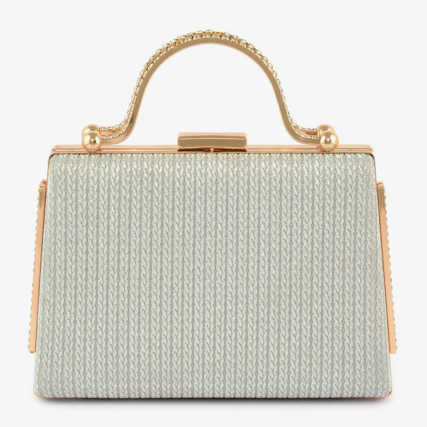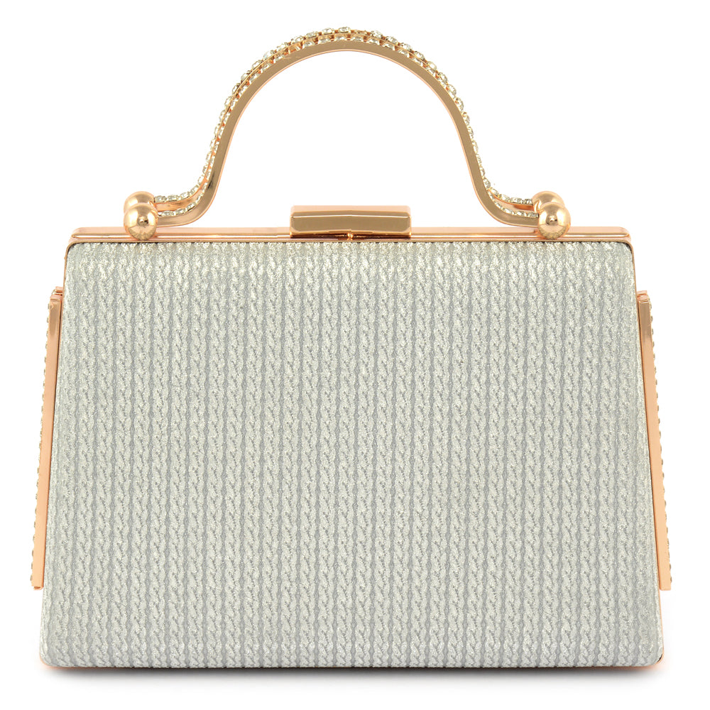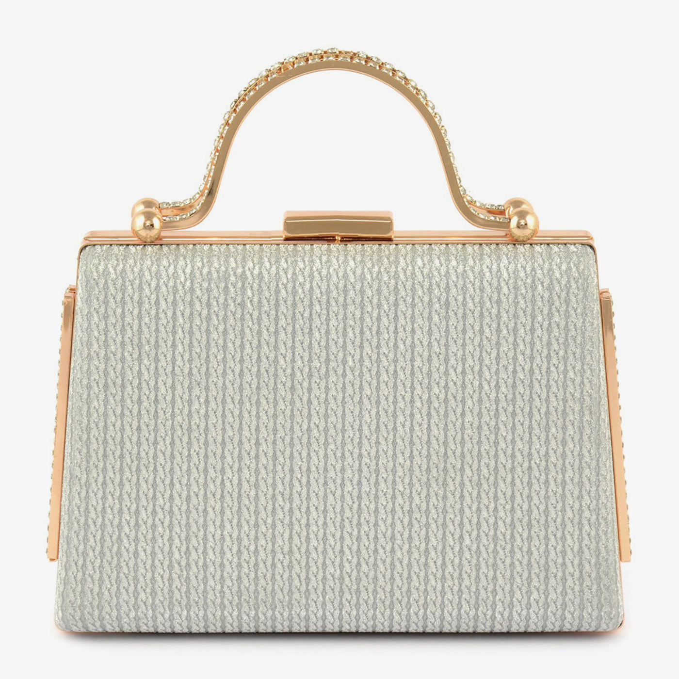 Refined and radiant, the Lunetta Frame Clutch is crafted with a gold textured fabric and accented by a sleek metallic frame. The embellished top handle adds a touch of glamour, making it a standout companion for festive evenings and formal occasions.