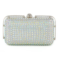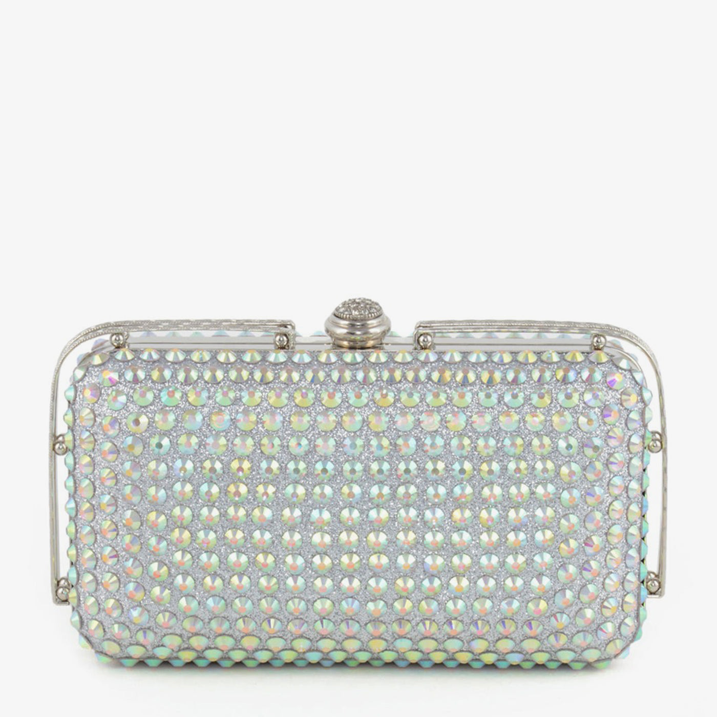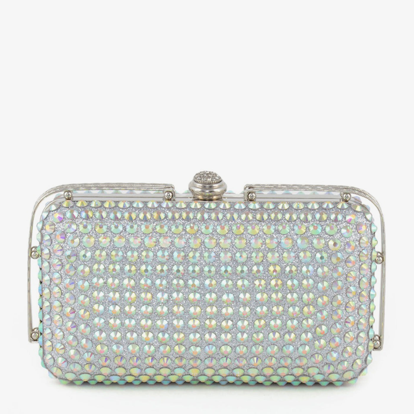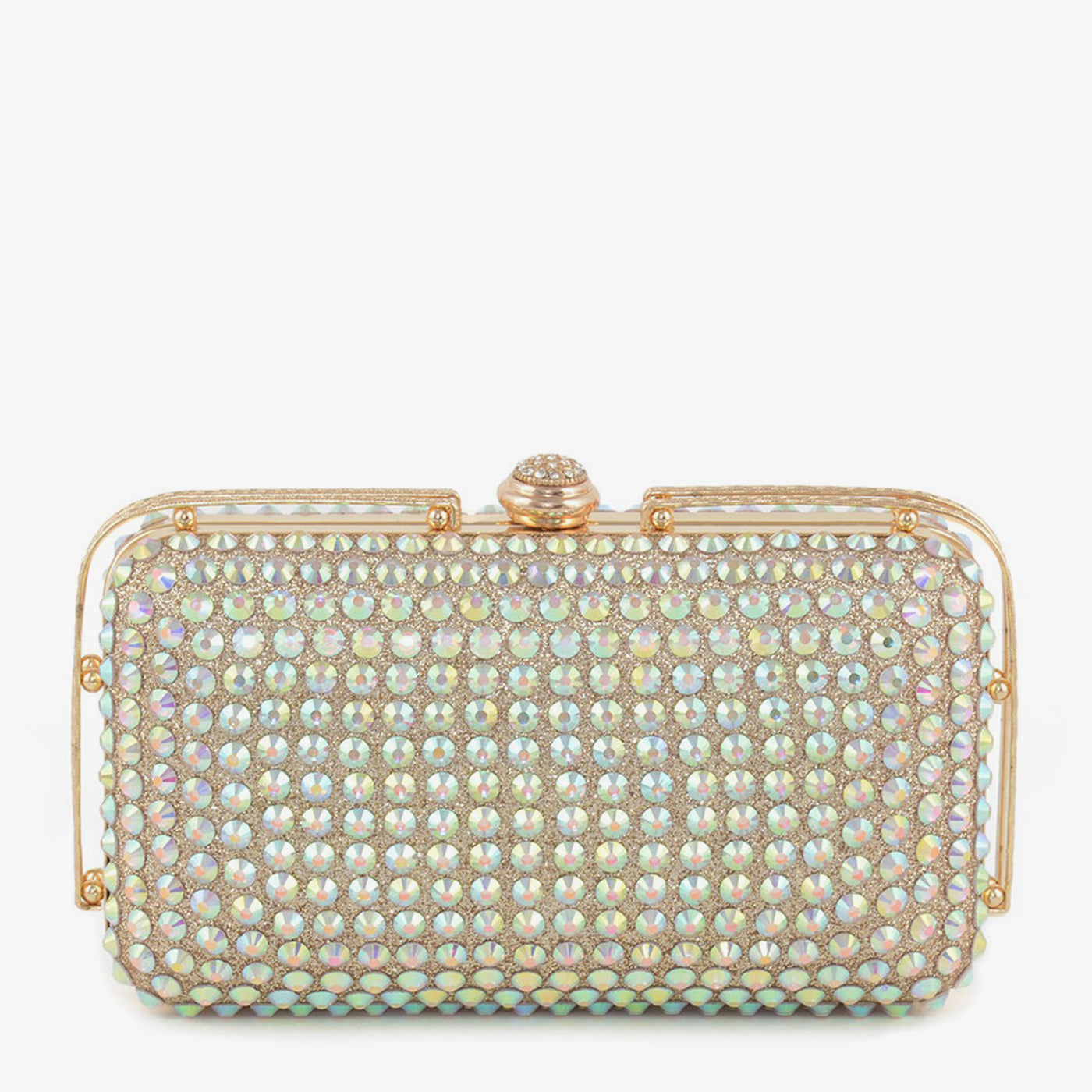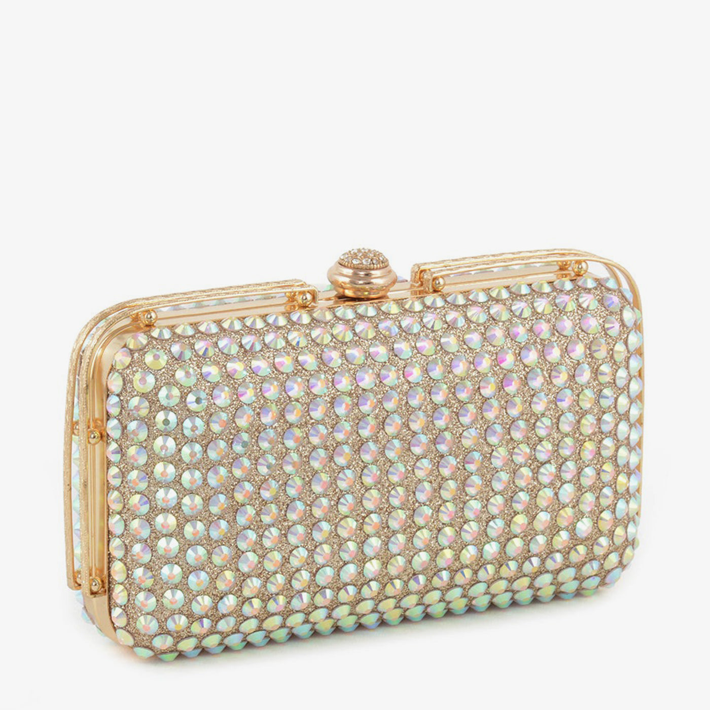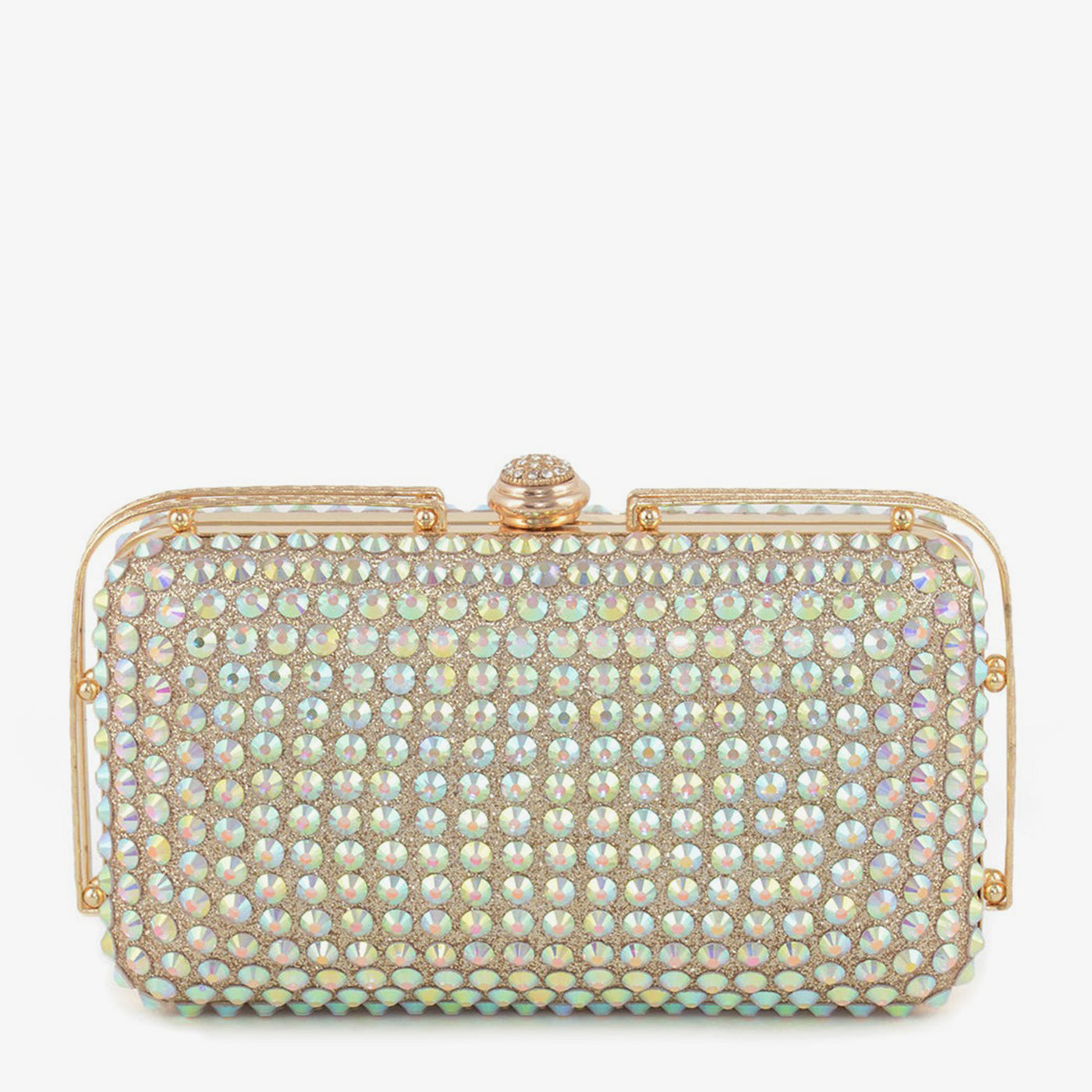 Turn heads with the Aurix Crystal Clutch, a dazzling accessory encrusted with iridescent rhinestones that catch the light from every angle. The metallic frame and crystal clasp add a luxe finish, perfect for weddings, soirées, and statement moments.