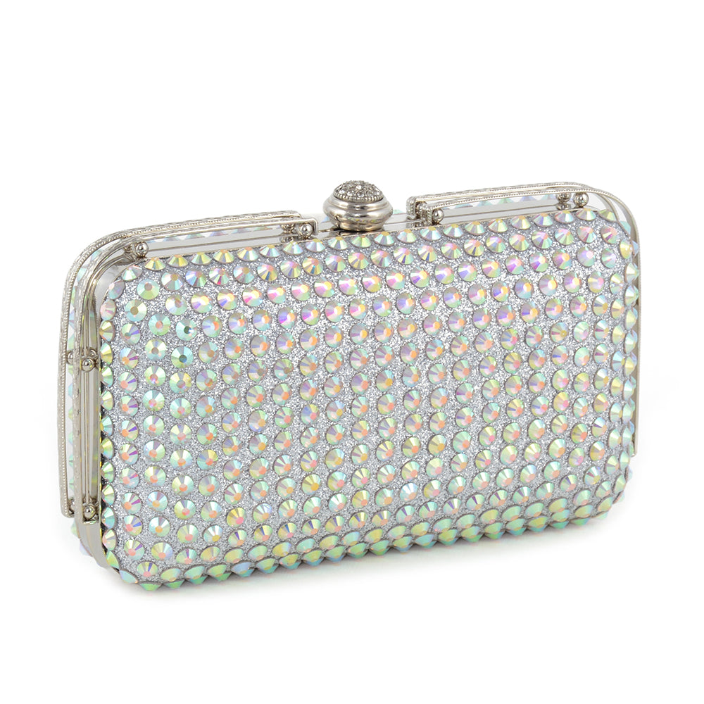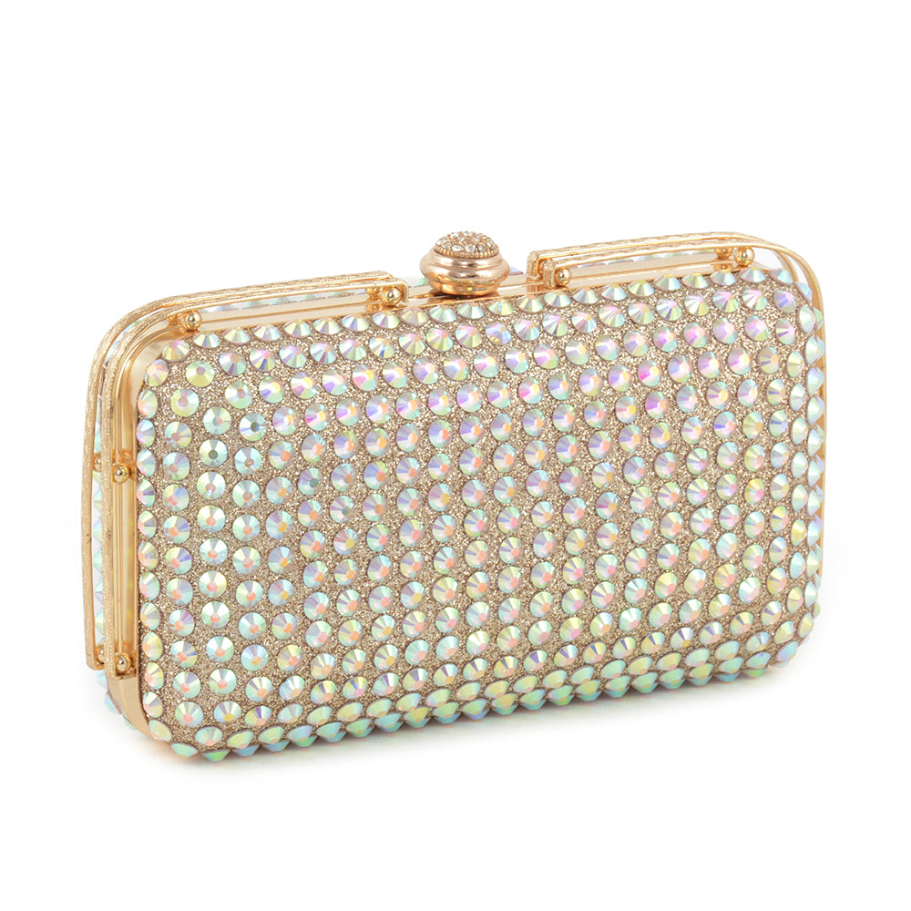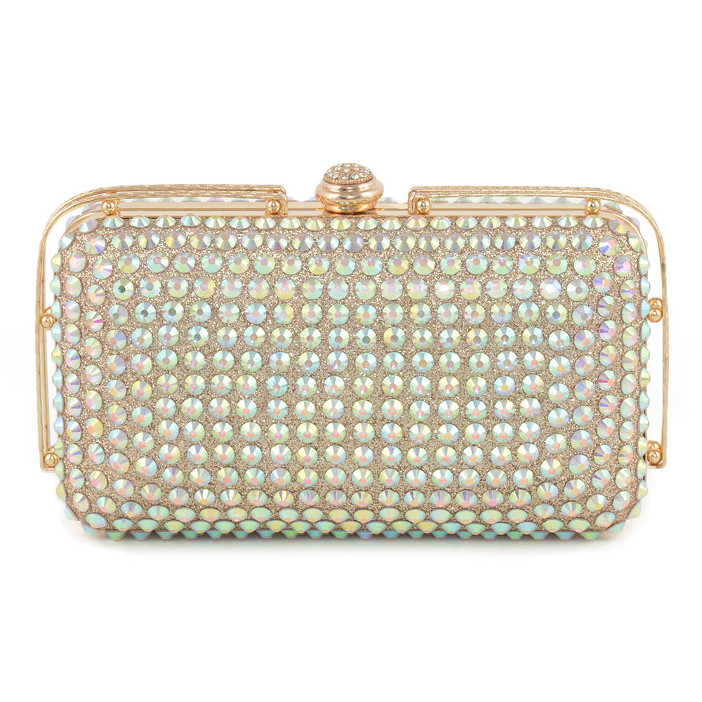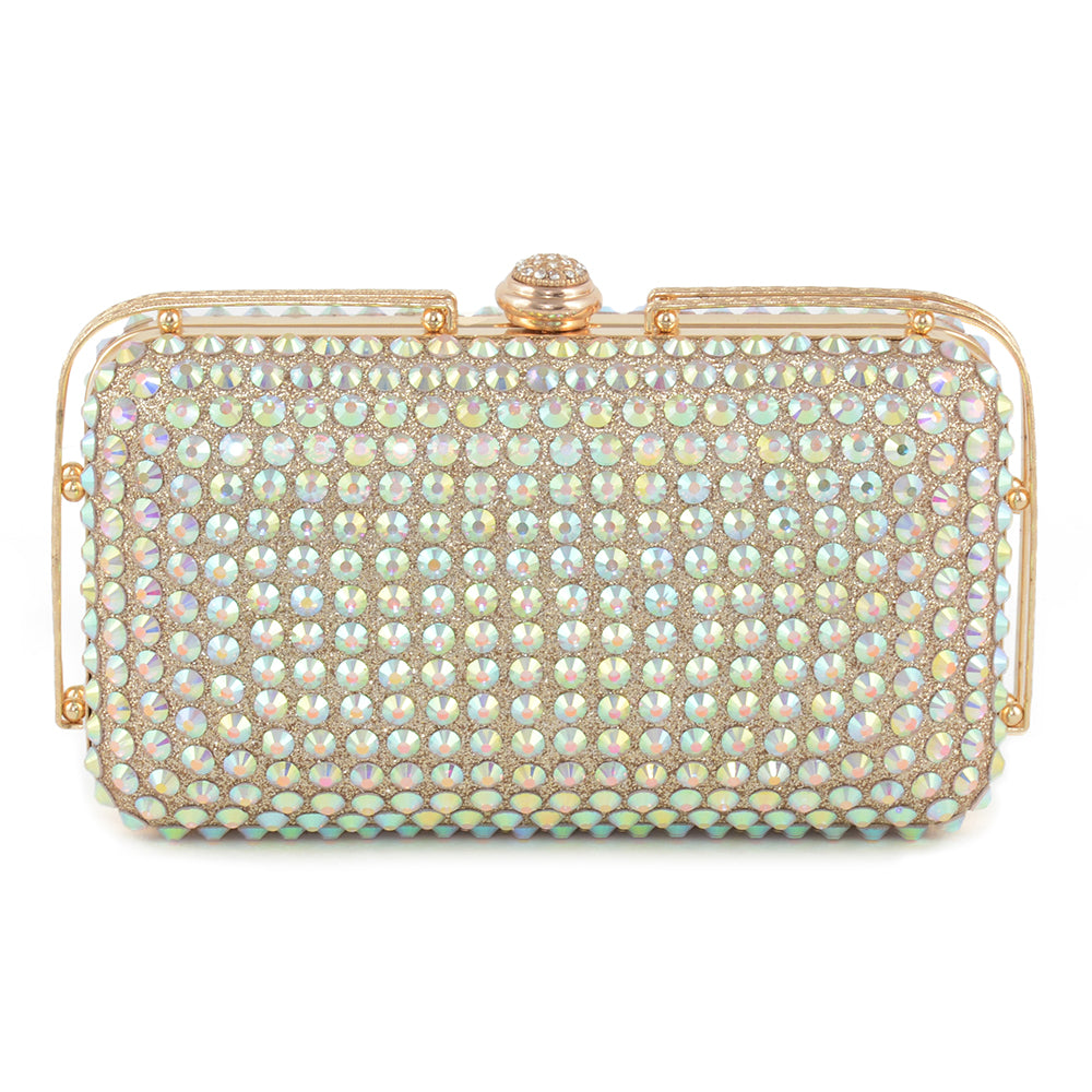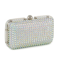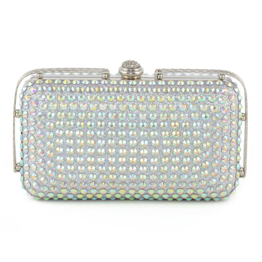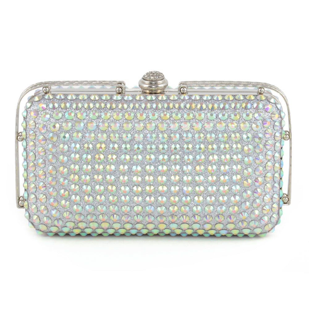 Turn heads with the Aurix Crystal Clutch, a dazzling accessory encrusted with iridescent rhinestones that catch the light from every angle. The metallic frame and crystal clasp add a luxe finish, perfect for weddings, soirées, and statement moments.