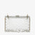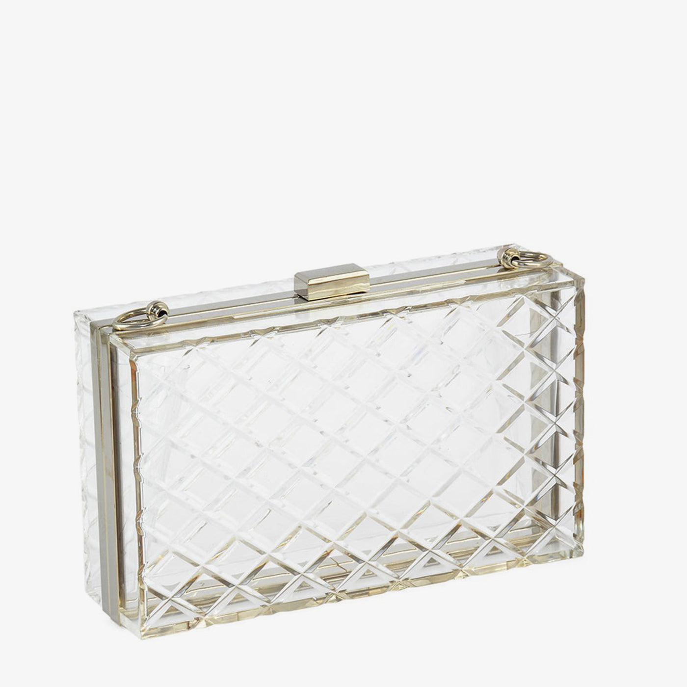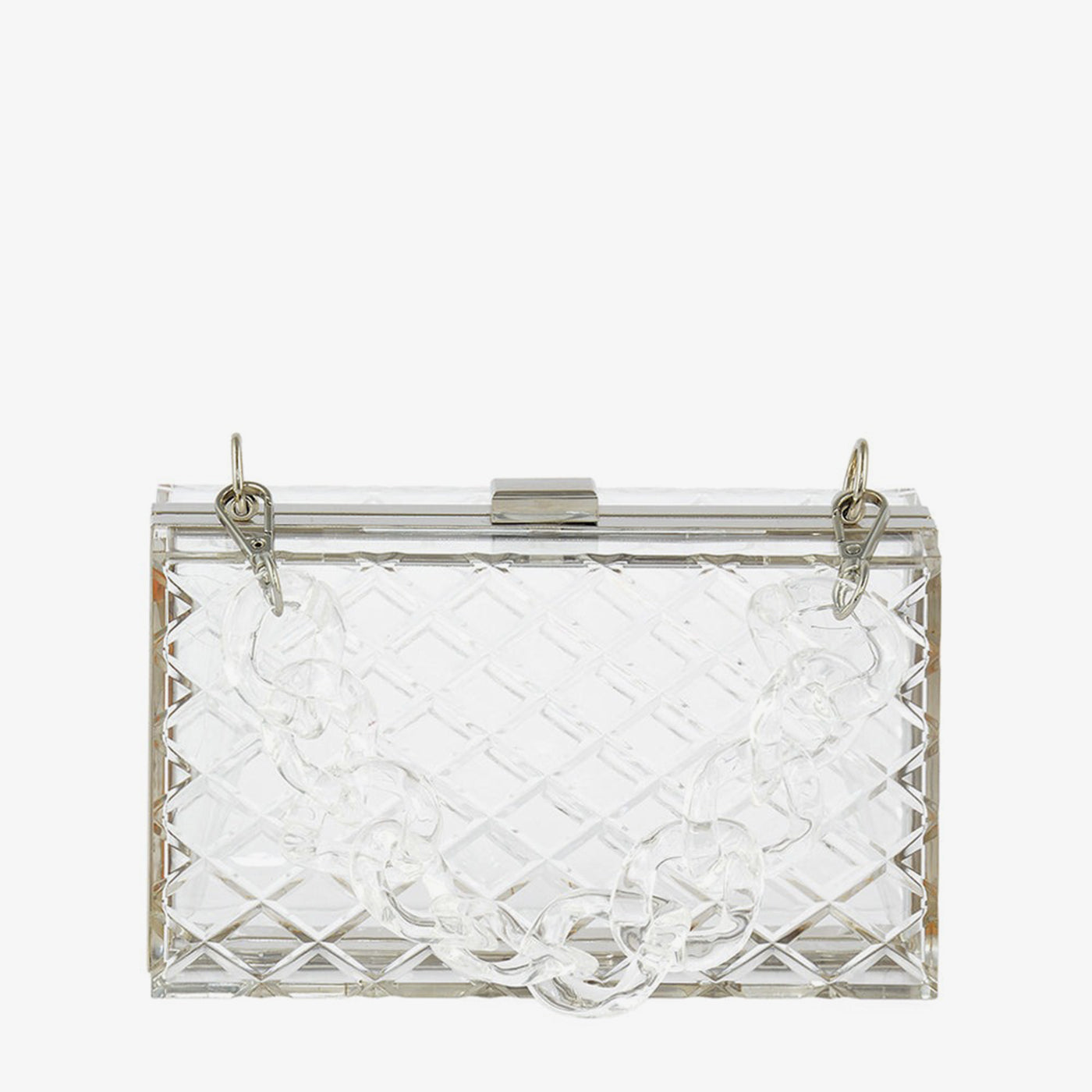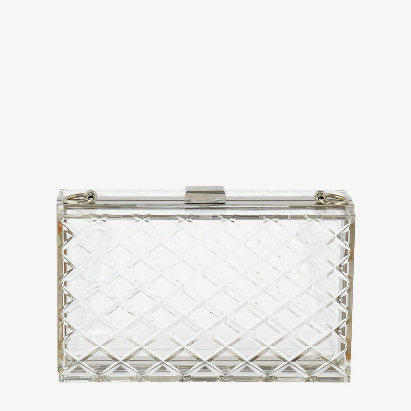 A rectangular clutch crafted from clear acrylic with an intricate etched geometric pattern. It features a silver-tone frame and a matching chunky chain strap for a modern touch.