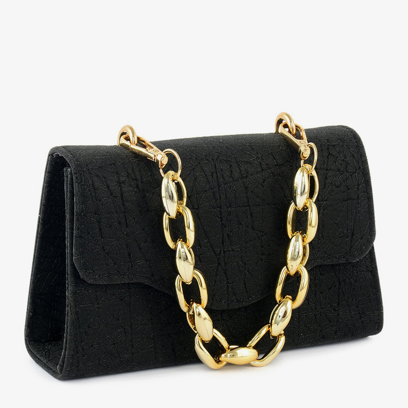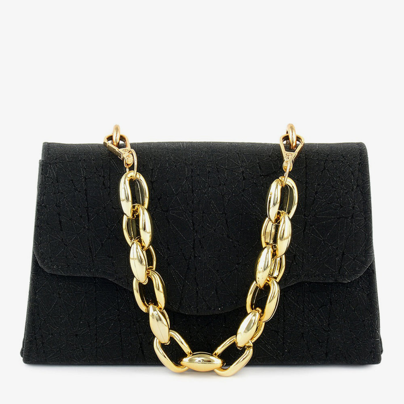 A textured black clutch features a striking, oversized gold-tone chain strap. Its simple yet elegant rectangular design with a flap closure makes it a versatile accessory for evening events. The bold chain adds a touch of modern sophistication.