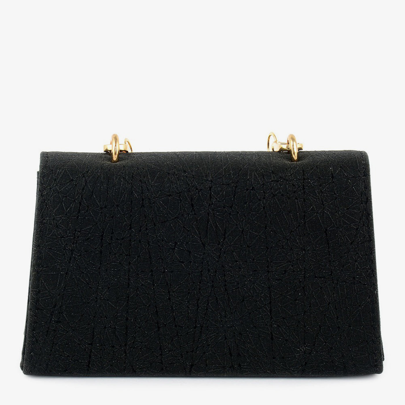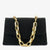 A textured black clutch features a striking, oversized gold-tone chain strap. Its simple yet elegant rectangular design with a flap closure makes it a versatile accessory for evening events....