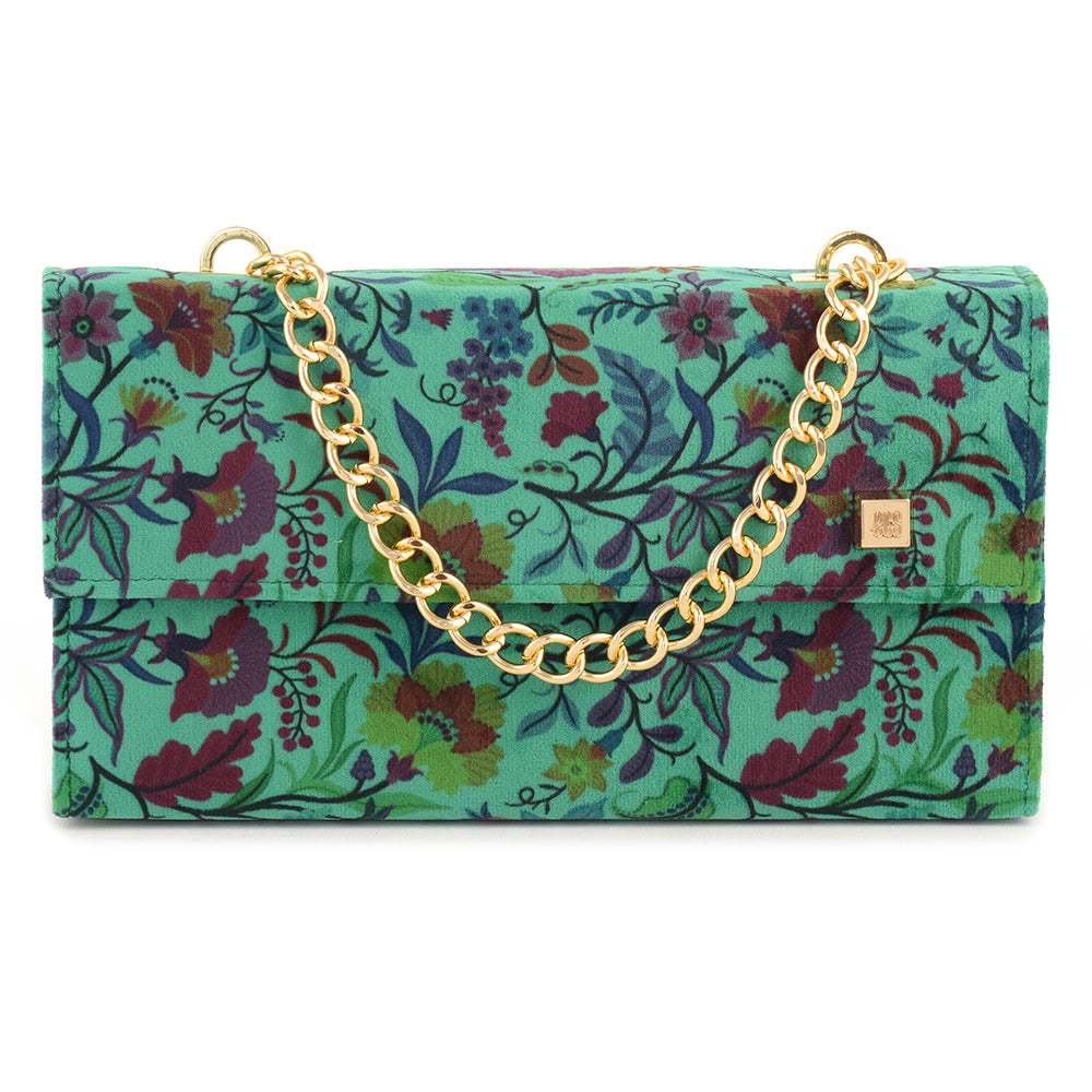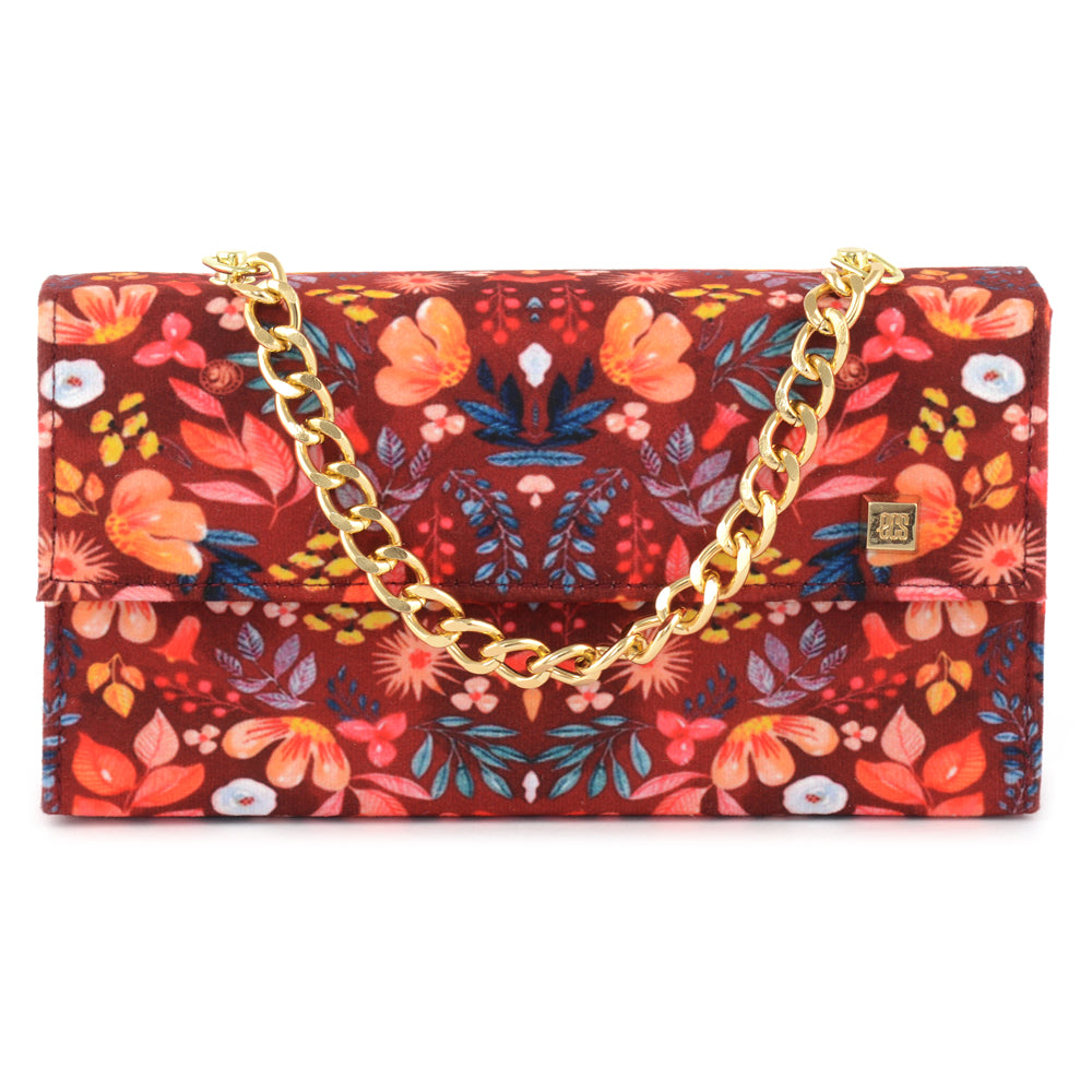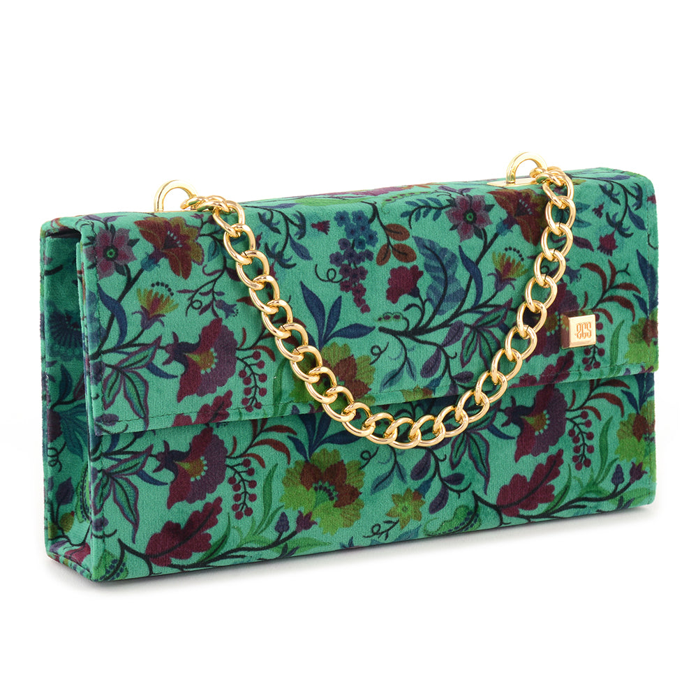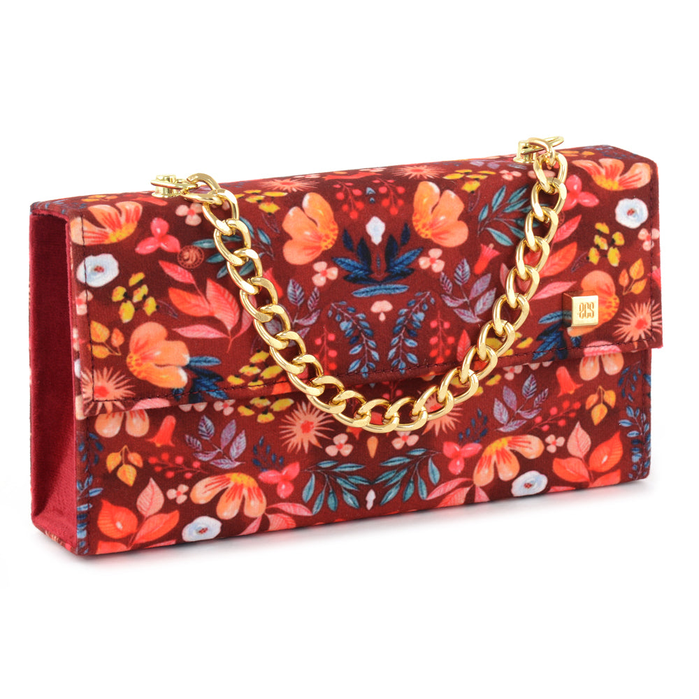 Adorned with a stunning floral pattern, this bag is a true embodiment of delicate beauty. Each petal and leaf are intricately printed on the velvet surface, creating a mesmerizing design that catches the eye and adds a touch of femininity to your ensemble. The chain handles of this bag add a touch of glamour and versatility. Wear it over your shoulder for a classic look or carry it as a handheld clutch to showcase its elegant design.
