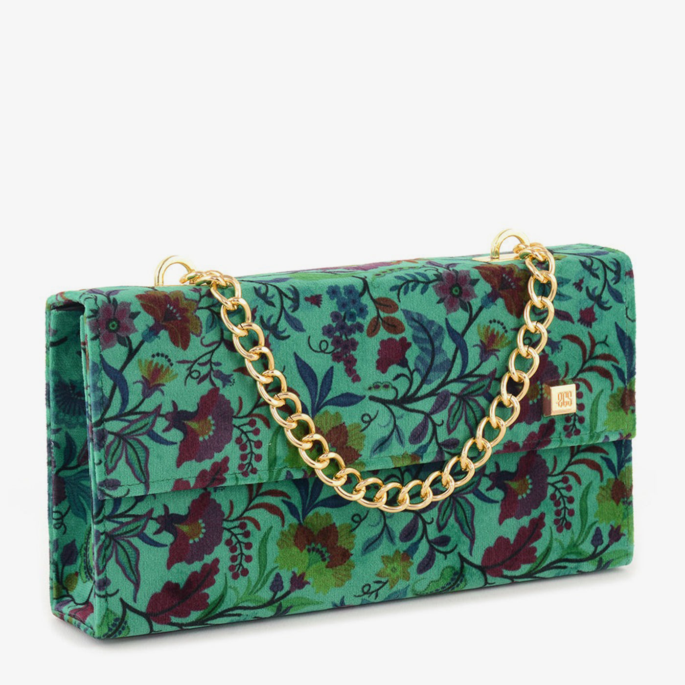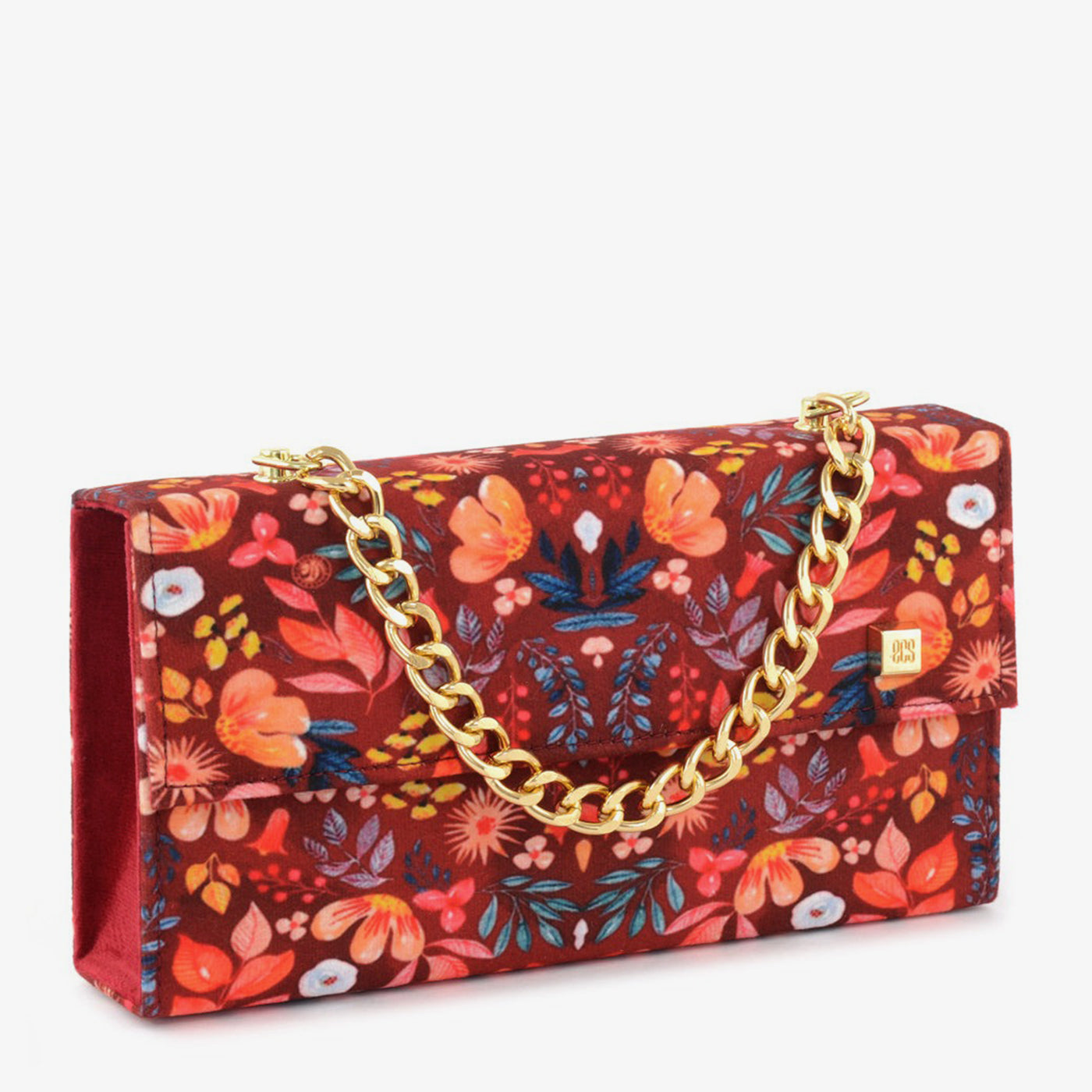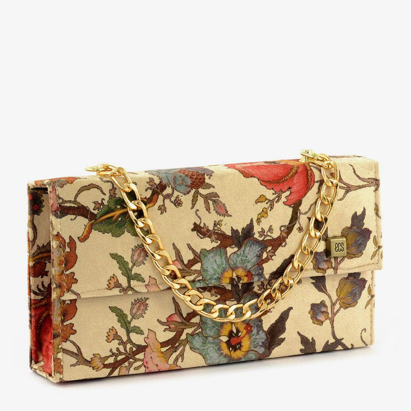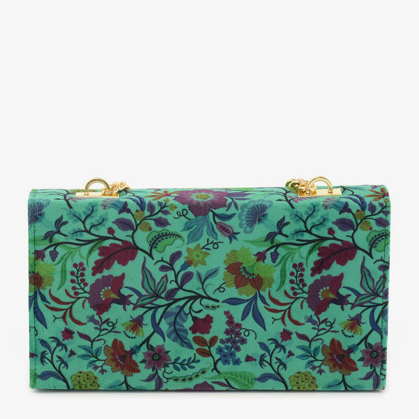 Adorned with a stunning floral pattern, this bag is a true embodiment of delicate beauty. Each petal and leaf are intricately printed on the velvet surface, creating a mesmerizing design that catches the eye and adds a touch of femininity to your ensemble. The chain handles of this bag add a touch of glamour and versatility. Wear it over your shoulder for a classic look or carry it as a handheld clutch to showcase its elegant design.