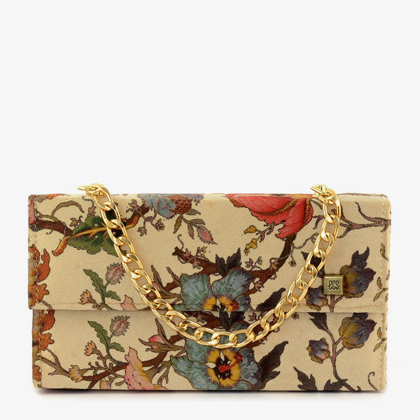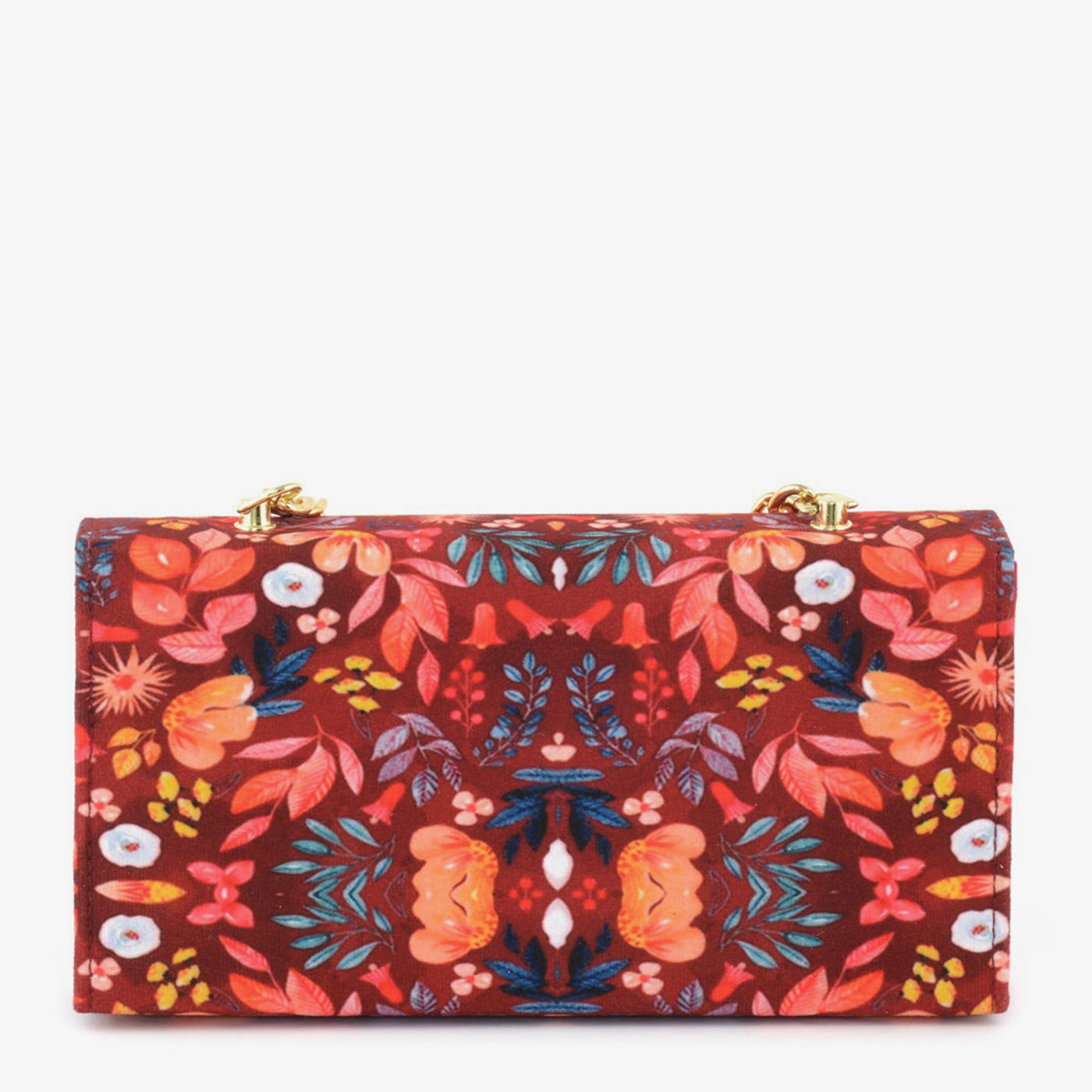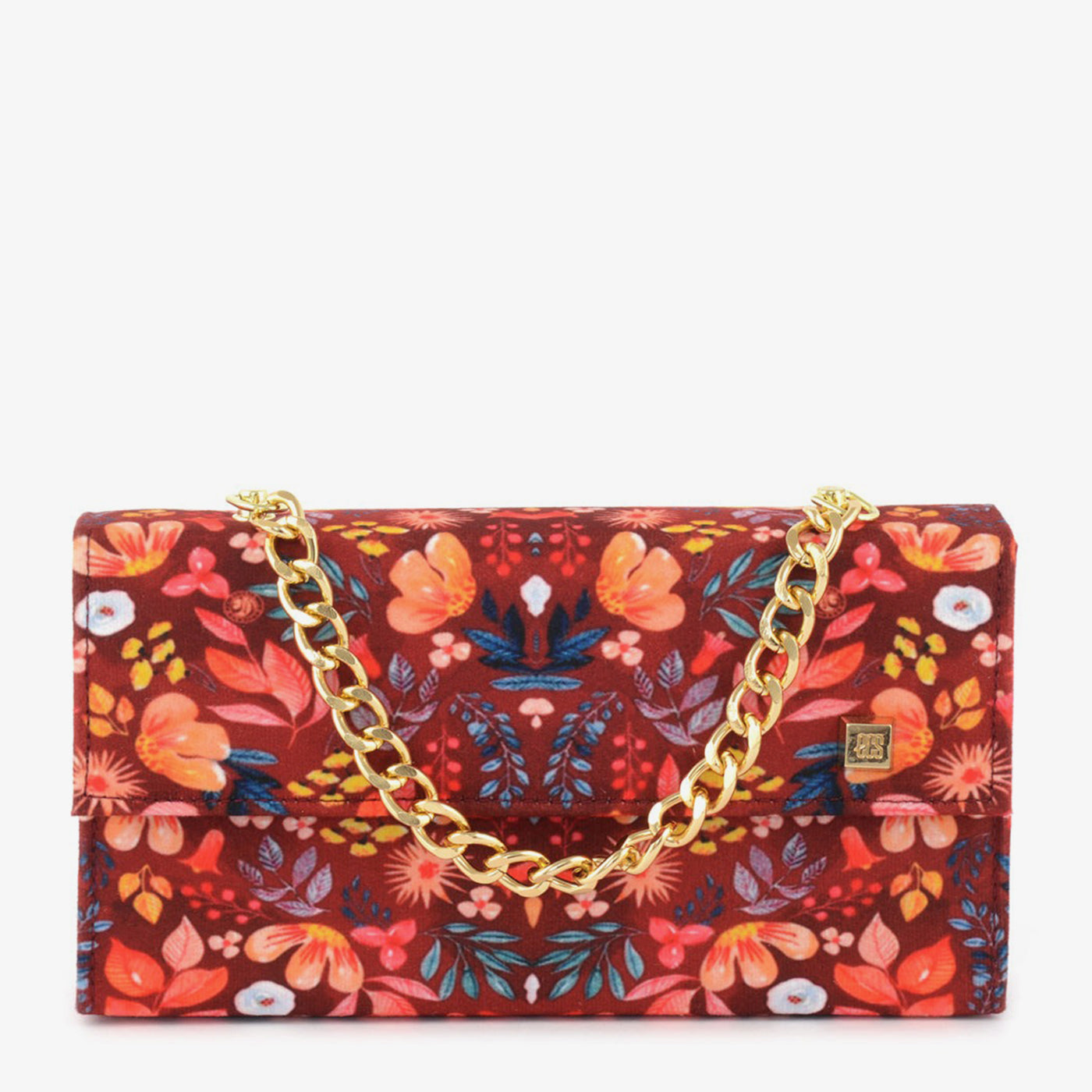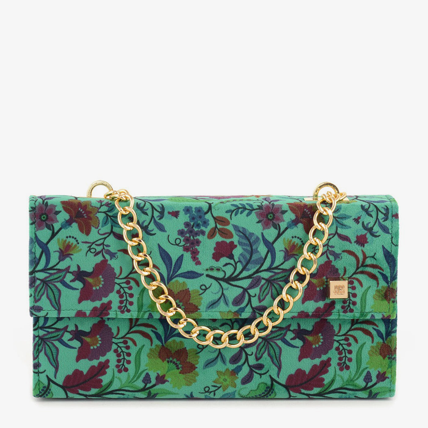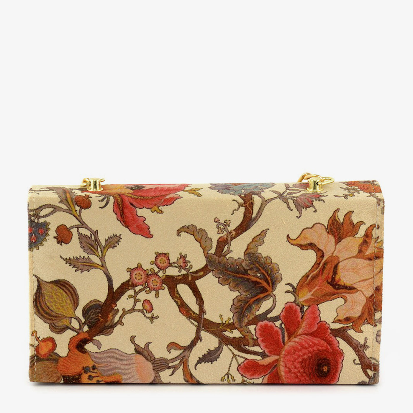 Adorned with a stunning floral pattern, this bag is a true embodiment of delicate beauty. Each petal and leaf are intricately printed on the velvet surface, creating a mesmerizing design that catches the eye and adds a touch of femininity to your ensemble. The chain handles of this bag add a touch of glamour and versatility. Wear it over your shoulder for a classic look or carry it as a handheld clutch to showcase its elegant design.