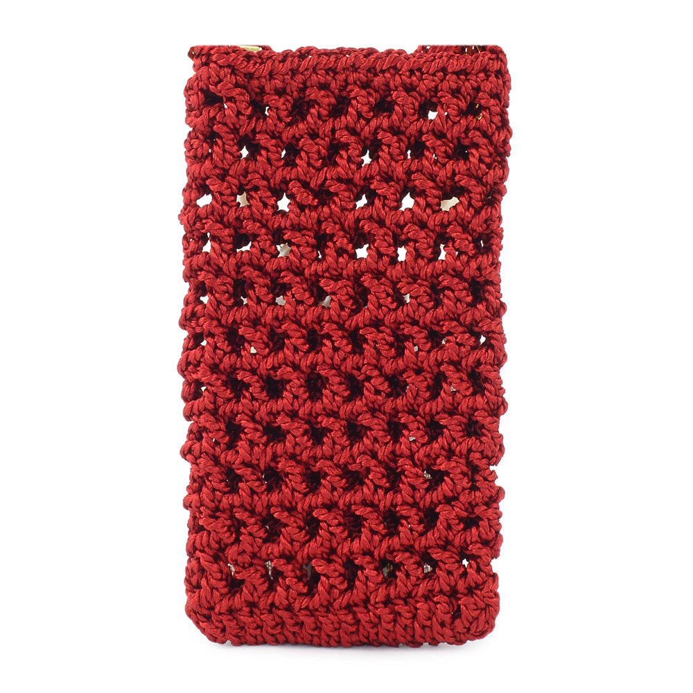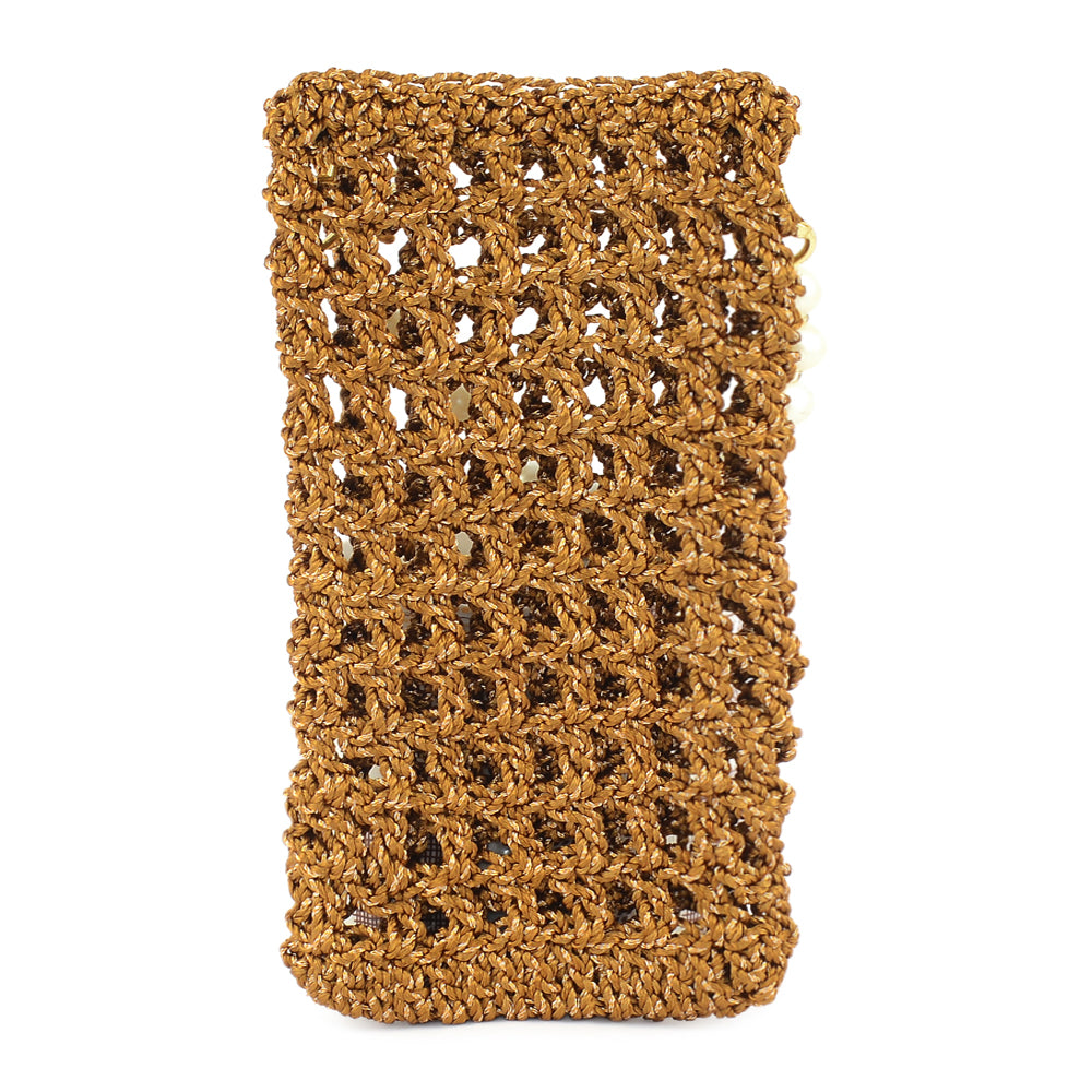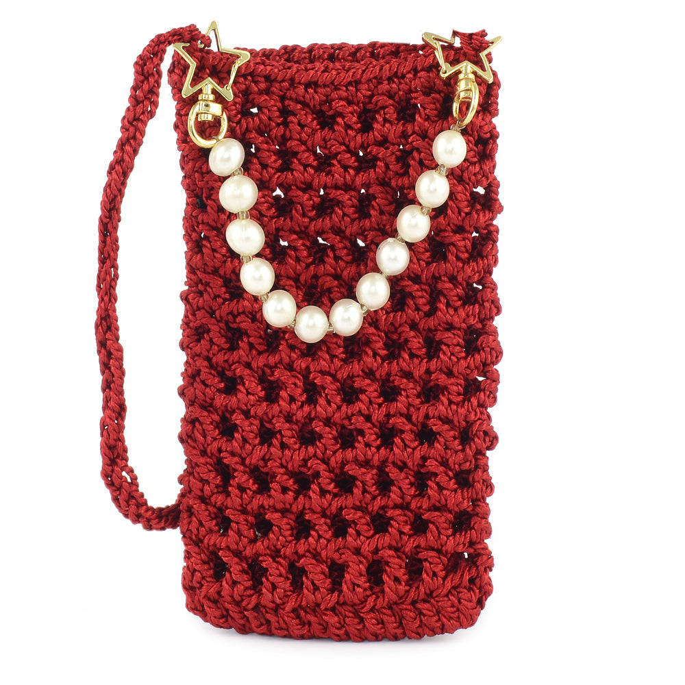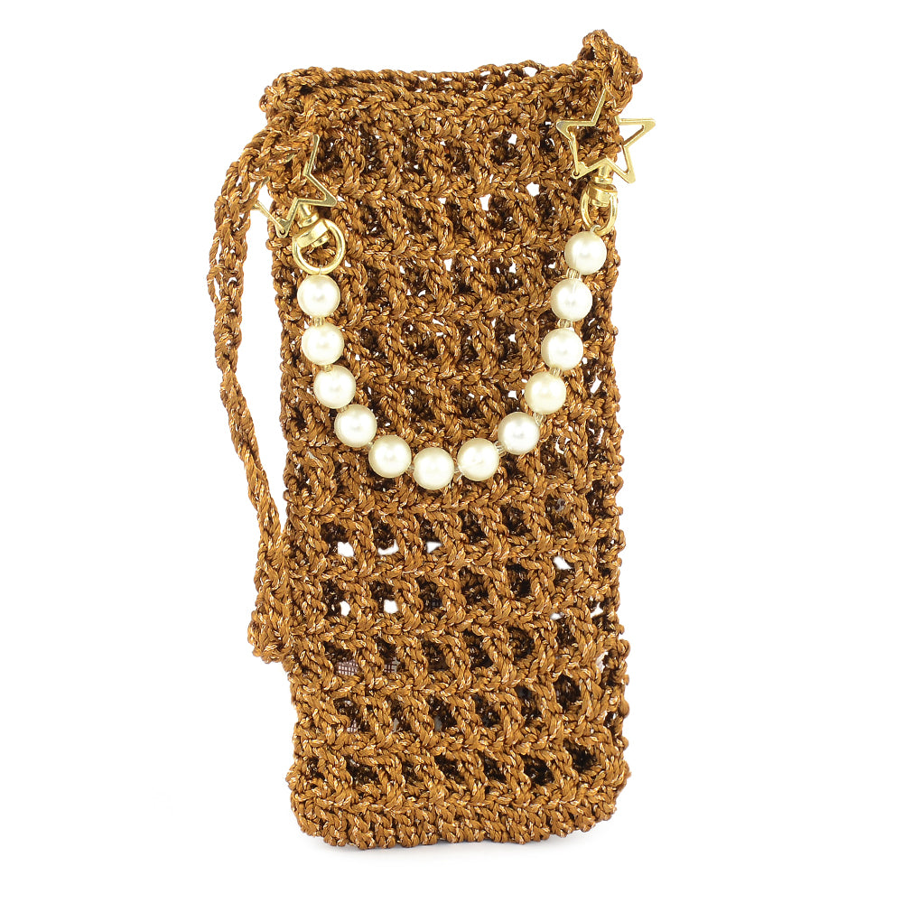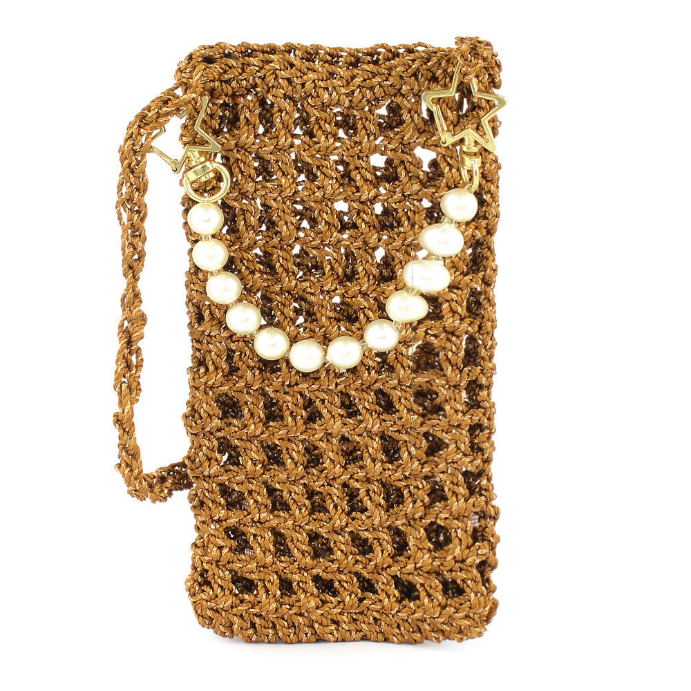 A compact clutch adorned with a grid of shimmering studs, finished with a unique wrist strap. The angled structure adds dimension to its sleek design.