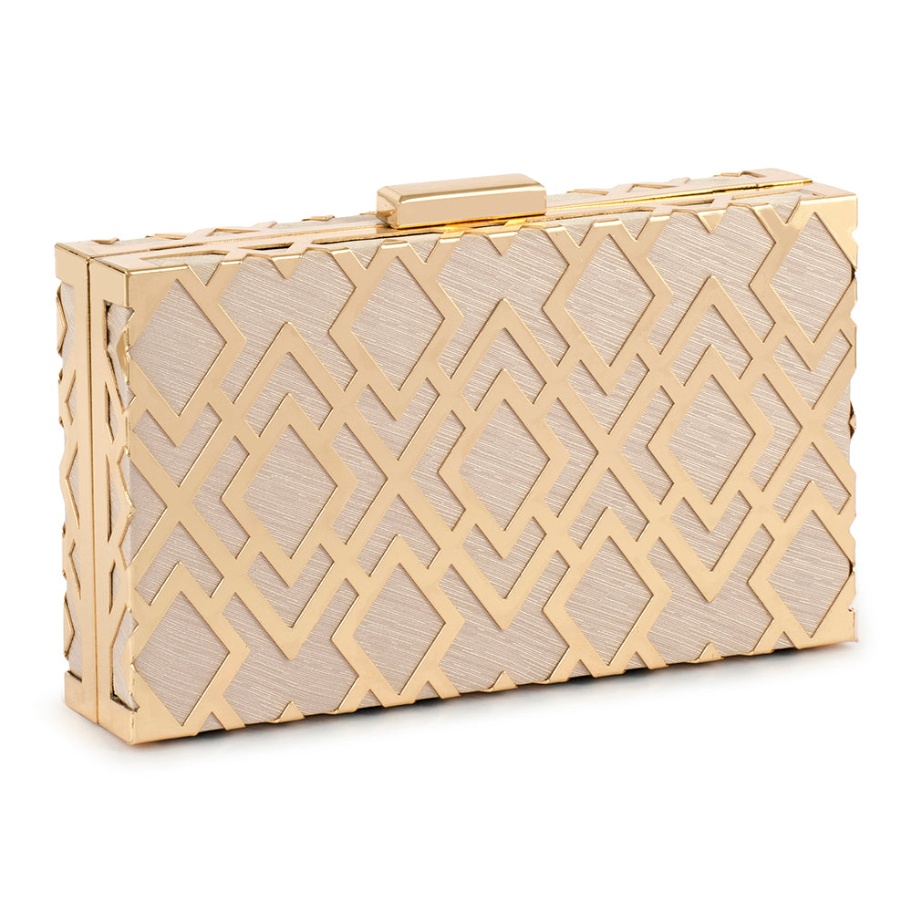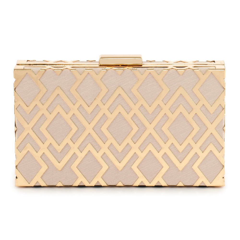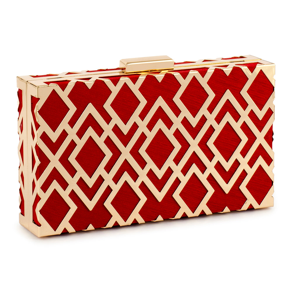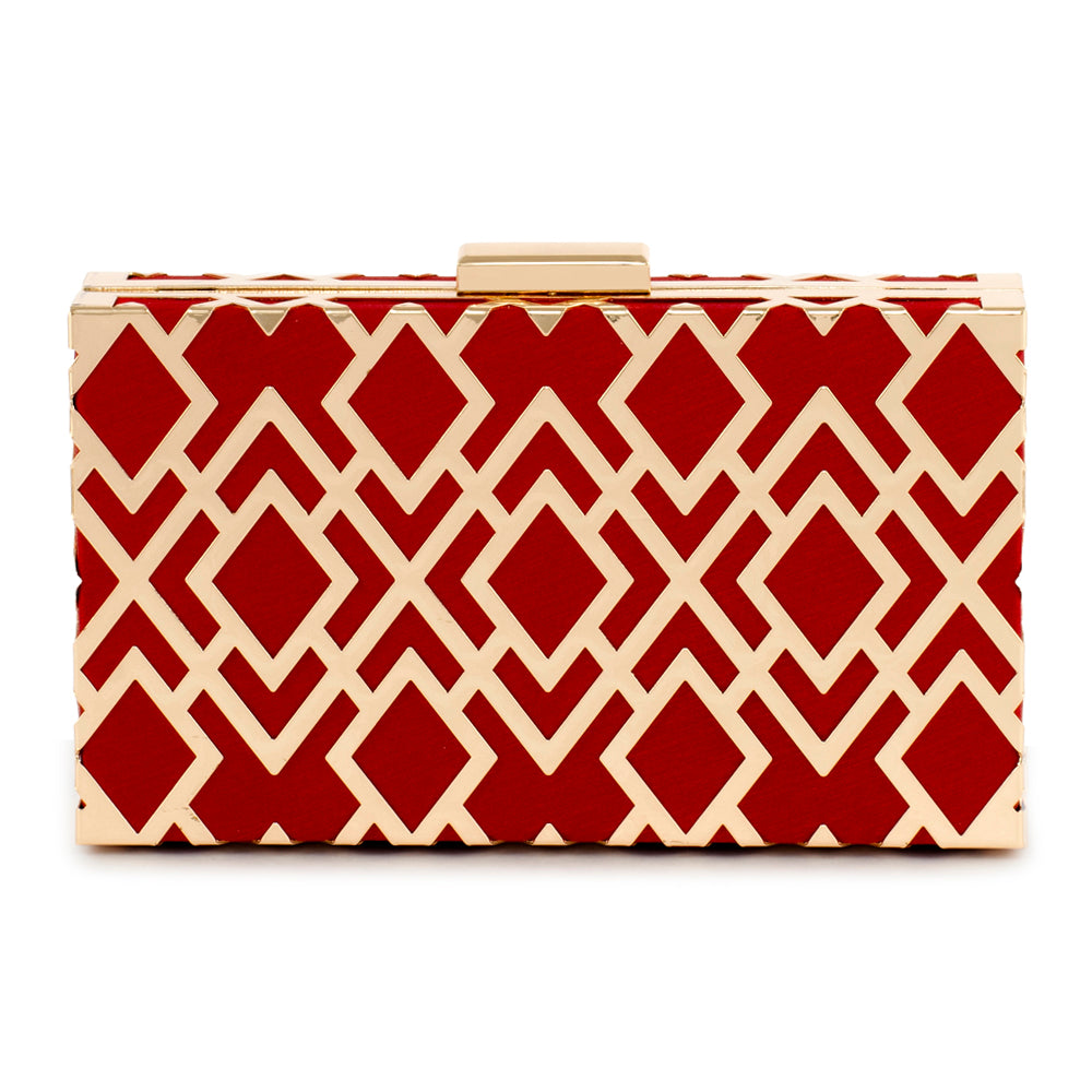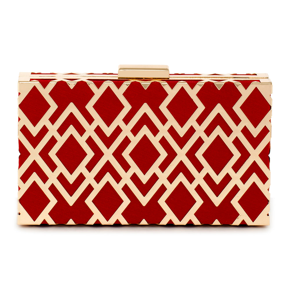 Make a striking statement with the Vierra Geo Clutch, featuring a bold red velvet base accented by a symmetrical gold geometric overlay. This sleek and structured clutch exudes confidence and modern elegance, perfect for formal and festive occasions alike.