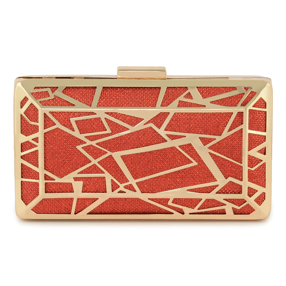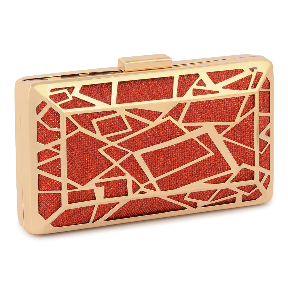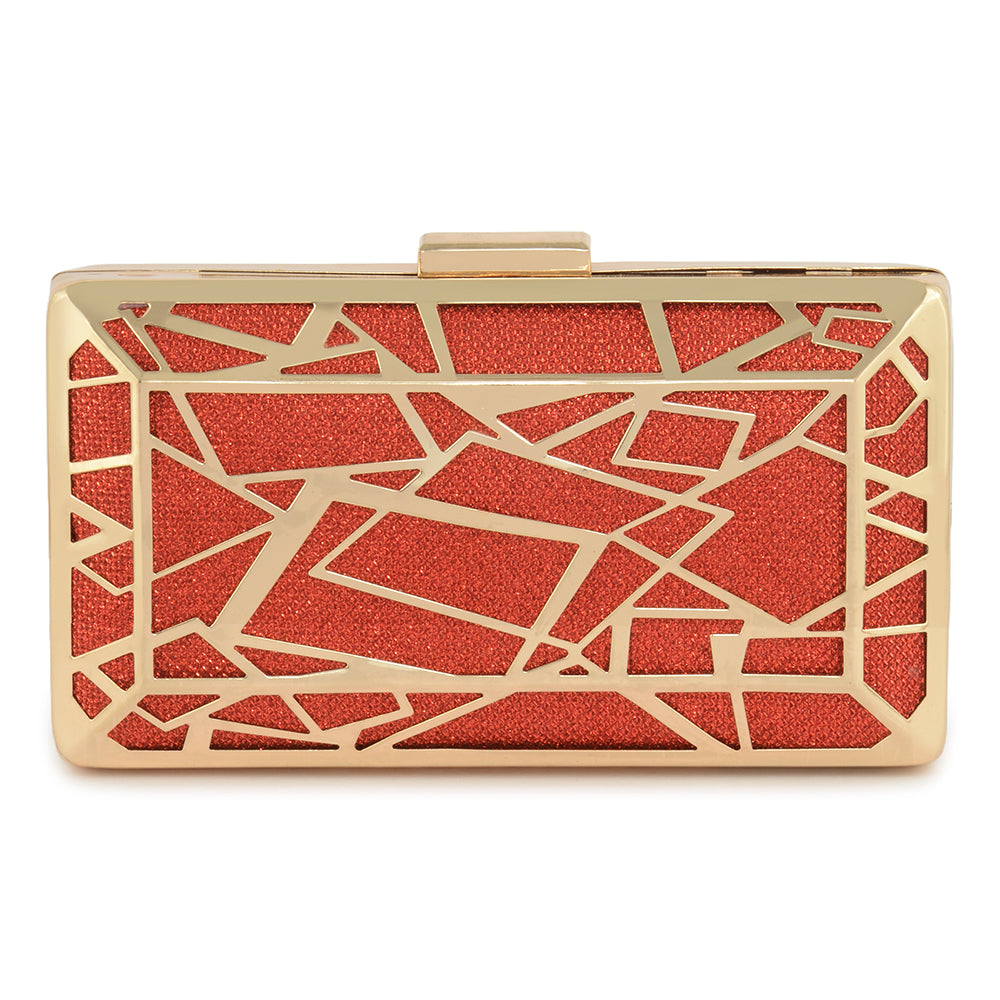 Bold and artistic, the Astra Mosaic Clutch features a geometric gold metal overlay atop a fiery red glitter base, creating a modern stained-glass effect. This structured clutch is a perfect pick for fashion-forward looks and evening glamour.