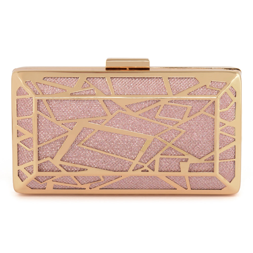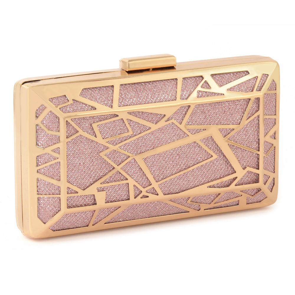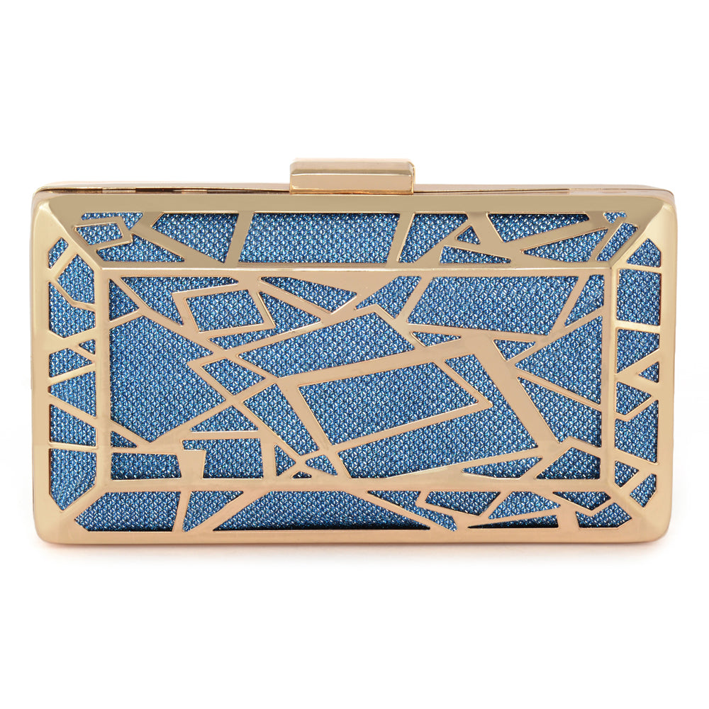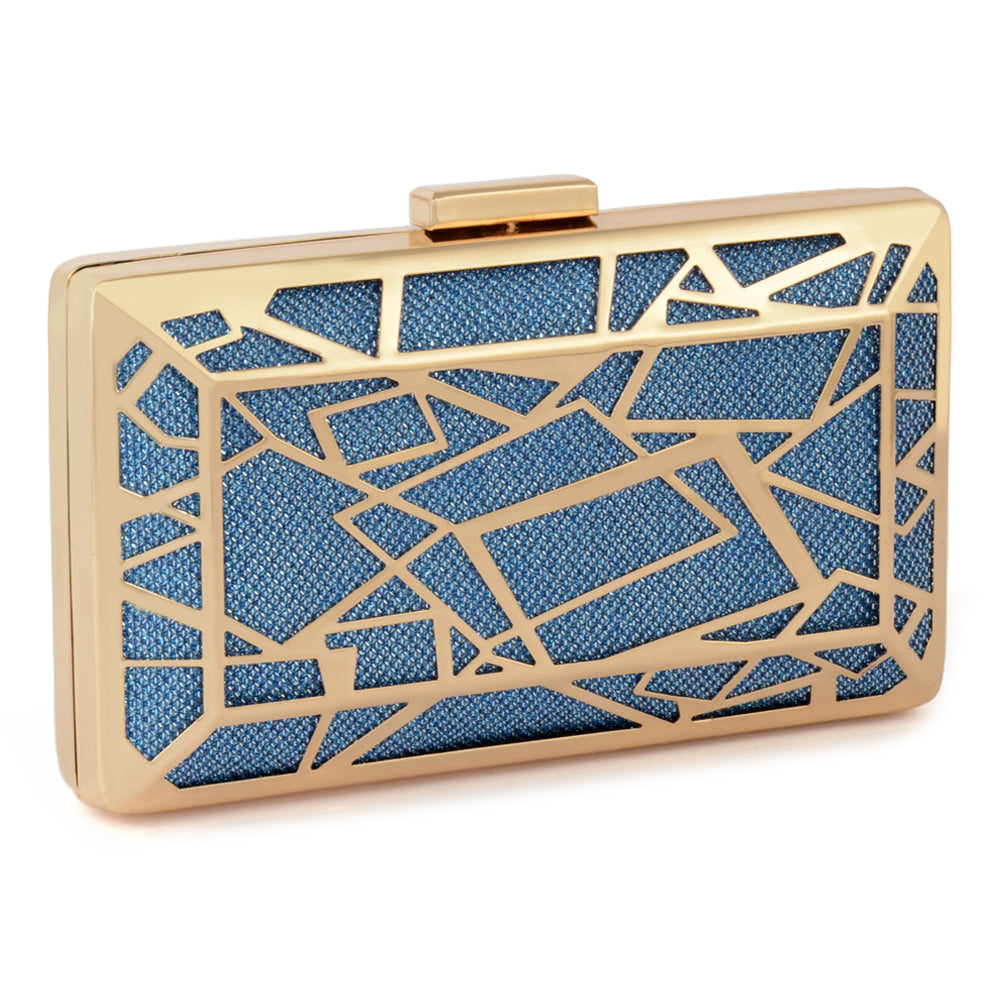 Bold and artistic, the Astra Mosaic Clutch features a geometric gold metal overlay atop a fiery red glitter base, creating a modern stained-glass effect. This structured clutch is a perfect pick for fashion-forward looks and evening glamour.
