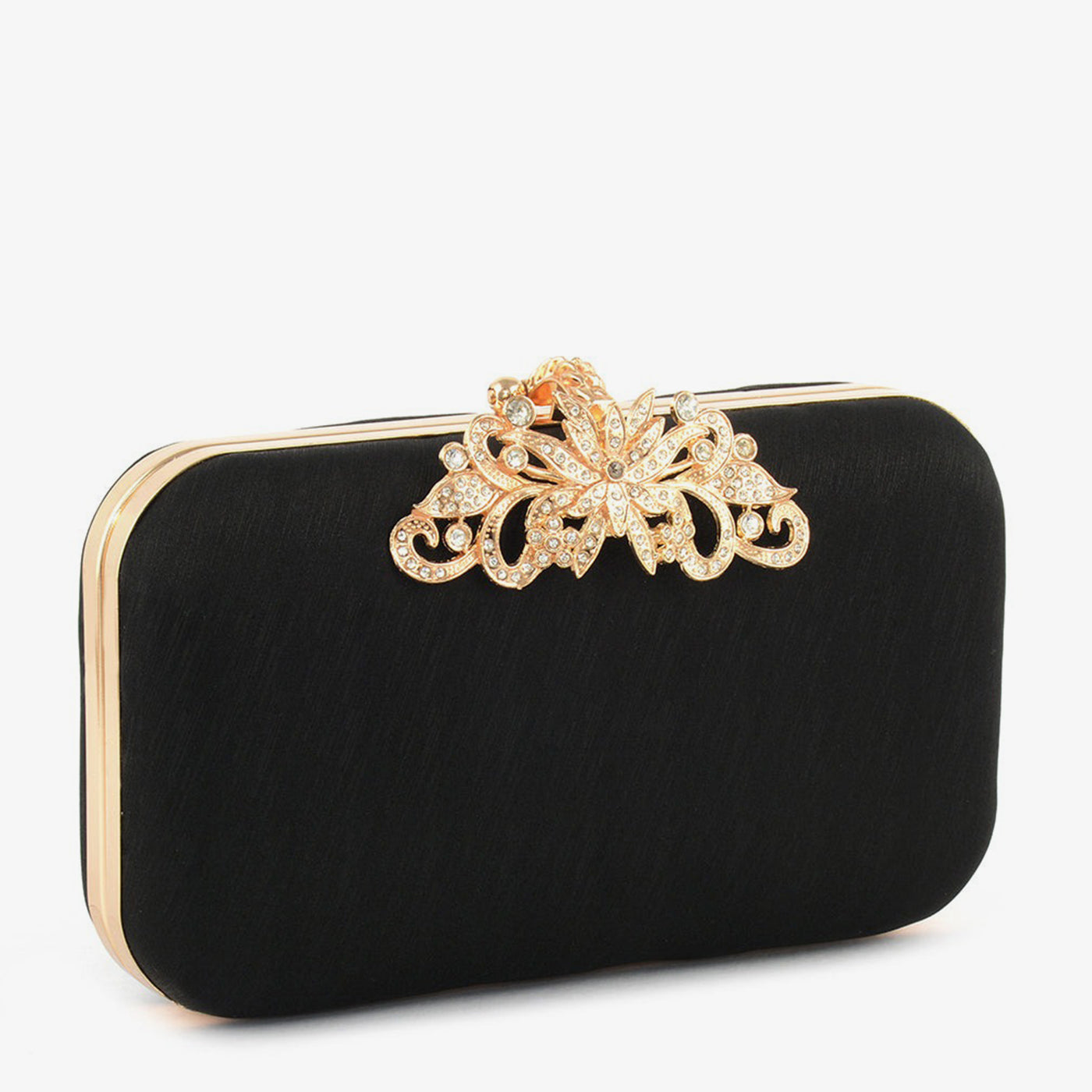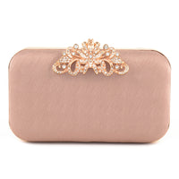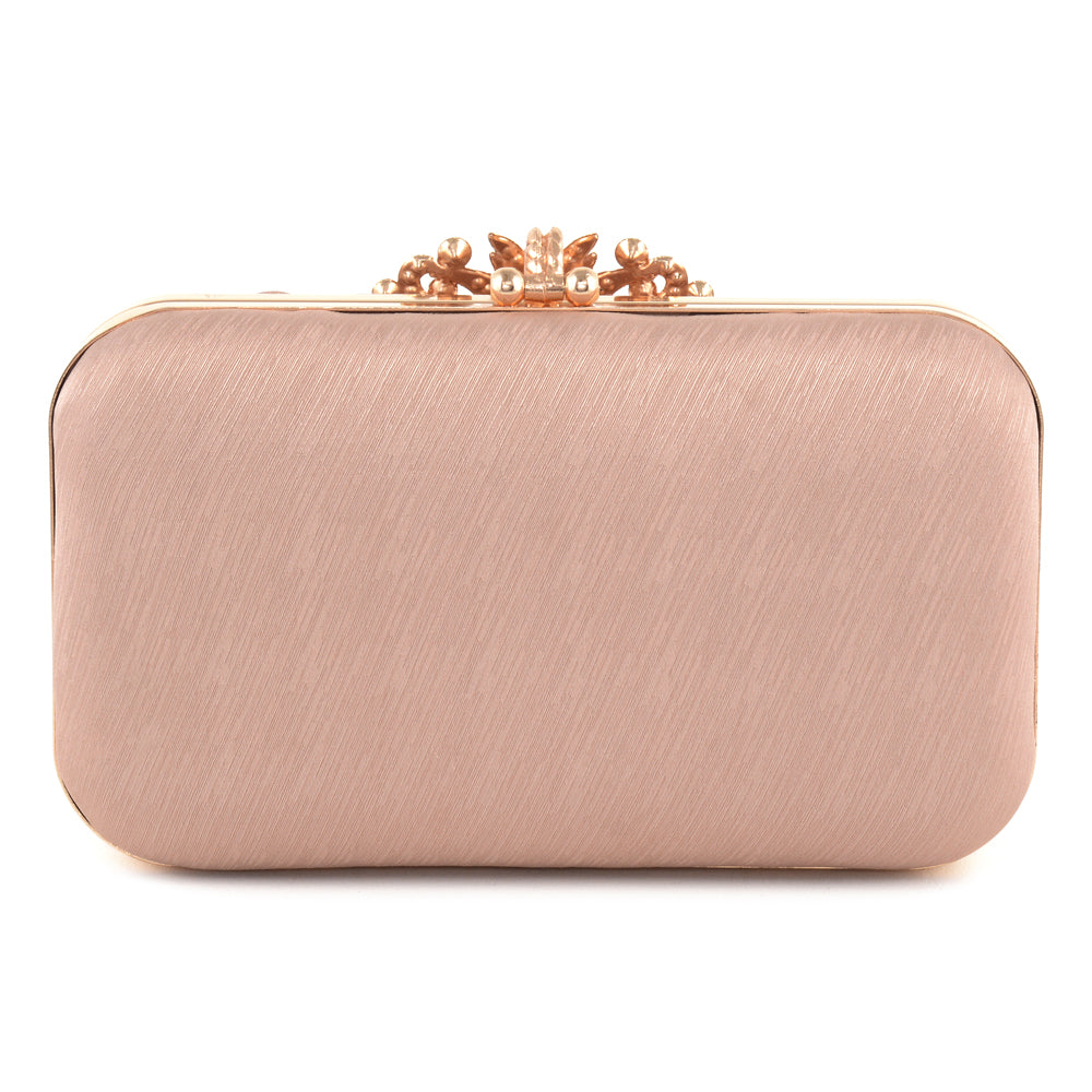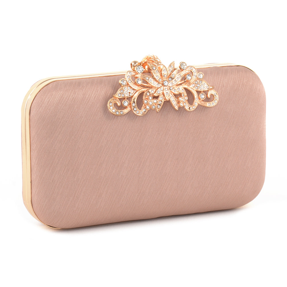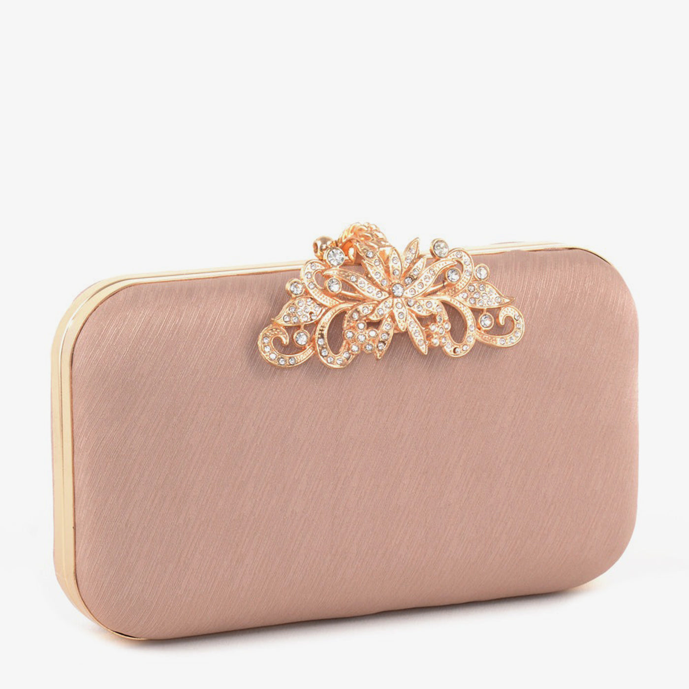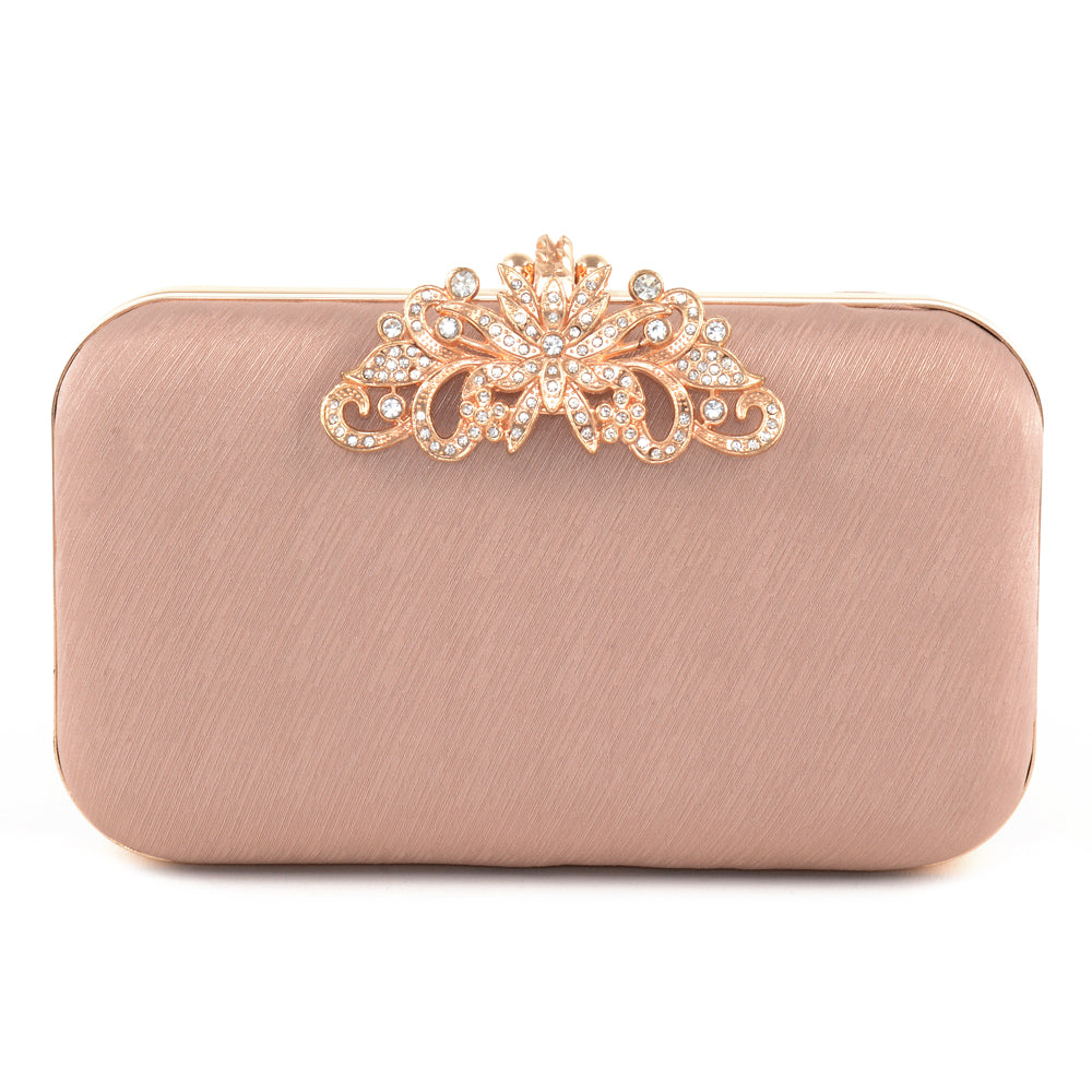 Elegant and poised, the Rosette Grace Clutch features a brushed satin finish in a warm blush tone, topped with an intricate rose gold crystal clasp. The ornate floral design adds a regal touch, making it the perfect accessory for weddings, receptions, or evening galas.