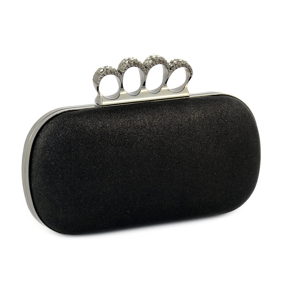 This glittery oval clutch makes a bold impression with its structured form and edgy knuckle-ring clasp. Ideal for special evenings when you want your accessories to shine.