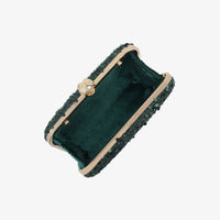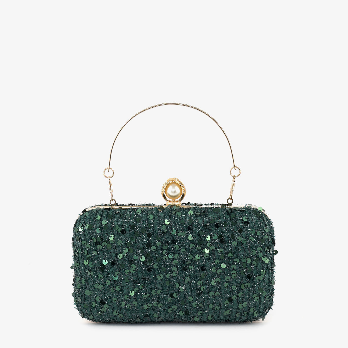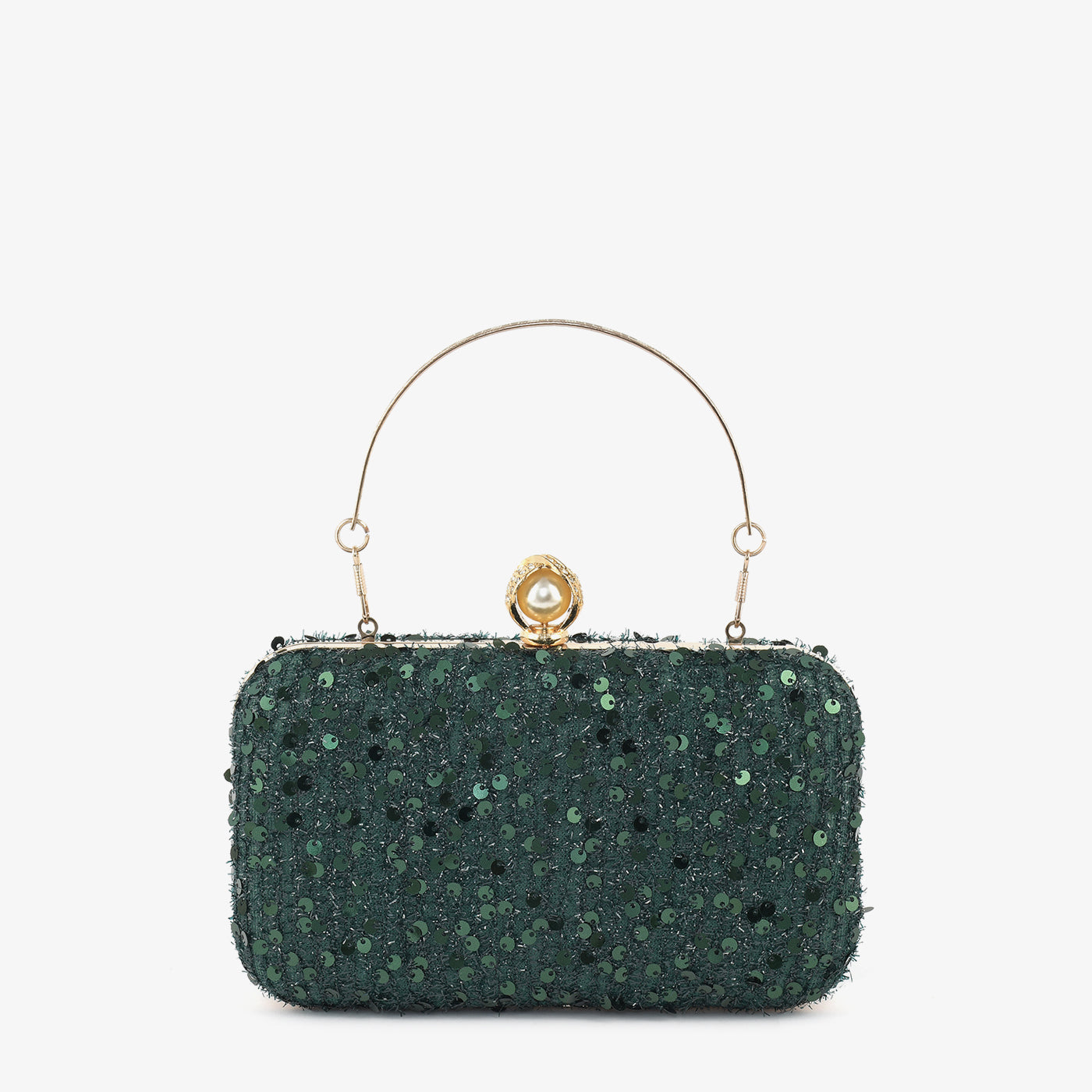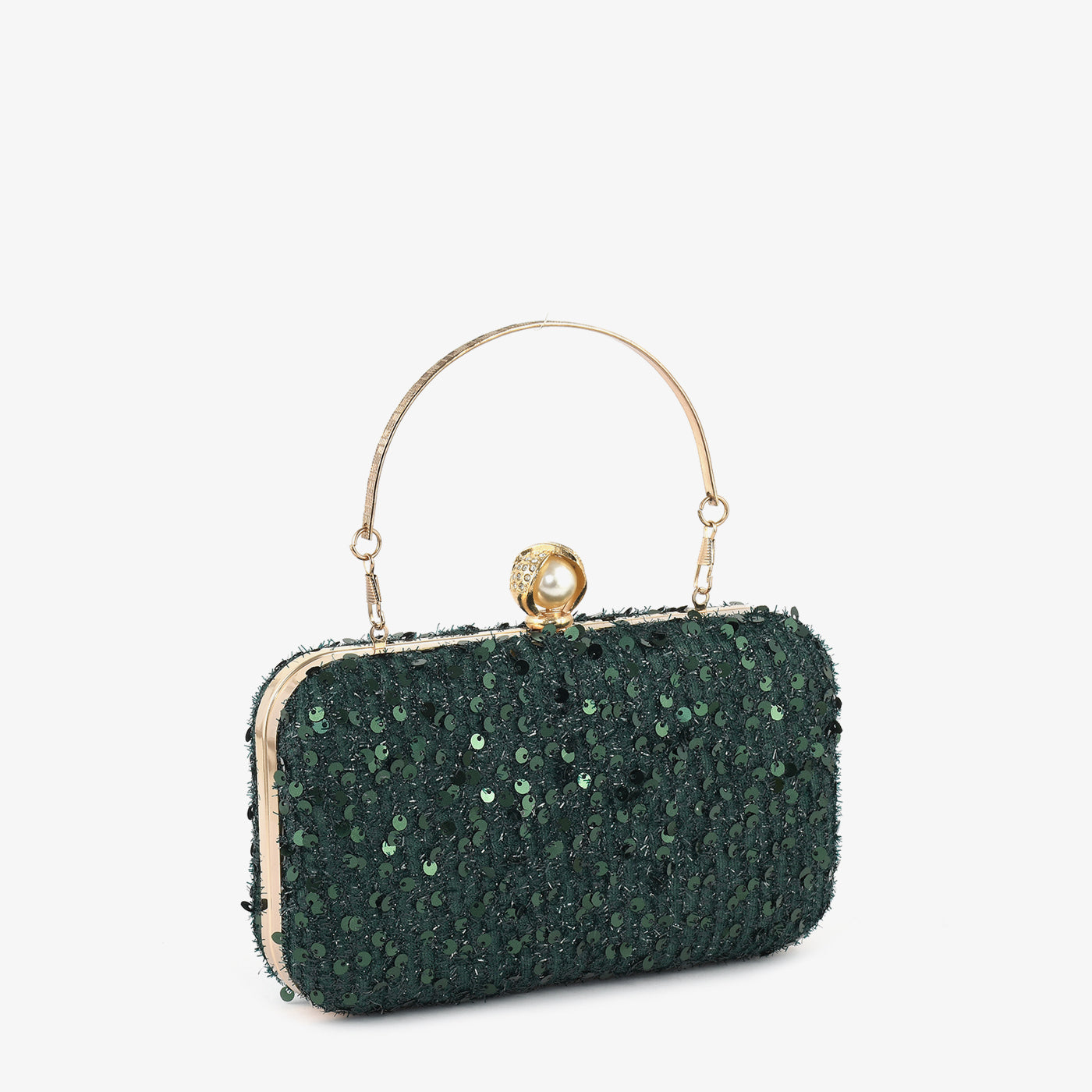 Carry a touch of opulent sparkle with the "Emerald Shimmer Clutch." This dazzling deep green clutch is fully covered in shimmering sequins and features a sophisticated clasp adorned with a faux pearl and crystals. The delicate gold-toned frame and optional top handle add a touch of timeless elegance, perfect for special occasions.