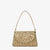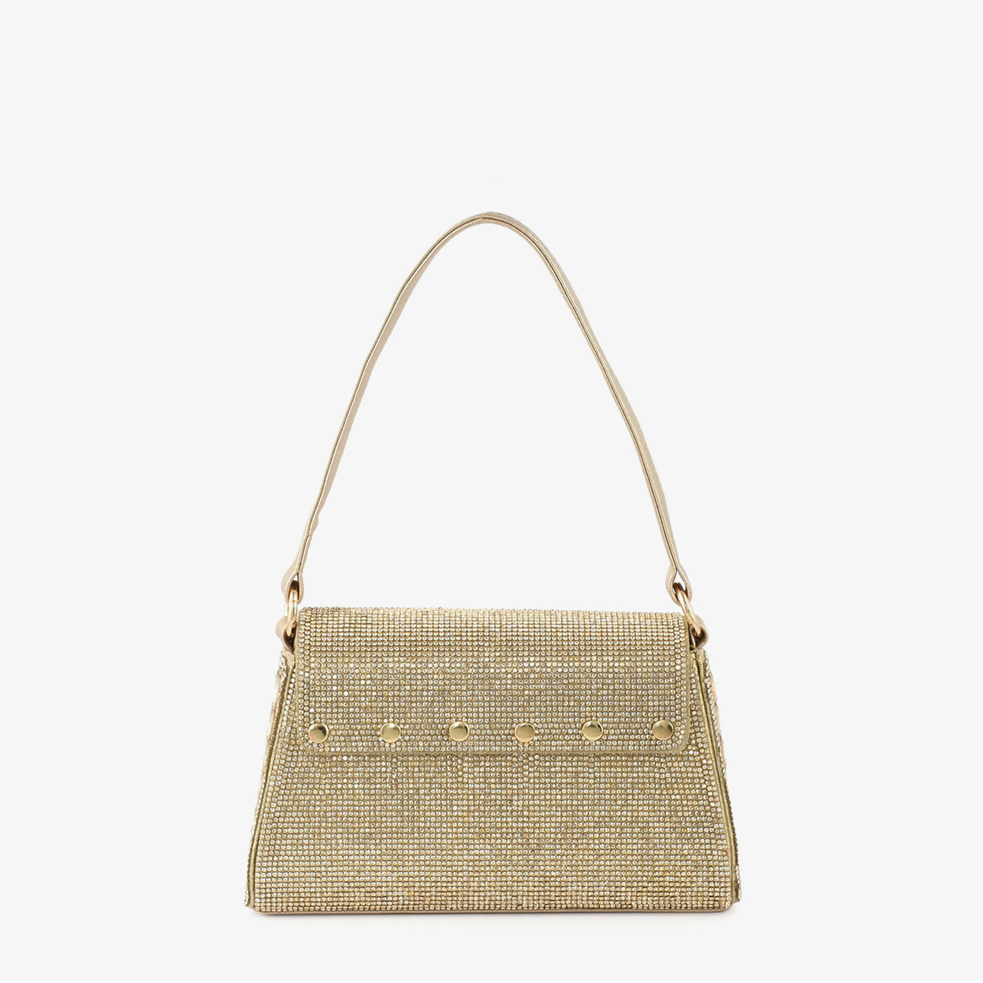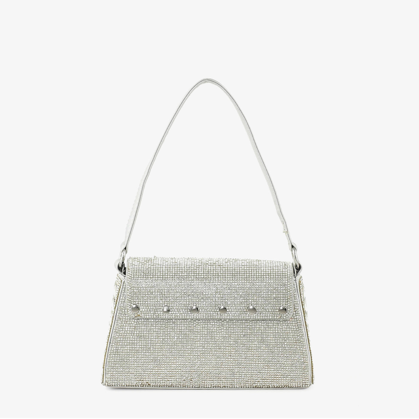 A structured clutch fully embellished with a radiating arrangement of marquise-cut faceted stones set against a base of fine round crystal pavé across the entire surface. The outward-spreading navette stone pattern gives this clutch a bold and handcrafted character suited for formal and festive occasions. A slim metallic-finish faux leather shoulder strap with a gold-tone ring attachment allows for comfortable shoulder carry. A fold-over flap with a concealed magnetic closure ensures secure fastening throughout the event. The trapezoidal structured form offers a refined and elegant silhouette for carrying essentials. This clutch suits formal gatherings, festive events, and bridal occasions with a polished finish.