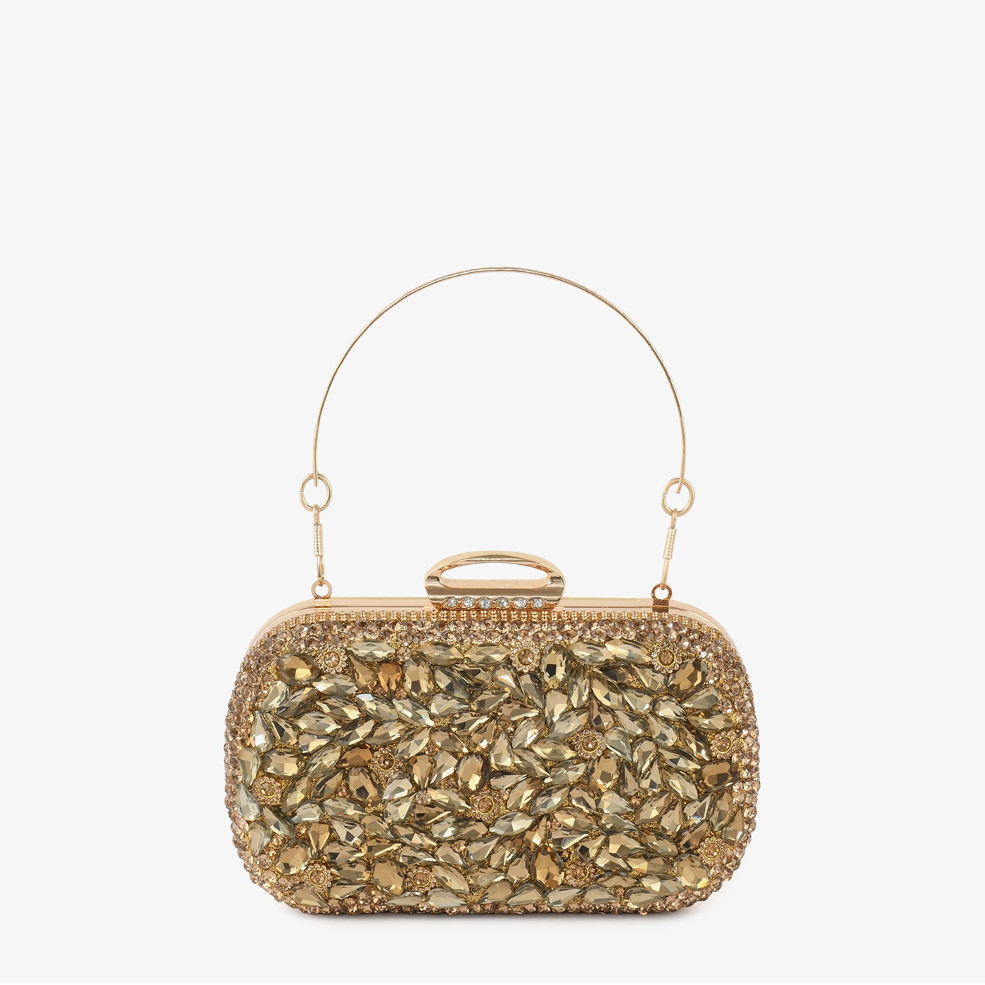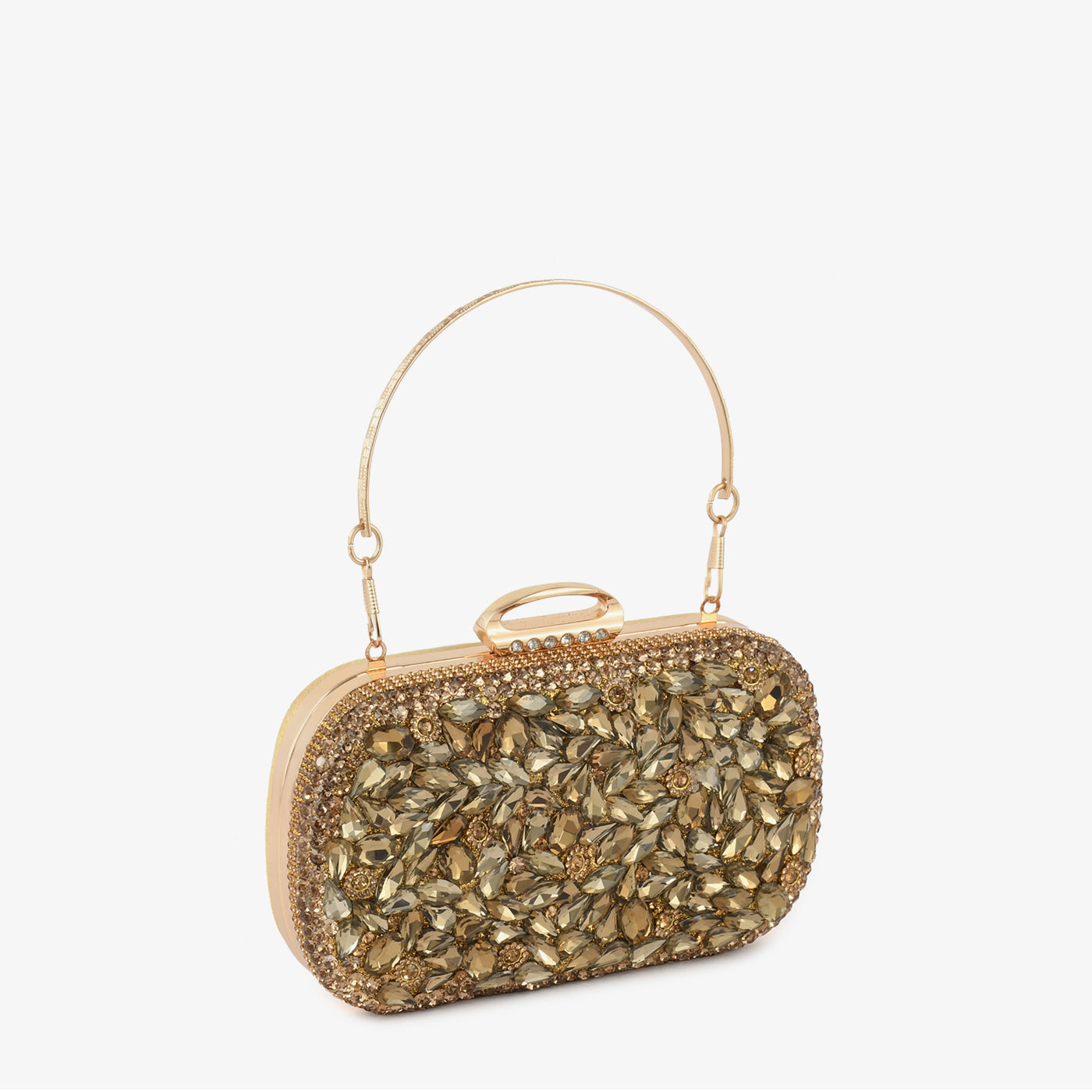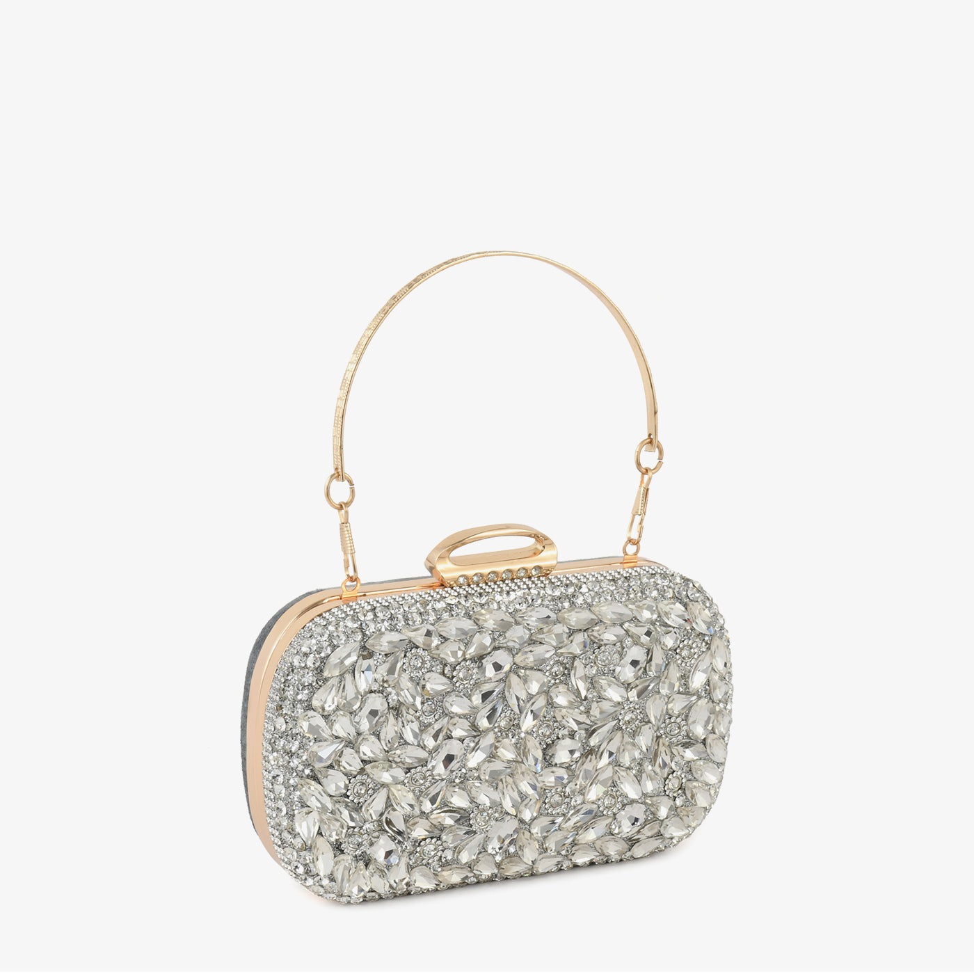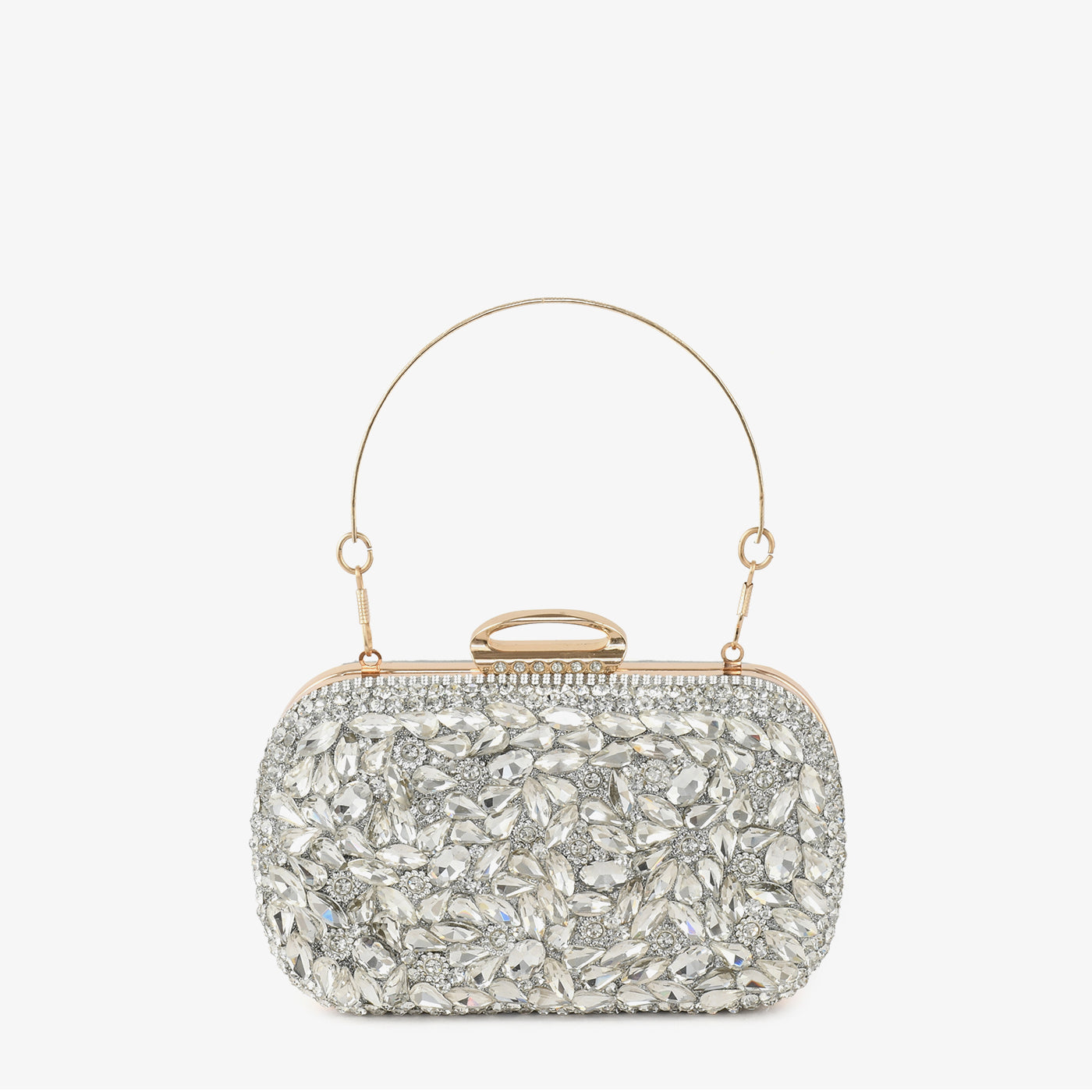 - Design: Structured box clutch with foliage stone motif, pavé border, rigid bangle top handle, and rounded rectangular silhouette