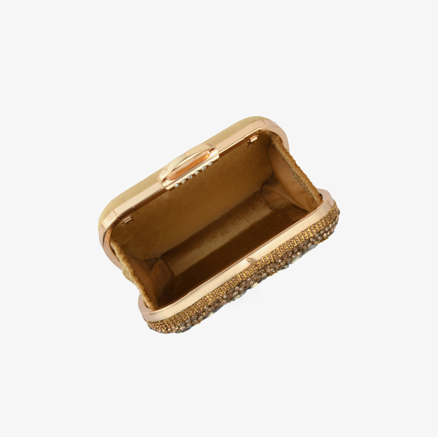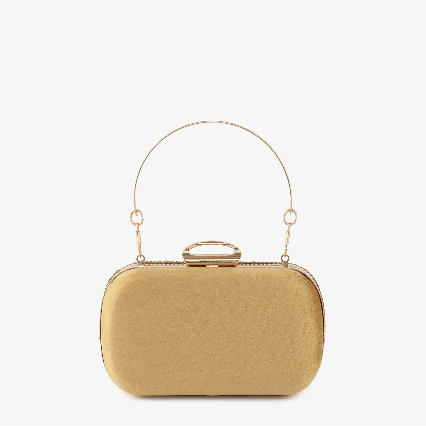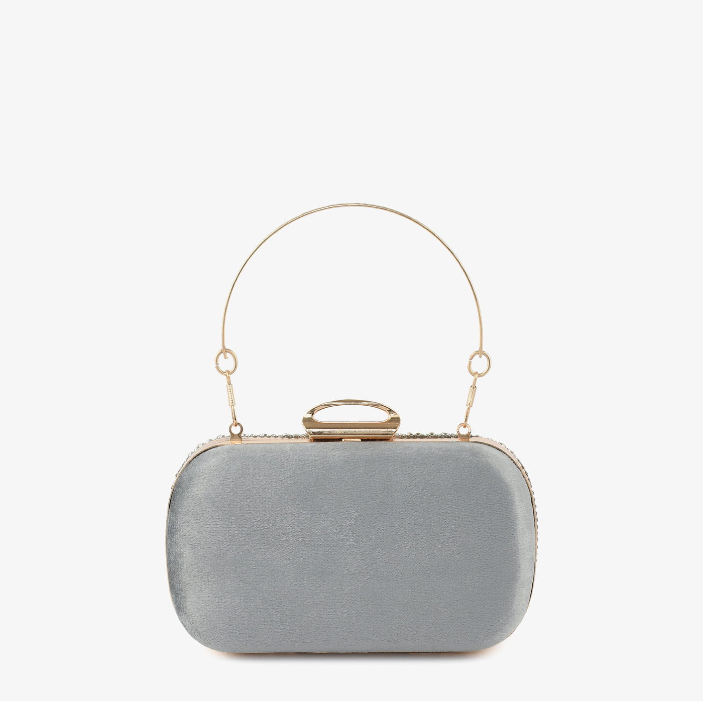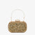 - Design: Structured box clutch with foliage stone motif, pavé border, rigid bangle top handle, and rounded rectangular silhouette