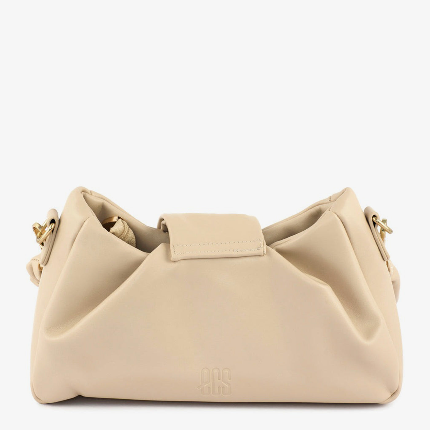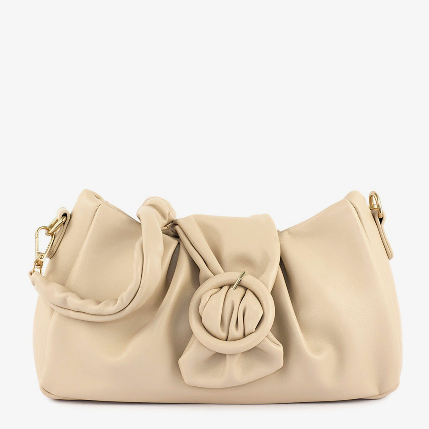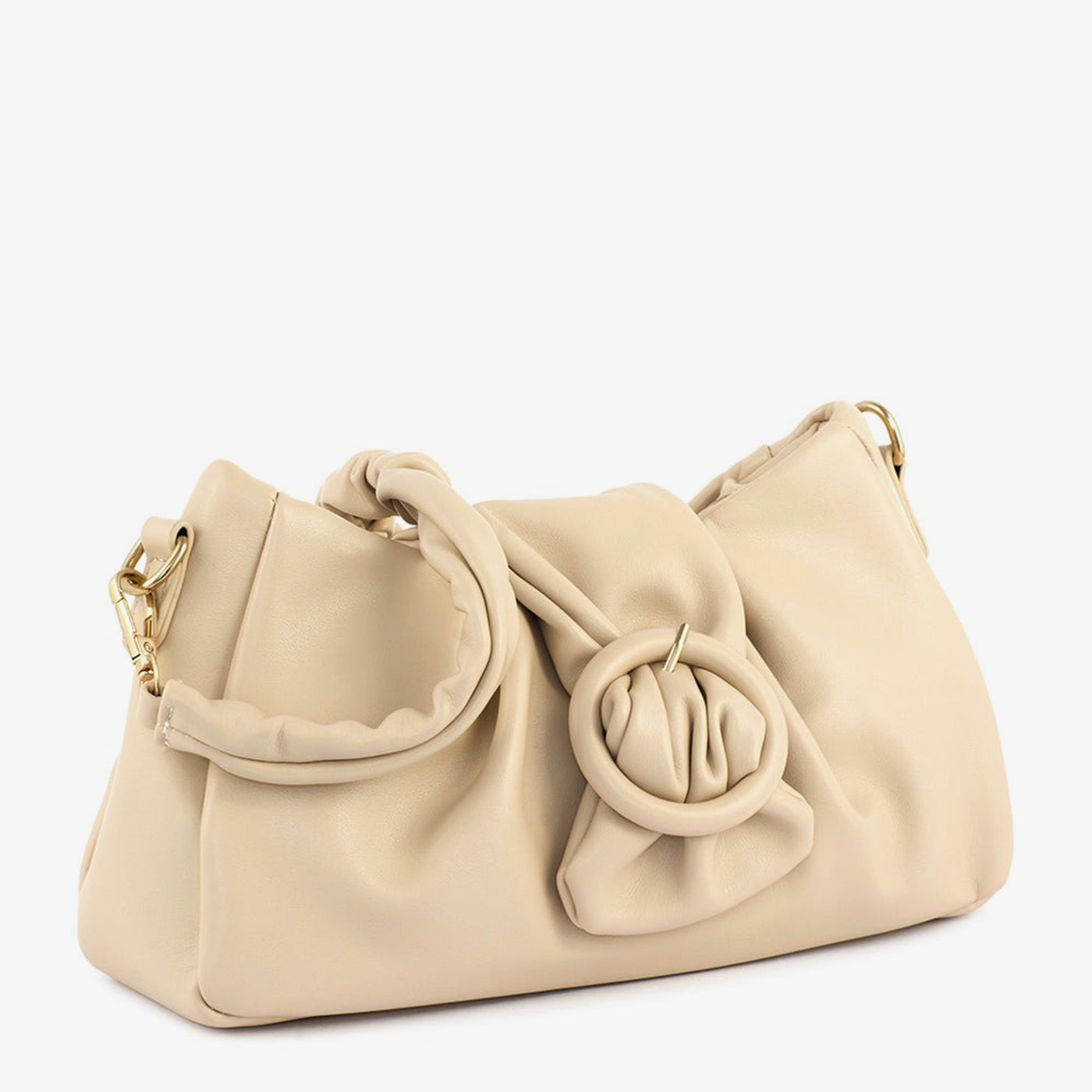 A stylish shoulder bag with a soft, gathered silhouette. It features a unique, oversized circular buckle detail on the front flap and a comfortable shoulder strap.