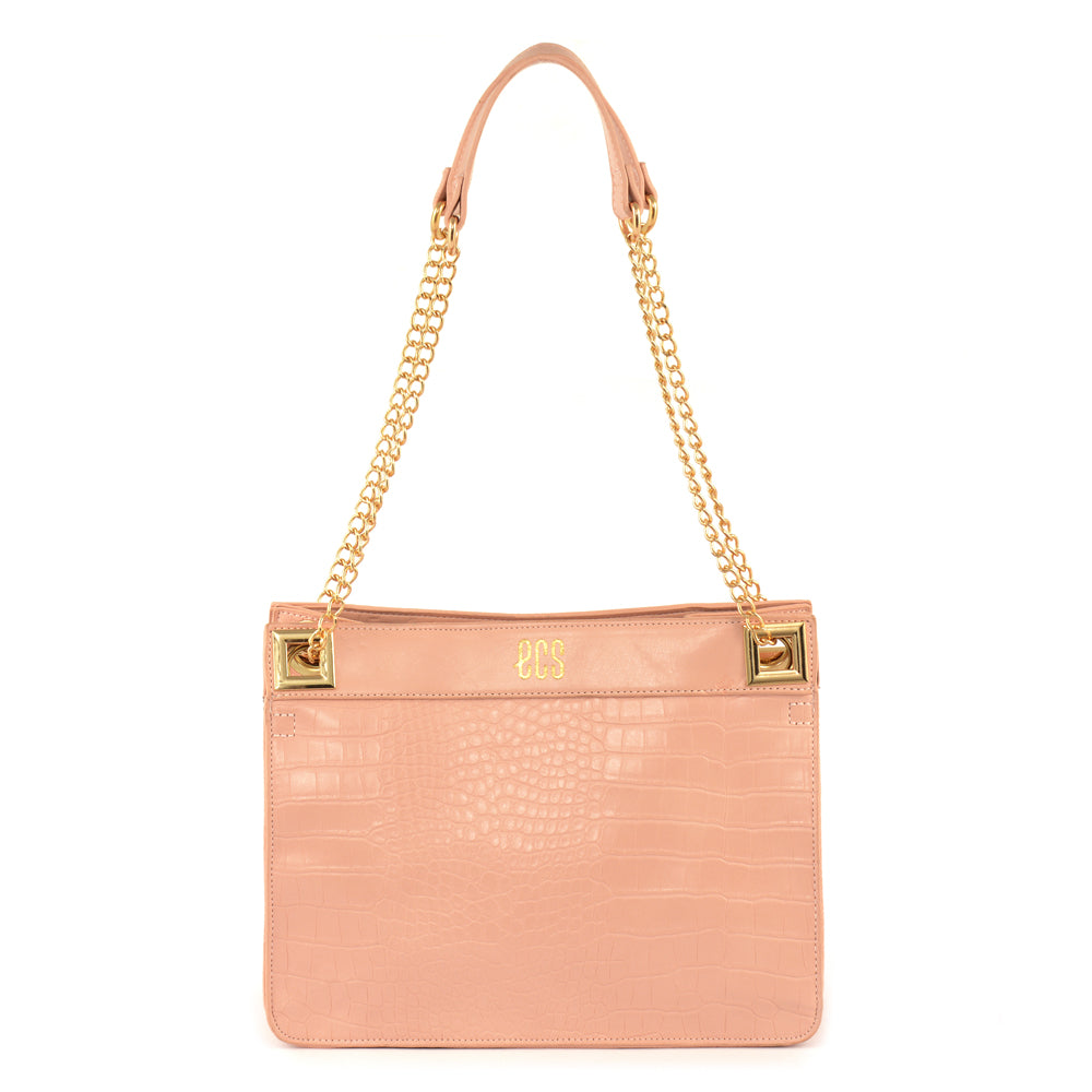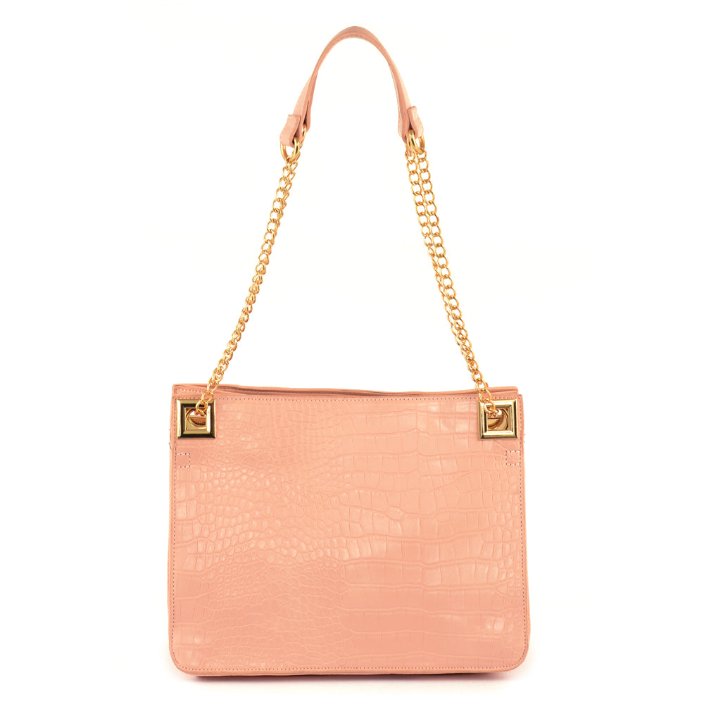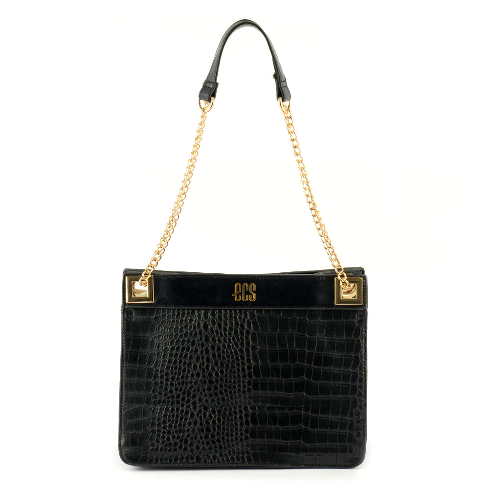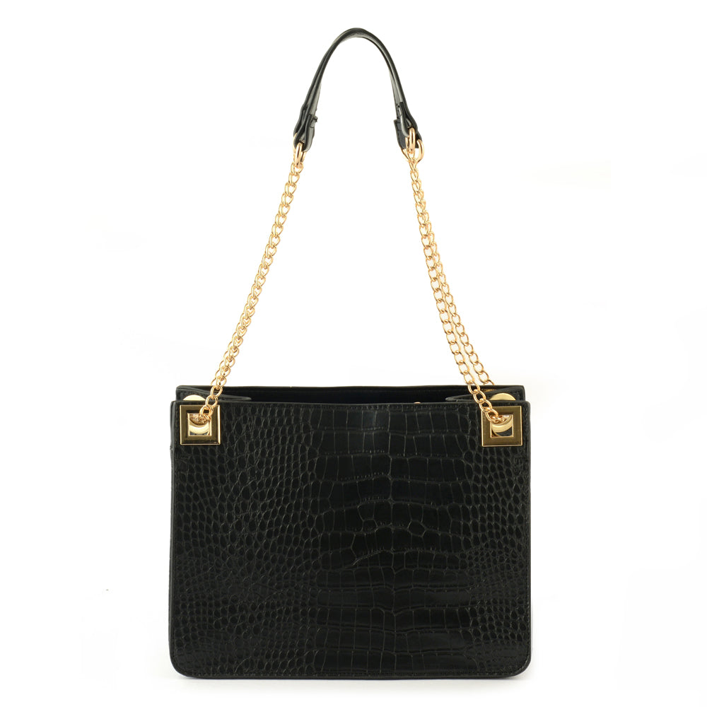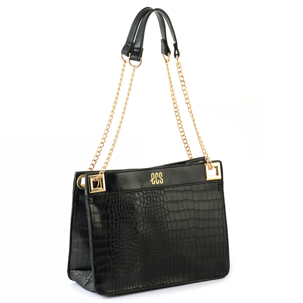 Refined and structured, this handbag features a sleek textured surface with a glossy panel and a striking gold chain handle. The rectangular silhouette adds a contemporary polish to your ensemble.
