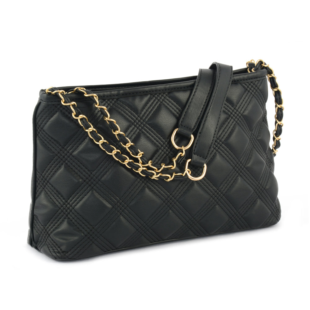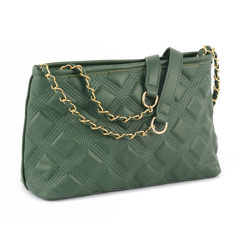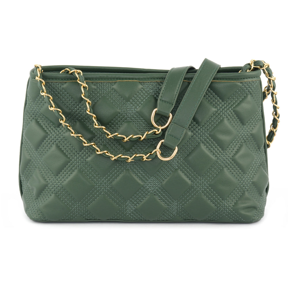 Make a bold statement with the "Emerald Chain Tote." Its quilted texture and gold-tone chain straps add a luxurious touch, perfect for casual or semi-formal outings. The spacious interior ensures functionality without sacrificing style.