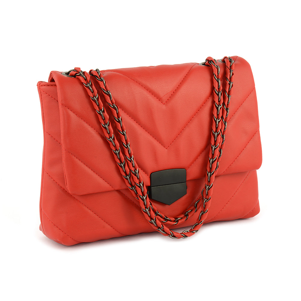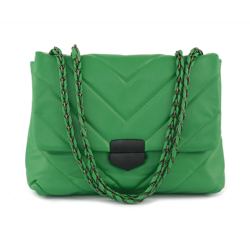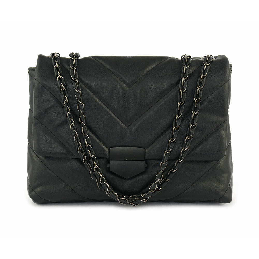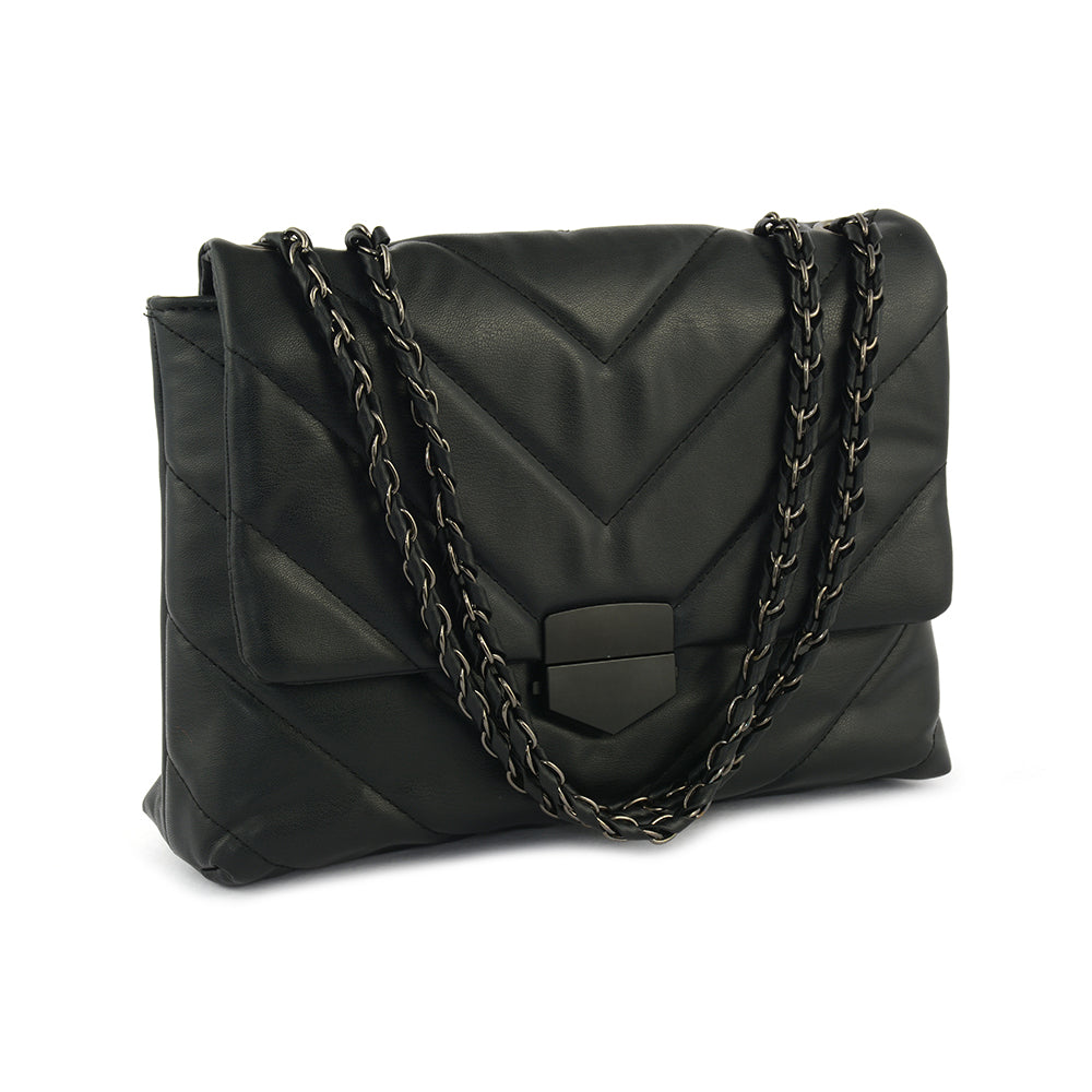 Bold yet refined, this quilted shoulder bag showcases a sharp chevron pattern with a dual chain strap. Its soft finish and flap closure strike the right balance between modern edge and practicality.