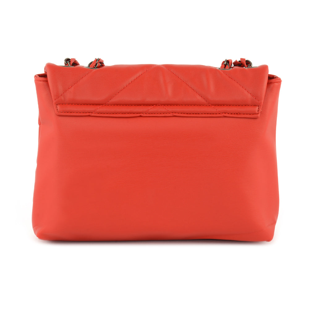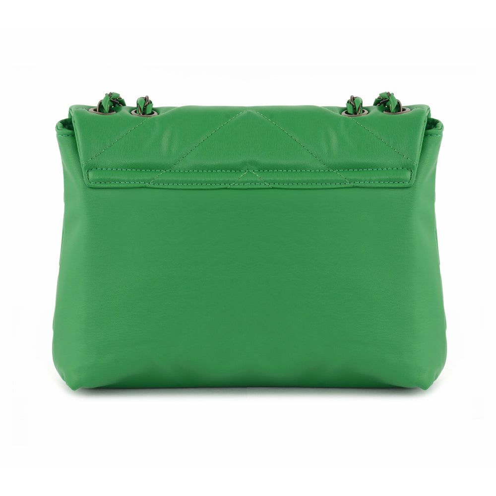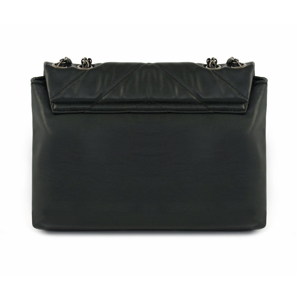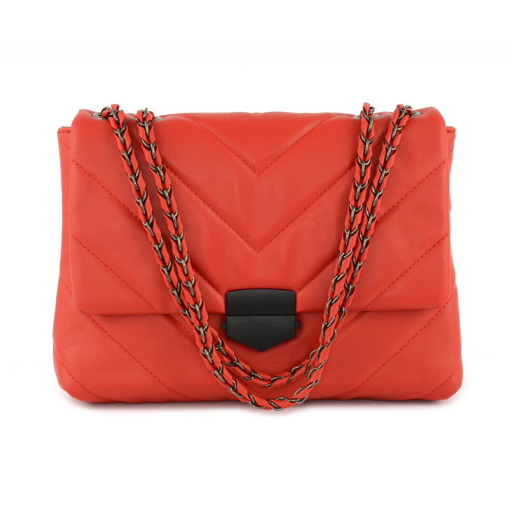 Bold yet refined, this quilted shoulder bag showcases a sharp chevron pattern with a dual chain strap. Its soft finish and flap closure strike the right balance between modern edge and practicality.