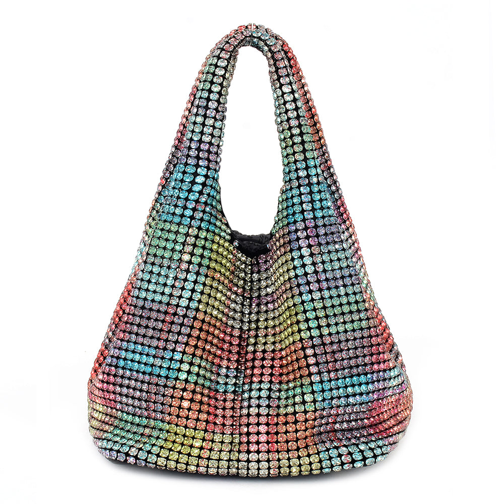 Add sparkle to your ensemble with this fully embellished crystal bag. Its vibrant multicolor rhinestones create a striking visual appeal, perfect for special occasions. The soft hobo structure ensures comfort with elegance.